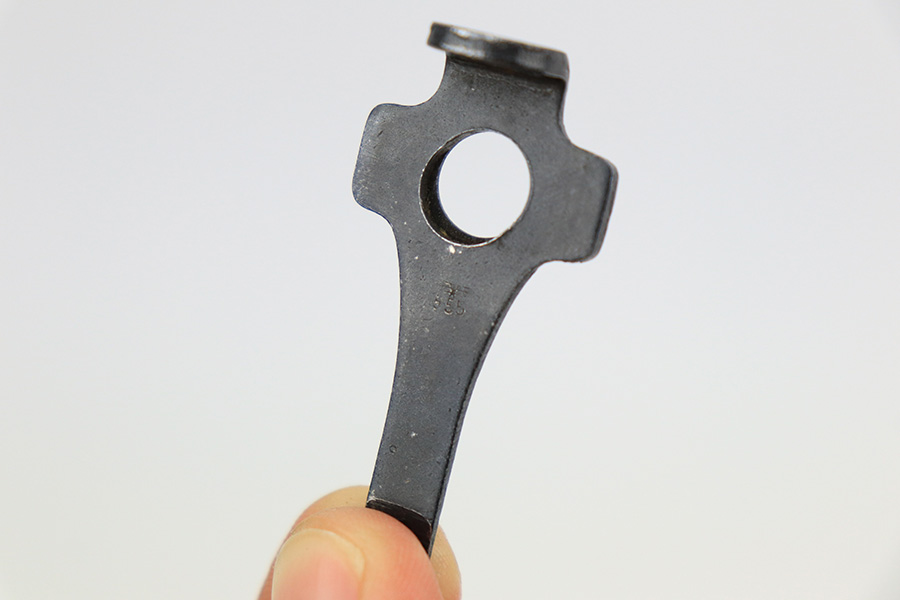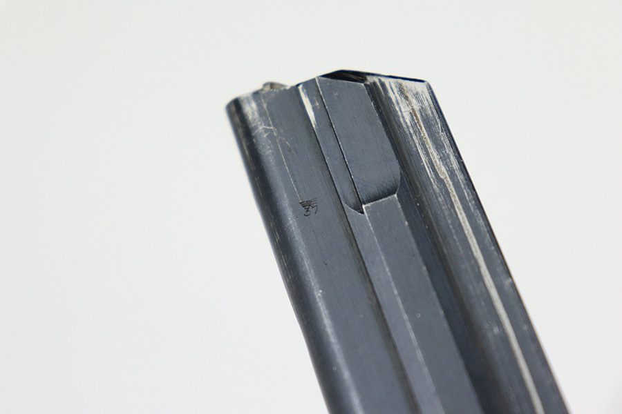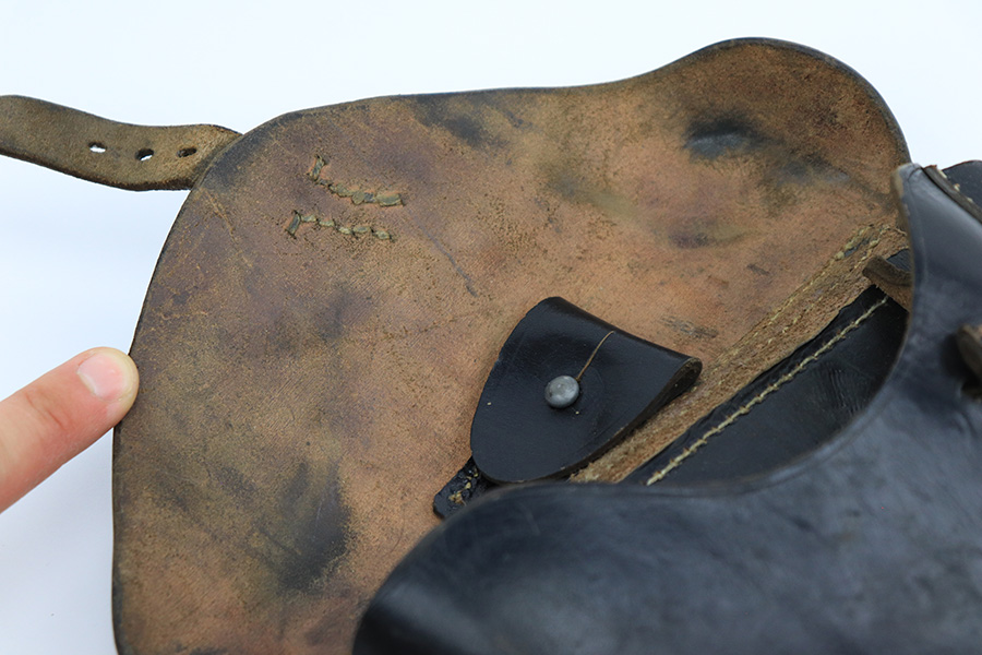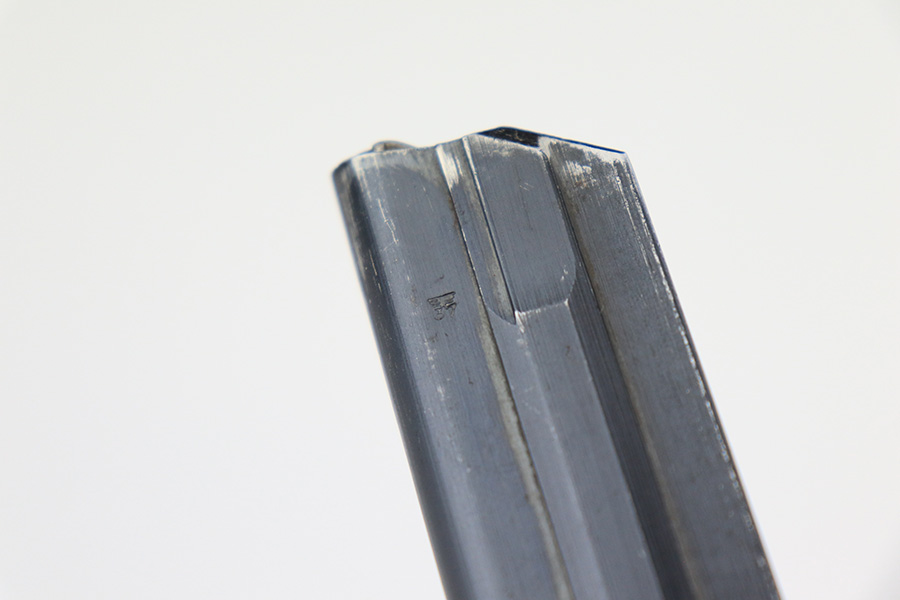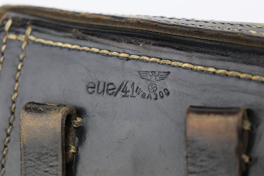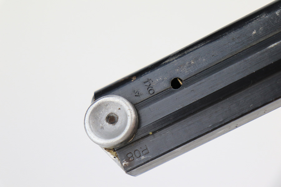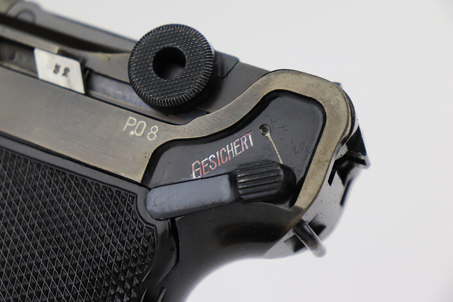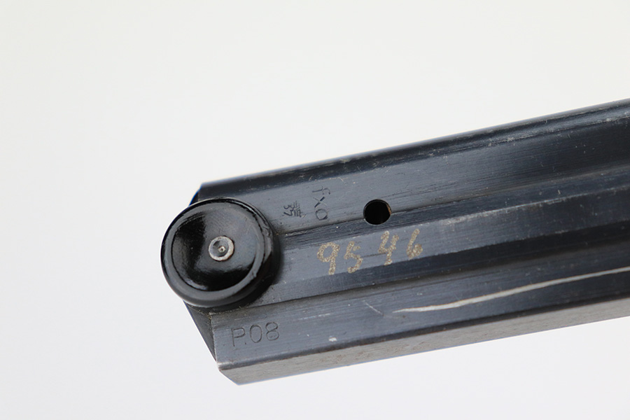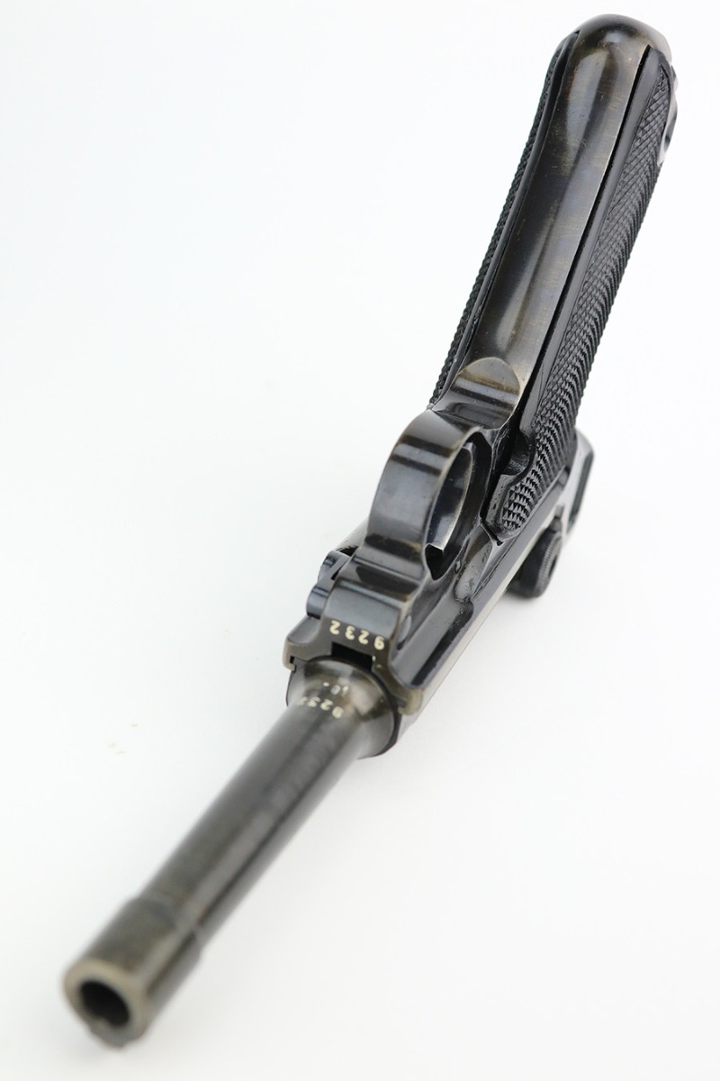 5/26/23 – This is a desirable Luger variation – the 1941/42 Mauser Luger. Only about 7,000 made, making them even rarer than the K date Luger. This one is all matching, has the proper “Eagle 655” Nazi military proofs. It is fitted with a set of high quality reproduction “Black Widow” grips and comes as a rig with a very nice 1941-dated holster, an “Eagle 655” tool, one original “Black Widow” magazine, and one un-numbered aluminum bottom magazine. The gun itself has retained roughly 60% of its finish. Much of the gun appears to have been touched up with cold blue. In any case, there is obvious finish loss and discoloration along both sides of the slide and frame. Minty bore. The hold-open does not work properly when the black widow mag is inside the gun – works fine with the other magazine.