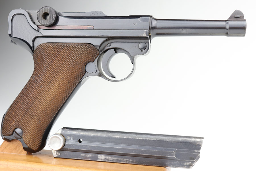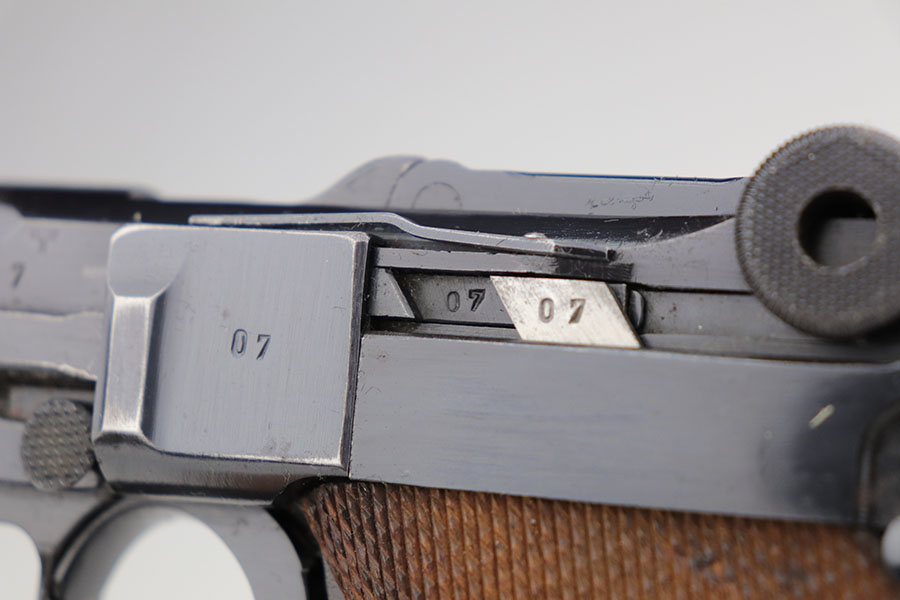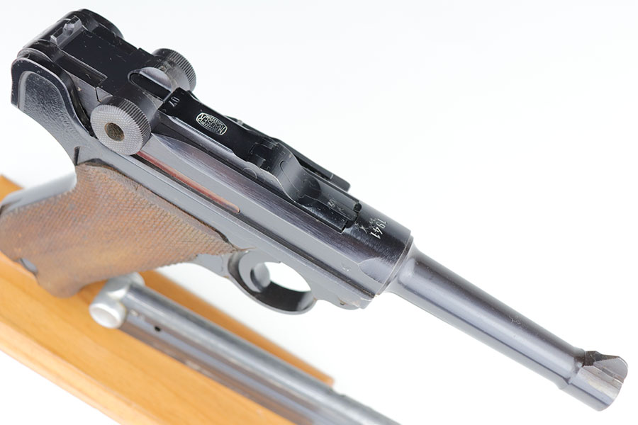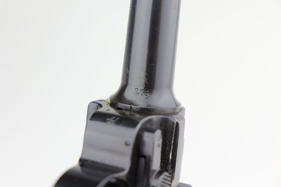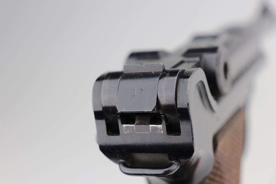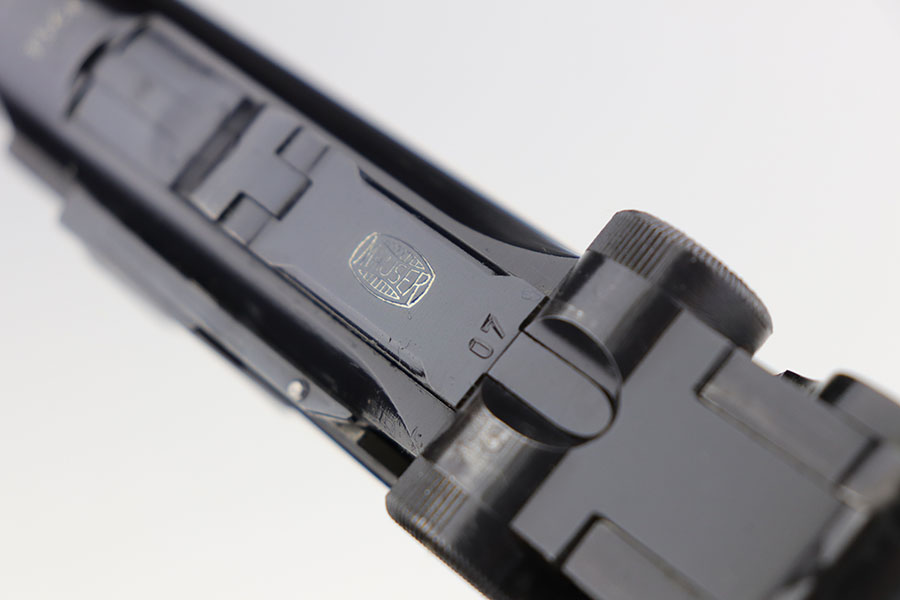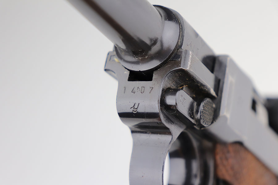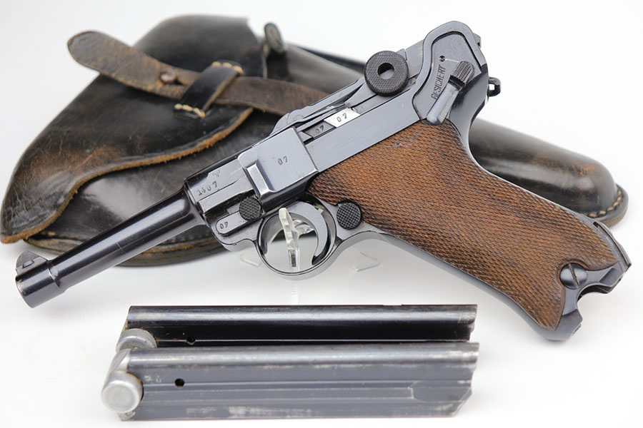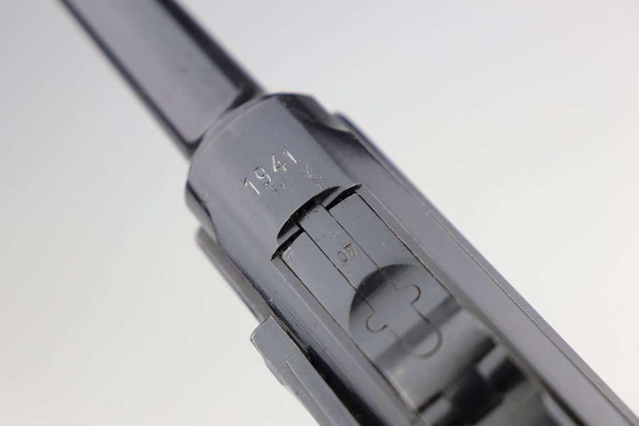 1/22/21 – This is an excellent and complete Police Mauser Luger rig from 1941, with one of the original, matching magazines. It’s one of 6,000 produced with 1941 chamber date and Eagle/L police marking on recevier. The pistol is all matching, including the grips. Excellent original blue that rates at 97-98%, just a little holster wear on the muzzle and sideplate. There’s also a hint of freckling on the muzzle and left side rail. Mint bore and grips. Comes with a spare magazine from the time period, and unmarked tool. It’s completed by a 1941 dated police holster in good condition, with Otto Sindel maker mark.