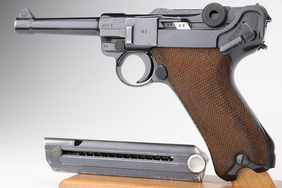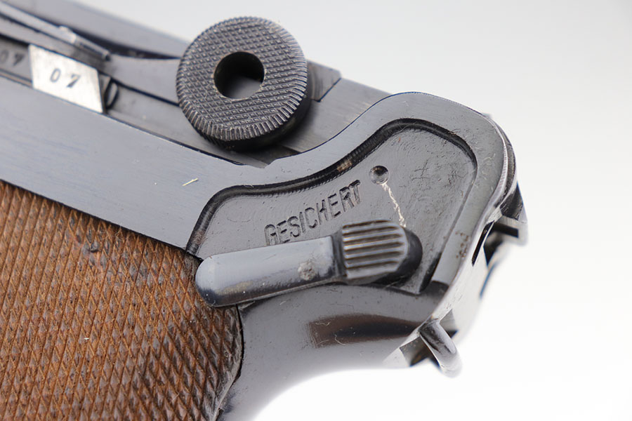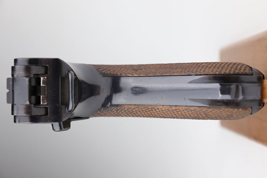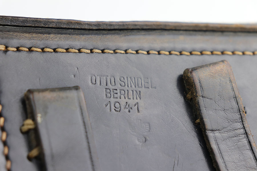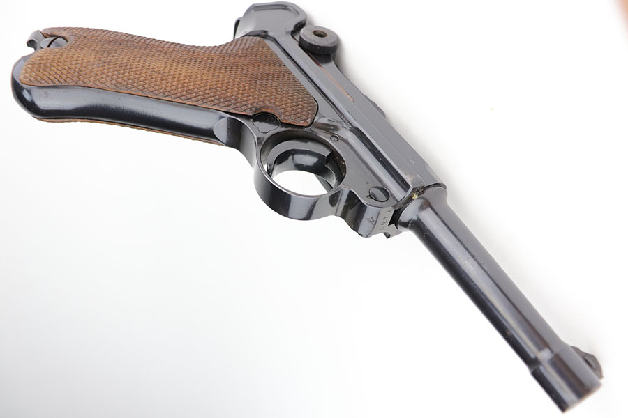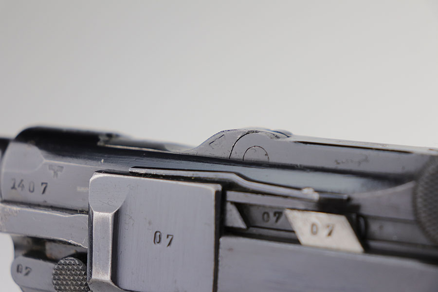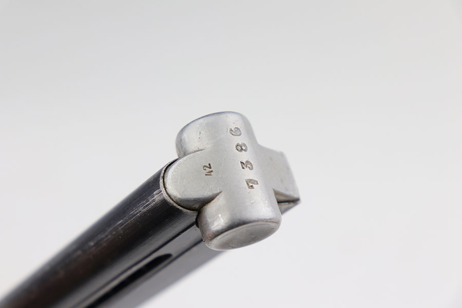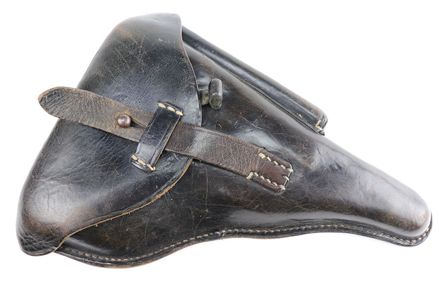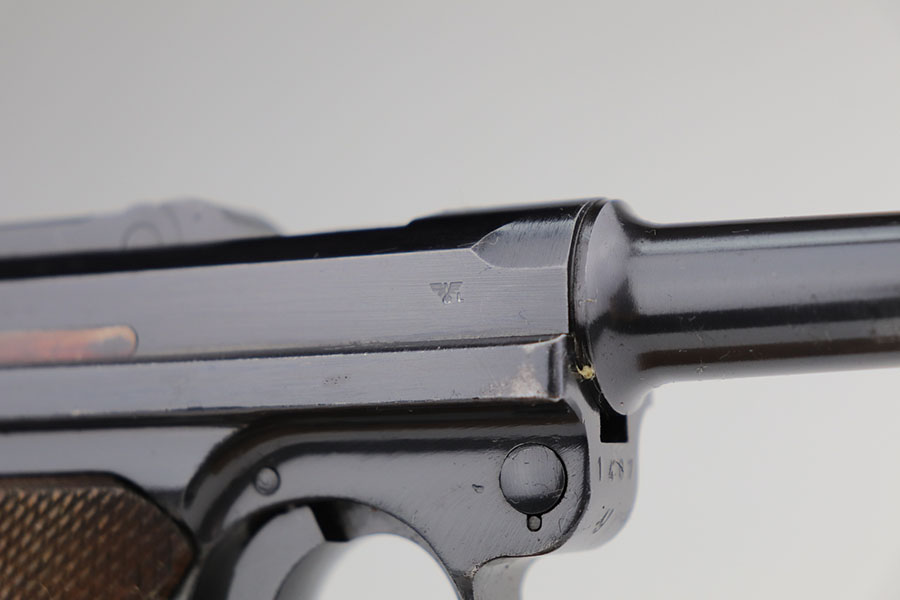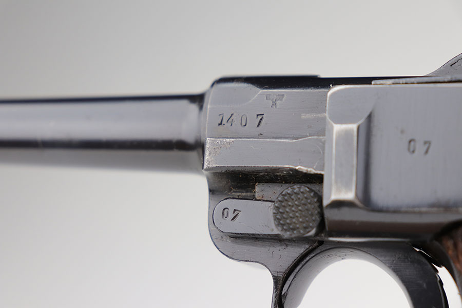 1/22/21 – This is an excellent and complete Police Mauser Luger rig from 1941, with one of the original, matching magazines. It’s one of 6,000 produced with 1941 chamber date and Eagle/L police marking on recevier. The pistol is all matching, including the grips. Excellent original blue that rates at 97-98%, just a little holster wear on the muzzle and sideplate. There’s also a hint of freckling on the muzzle and left side rail. Mint bore and grips. Comes with a spare magazine from the time period, and unmarked tool. It’s completed by a 1941 dated police holster in good condition, with Otto Sindel maker mark.