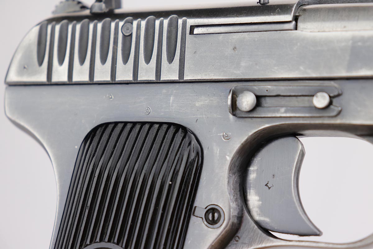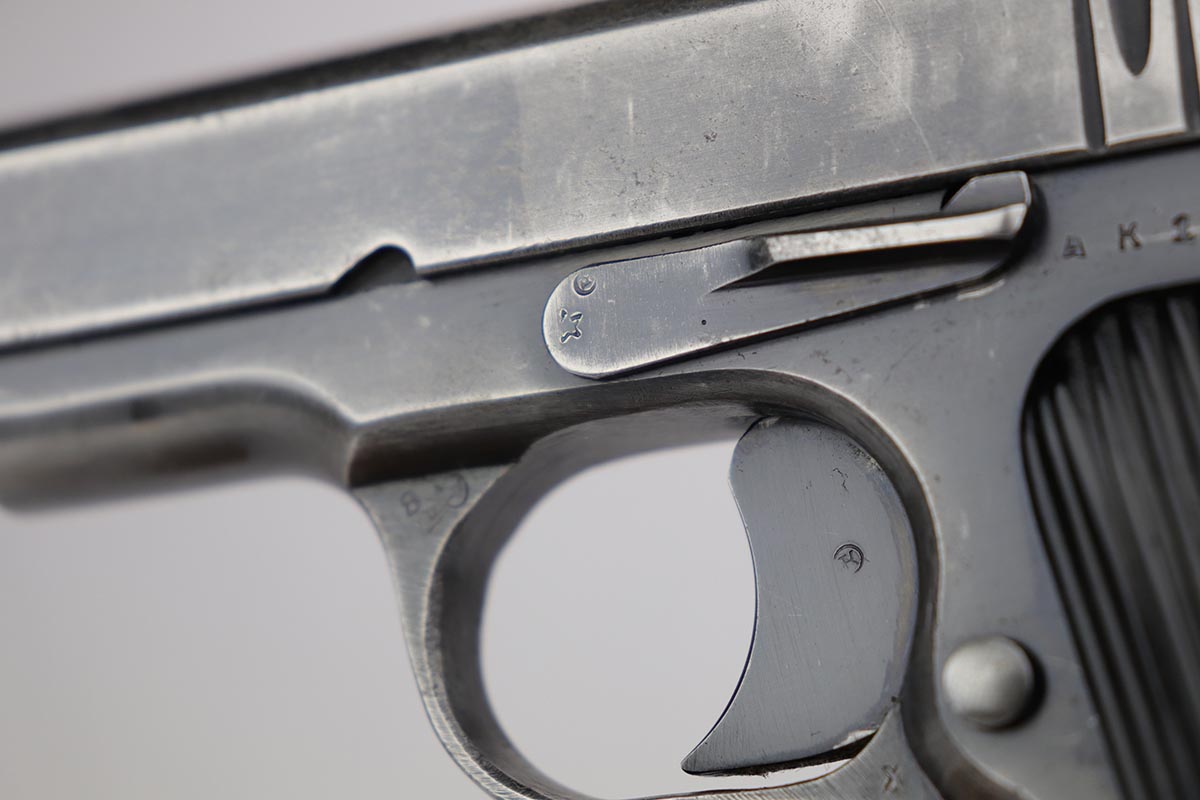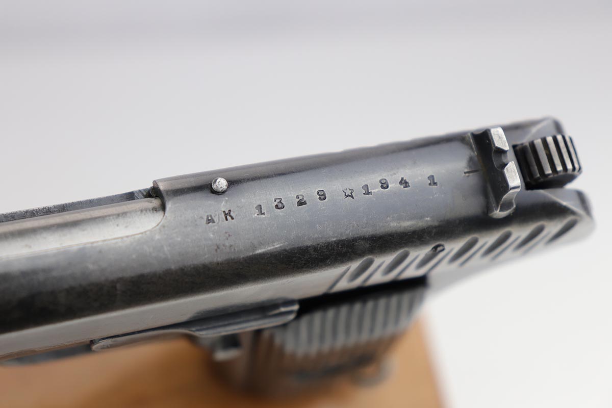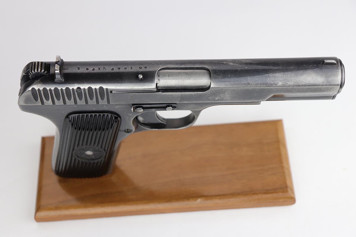 9/27/19 – This is a hard-to-find Tokarev TT-33 that was manufactured in 1941 and still has one of its original, matching magazines! The pistol is all matching and original, including the barrel, frame, mag and slide. The bluing is original but has notable thinning throughout, though the wear is uniformly patterned and there is no corrosion. Minty bore and grips.