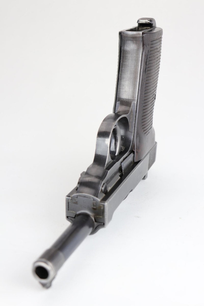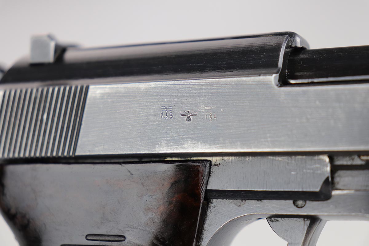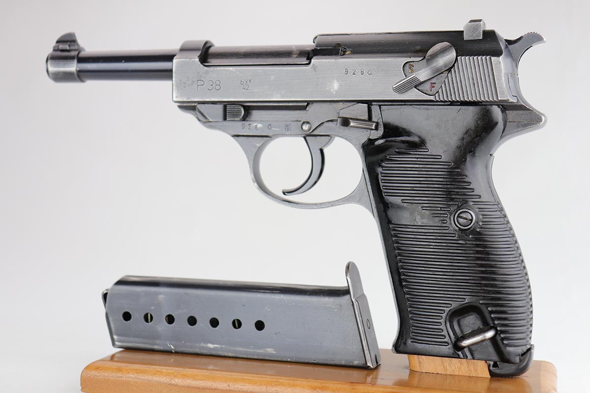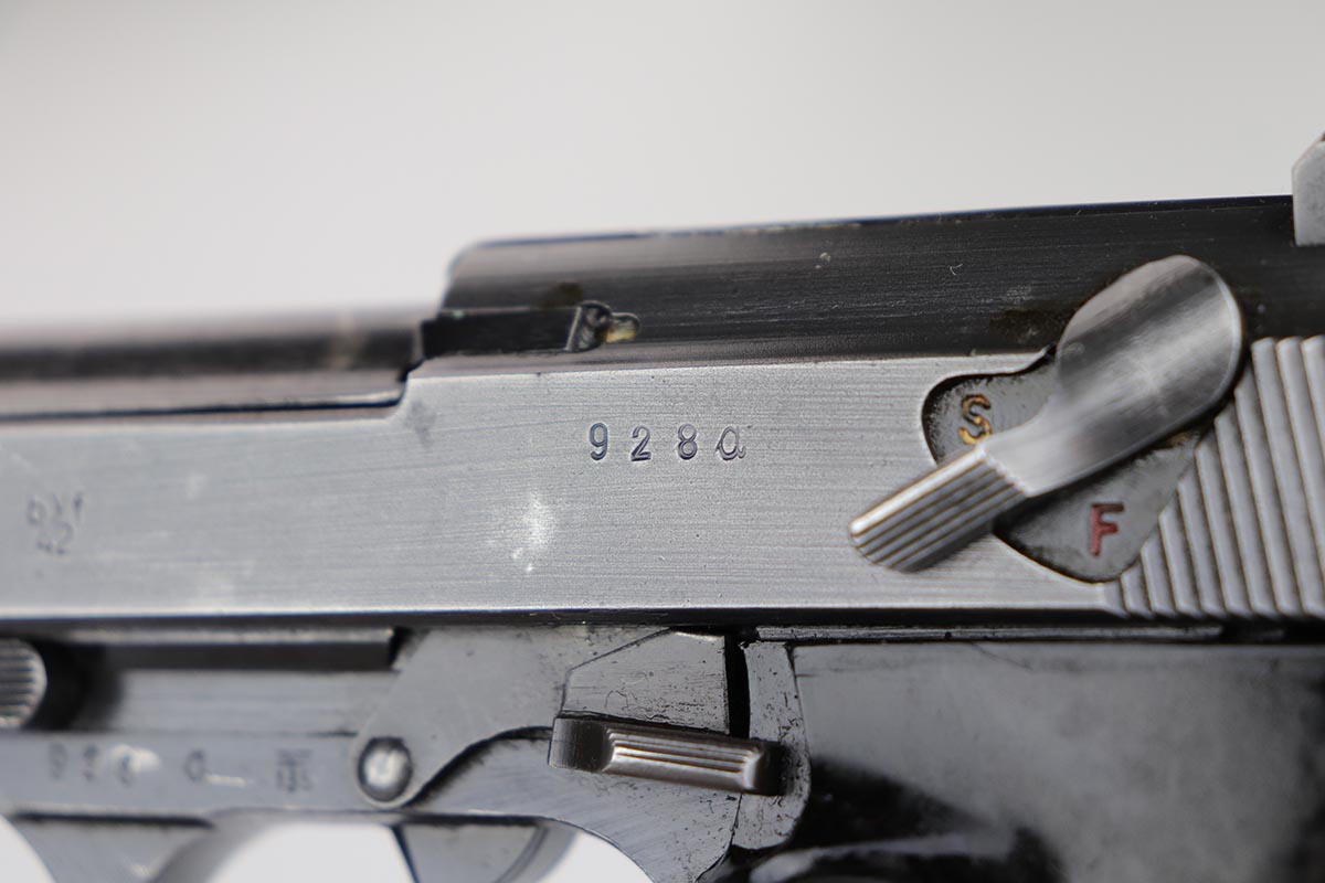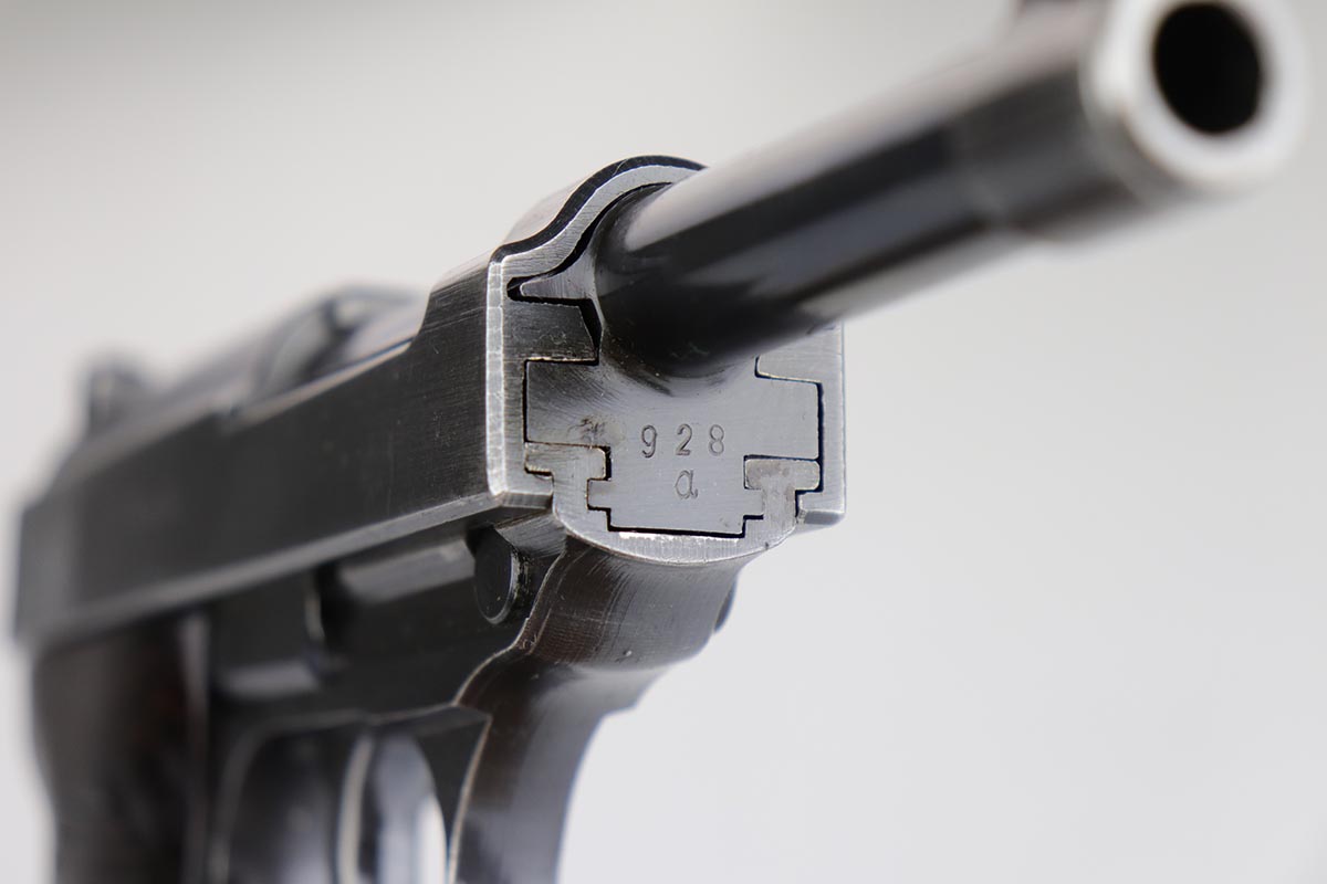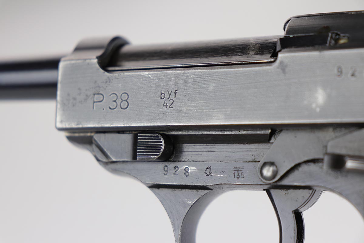 2/27/20 – This is a nice example of a rare Mauser P.38, made in 1942, the first year of production. There were fewer than 20,000 of this variation produced, which is a very low production total for any wartime P.38 variation. This particular gun is all matching with 85-90% of the original, dust blue finish remaining. There is minor finish loss on the edges of the slide, muzzle, and firing pin cover. There is also some thinning/browning on the front strap. Minty bore. Mechanics are correct but the action is a little stiff. Likely just needs a good cleaning/oiling. Excellent grips, and a Mauser mag.