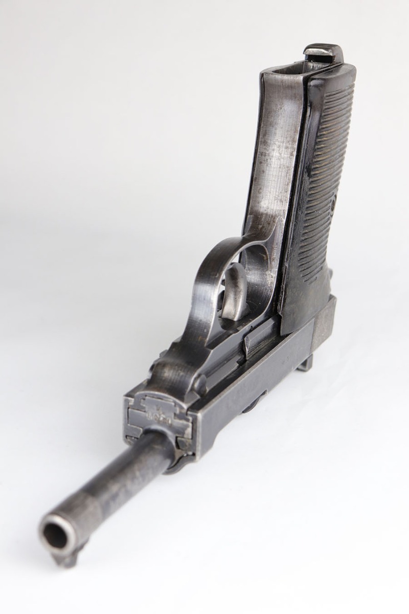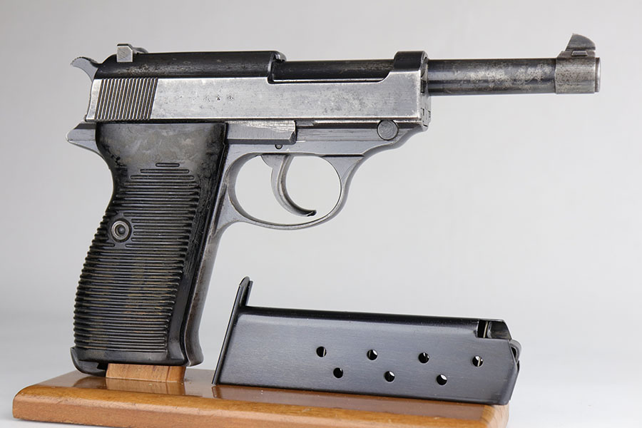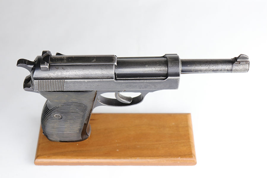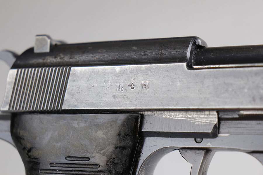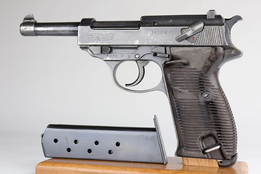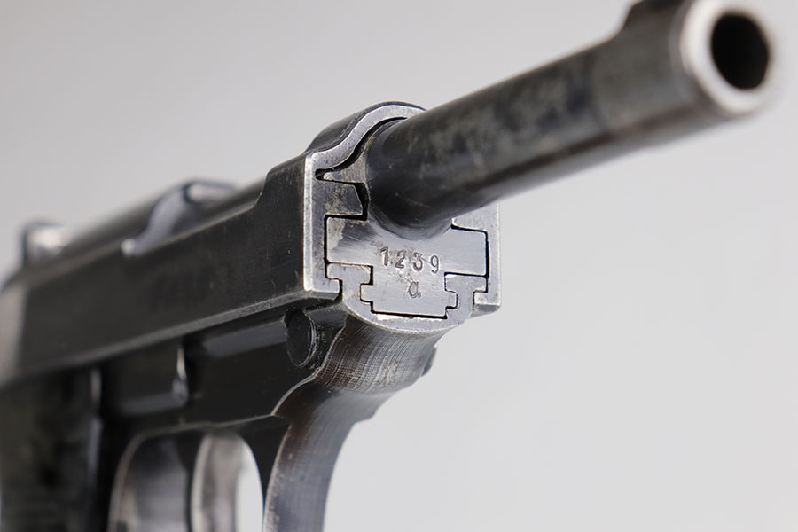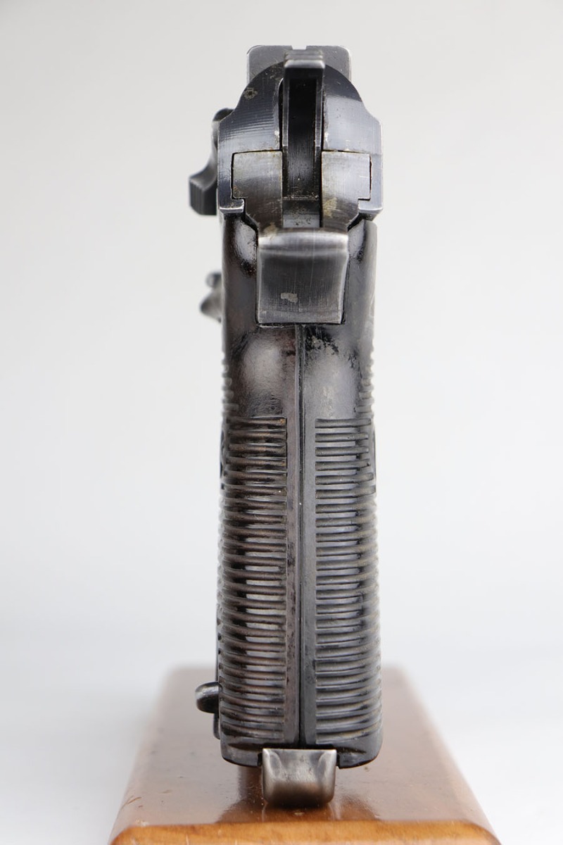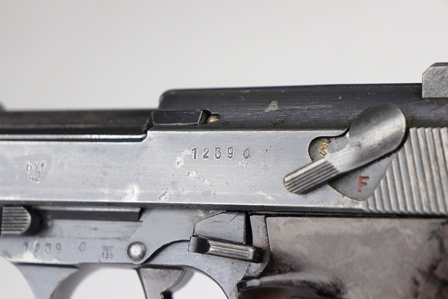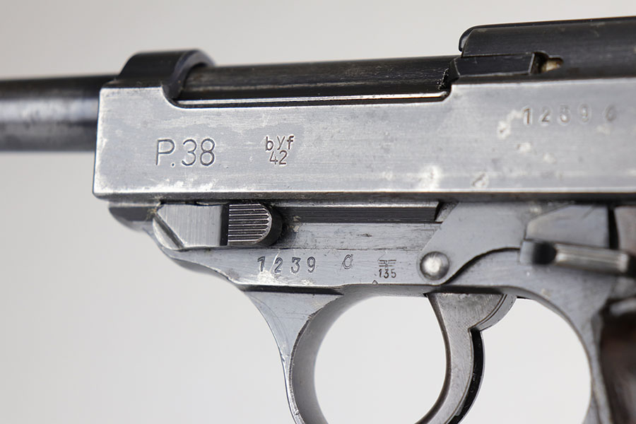 5/5/20 – This is a decent example of a rare Mauser P.38, made in 1942, the first year of production. There were fewer than 20,000 of this variation produced, which is a very low production total for any wartime P.38 variation. This particular gun is all matching with 60-70% of the original dust blue finish remaining. There is thinning on all major surfaces with various spots of minor discoloration or oxidation. Good mechanics, including de-cocker. Strong bore. Excellent grips. The pistol comes with the postwar magazine that’s in the photos, as well as an original ‘jvd’ marked magazine.