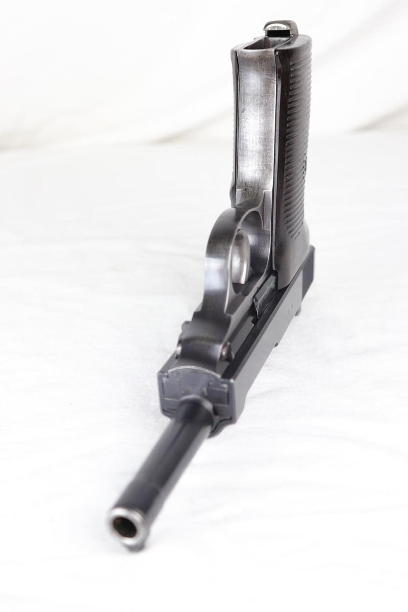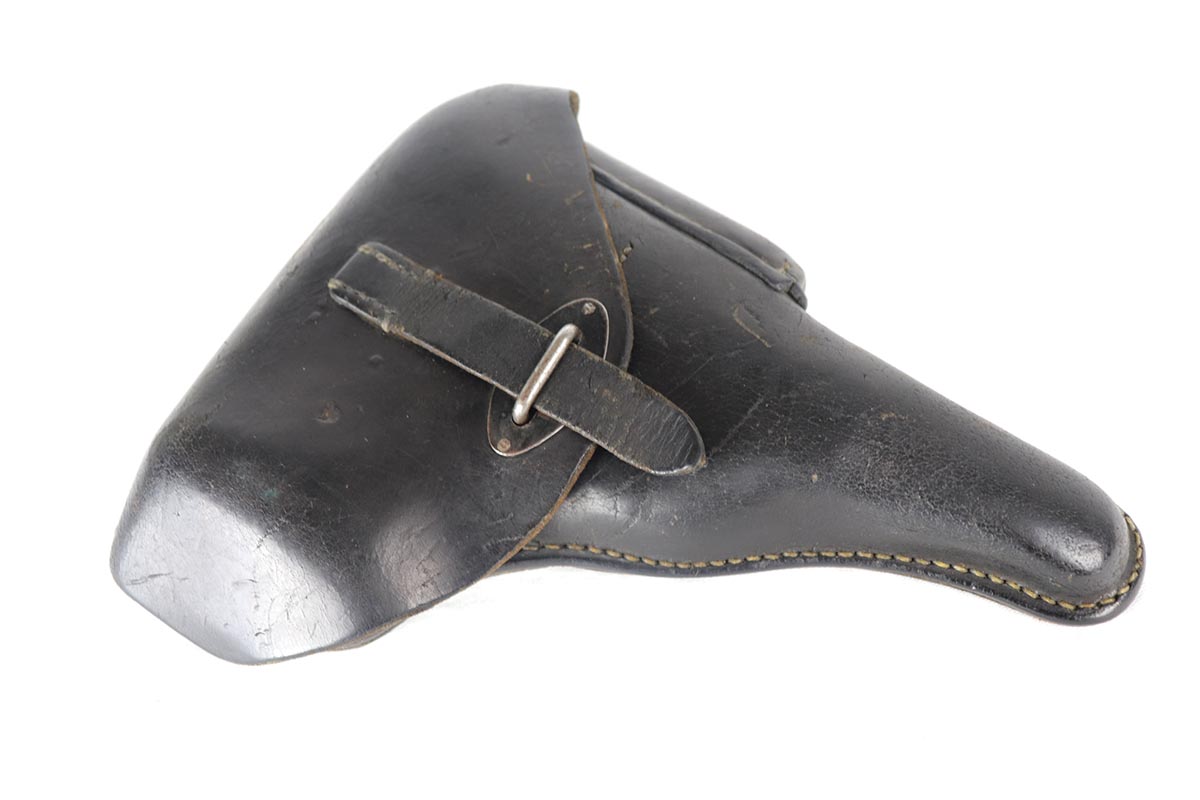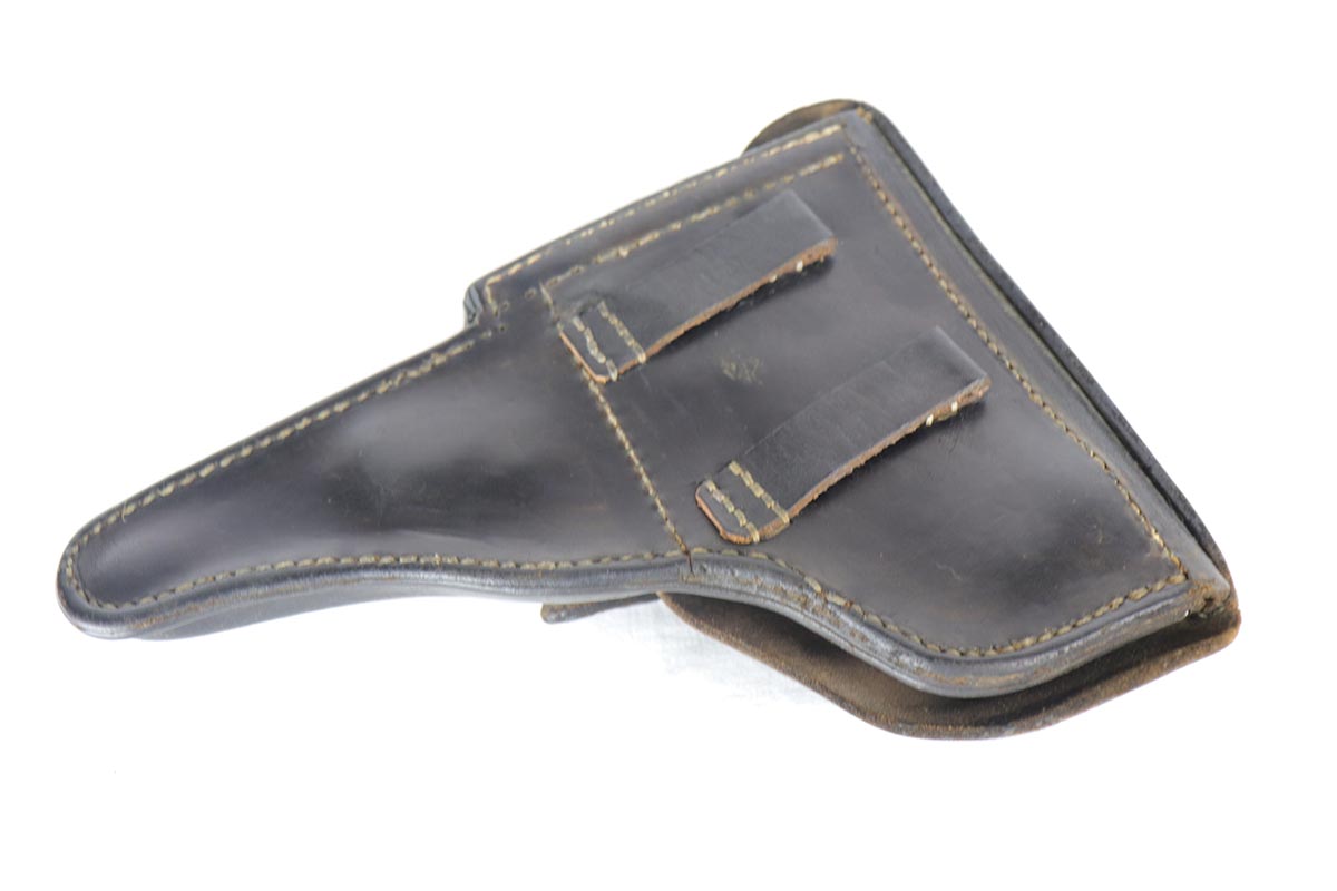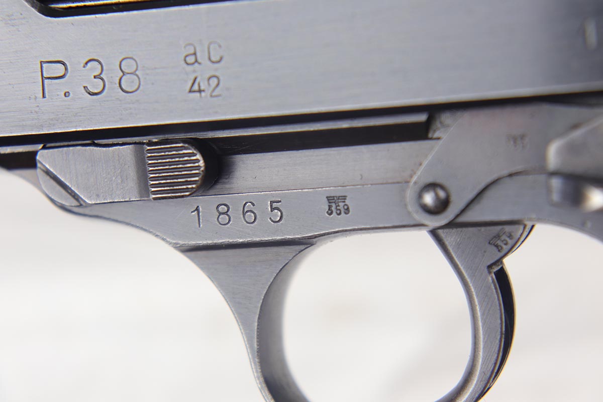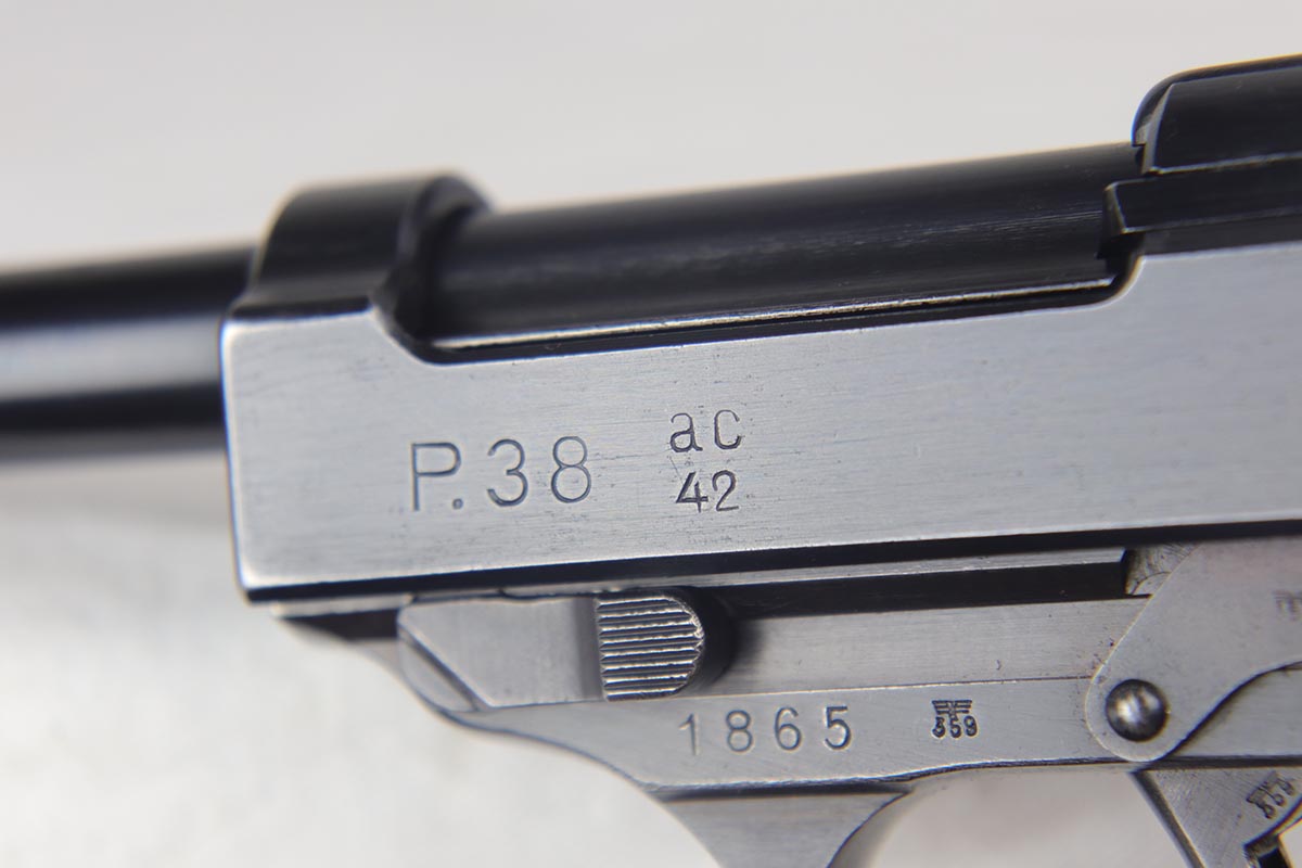 7/19/18 – This is a scarce, complete Walther P.38 rig from 1942, with both original matching magazines! Nazi era P.38 rigs with both matching magazines are getting harder and harder to find, but here we have a very nice ‘ac 42’ with 1942 dated hardshell holster. The pistol has 90+% original blue remaining with a beautiful profile view but a thin front strap. The magazines are correct and original to the gun. The holster waffen and maker marked, with full 1942 date. Pistol has full functionality, including de-cocker. Bore is in good condition but does have some frosting/freckling in grooves.