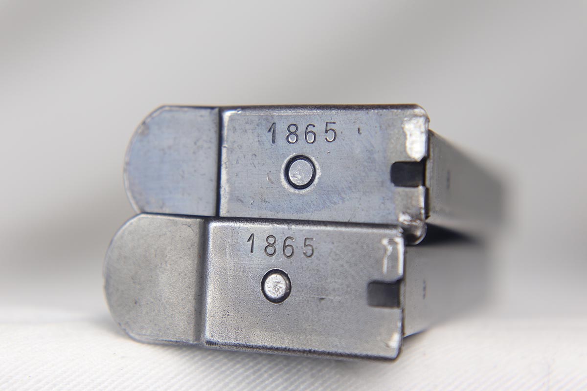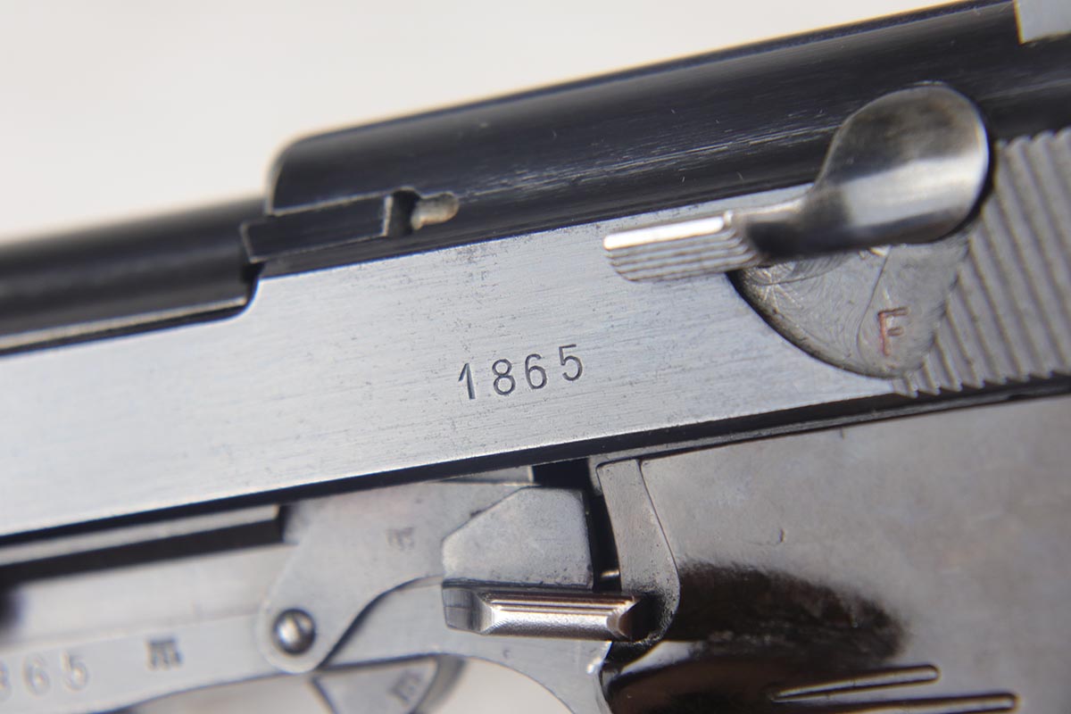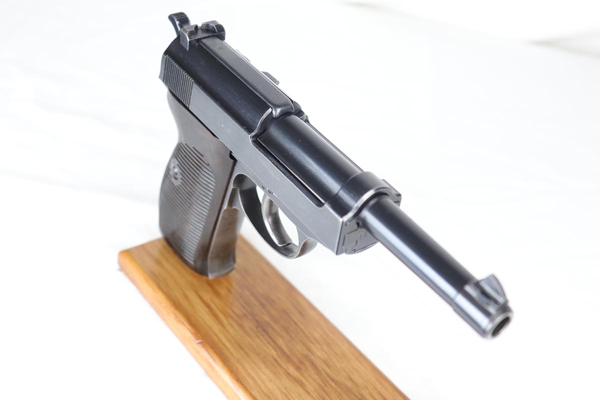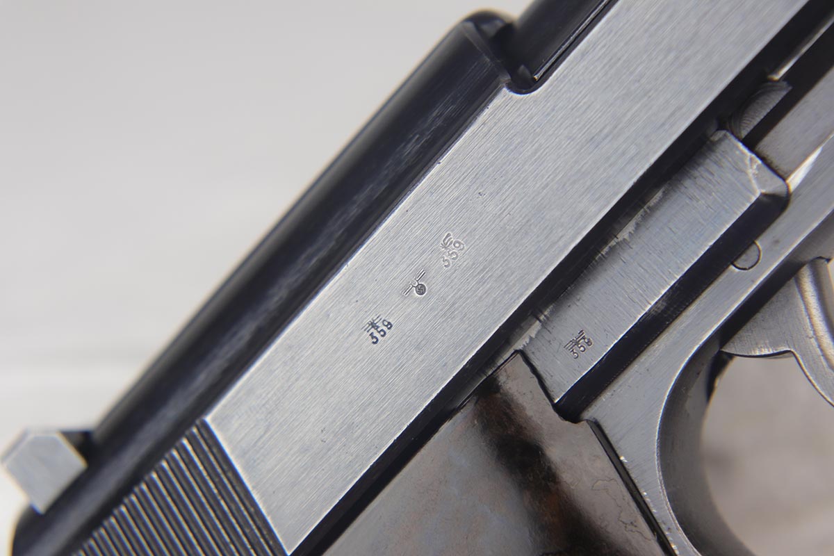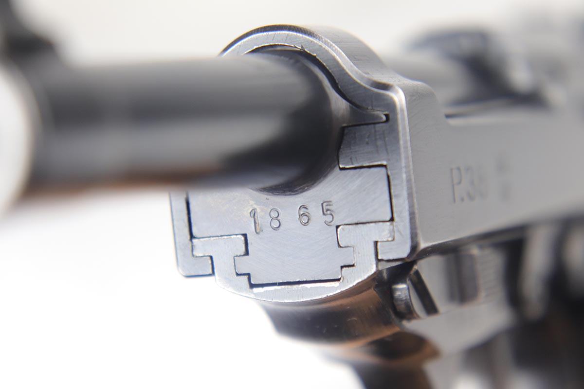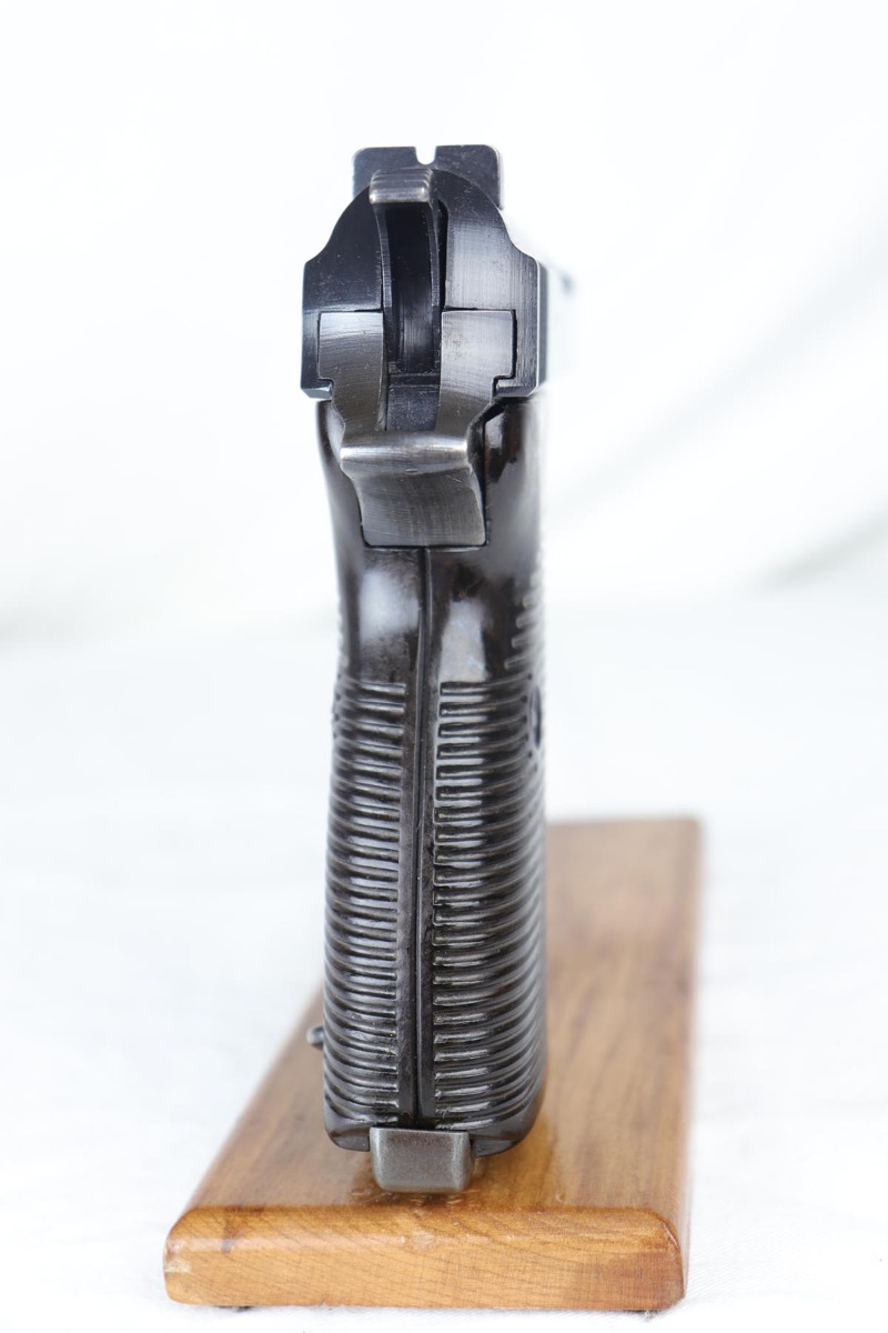 7/19/18 – This is a scarce, complete Walther P.38 rig from 1942, with both original matching magazines! Nazi era P.38 rigs with both matching magazines are getting harder and harder to find, but here we have a very nice ‘ac 42’ with 1942 dated hardshell holster. The pistol has 90+% original blue remaining with a beautiful profile view but a thin front strap. The magazines are correct and original to the gun. The holster waffen and maker marked, with full 1942 date. Pistol has full functionality, including de-cocker. Bore is in good condition but does have some frosting/freckling in grooves.