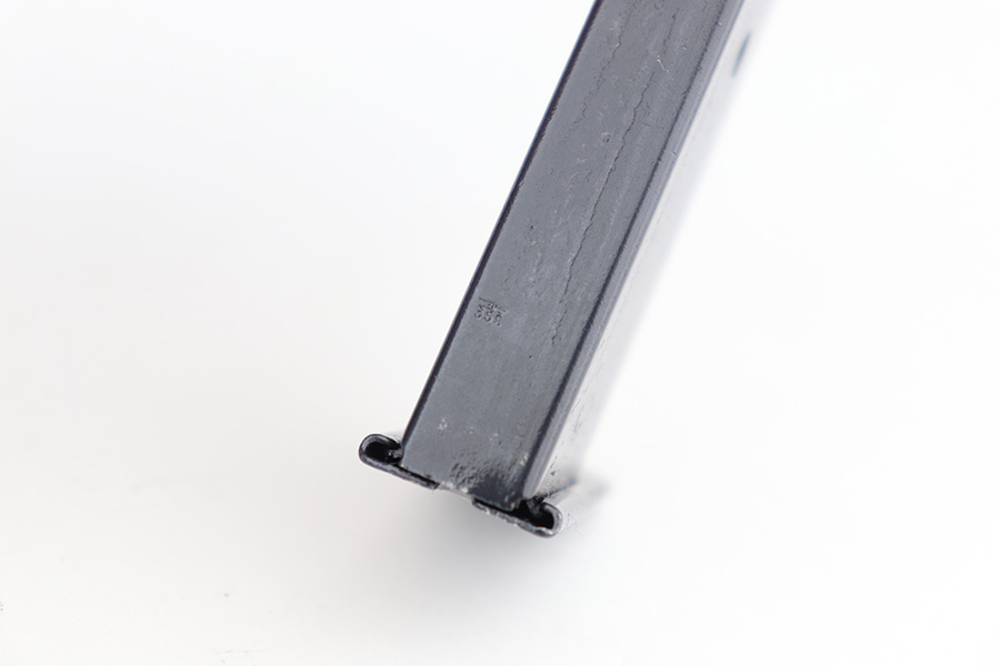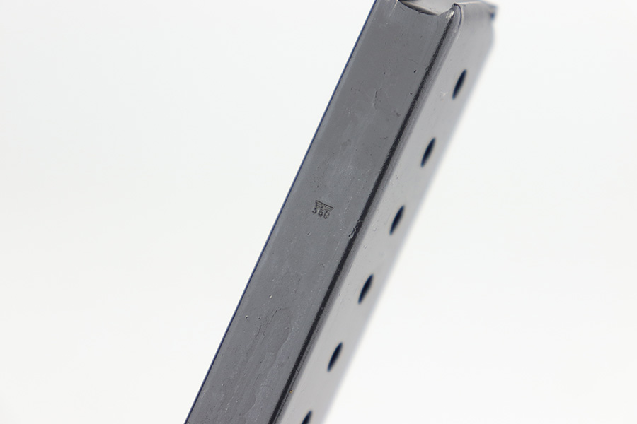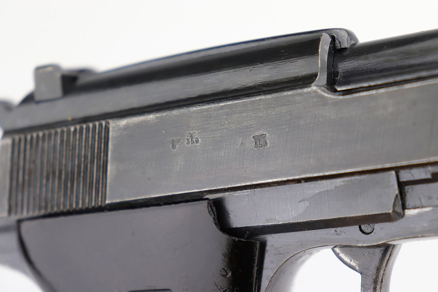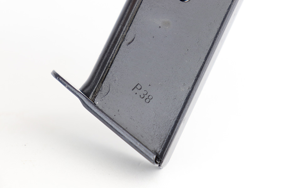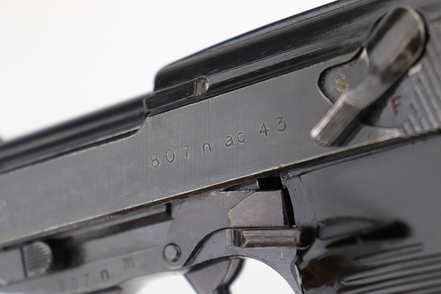 1/6/23 – This is a nice example of a matching and original Walther P.38 from December of 1943. It’s a scarce variation with ‘ac 43’ marking in a single line on the slide, only found in the ‘n’ and ‘m’ serial blocks, one of about 18,000 made. The finish on this one is difficult to rate as there isn’t much actual bluing loss, but some patina throughout. Strong, shiny bore. Original black grips but the right panel has a chip in it. De-cocker doesn’t function, but safety does. Scarce Walther mag with two spine proofs.