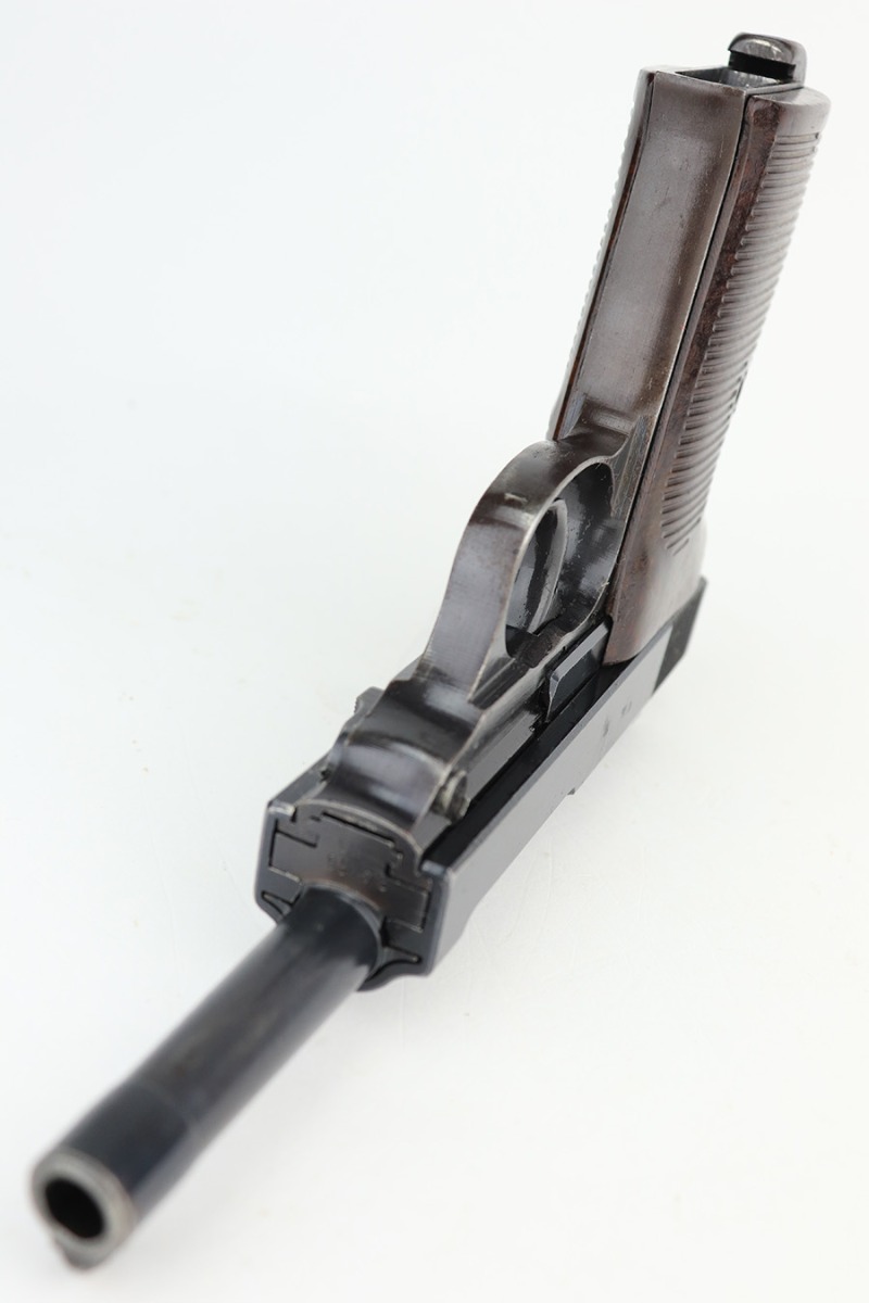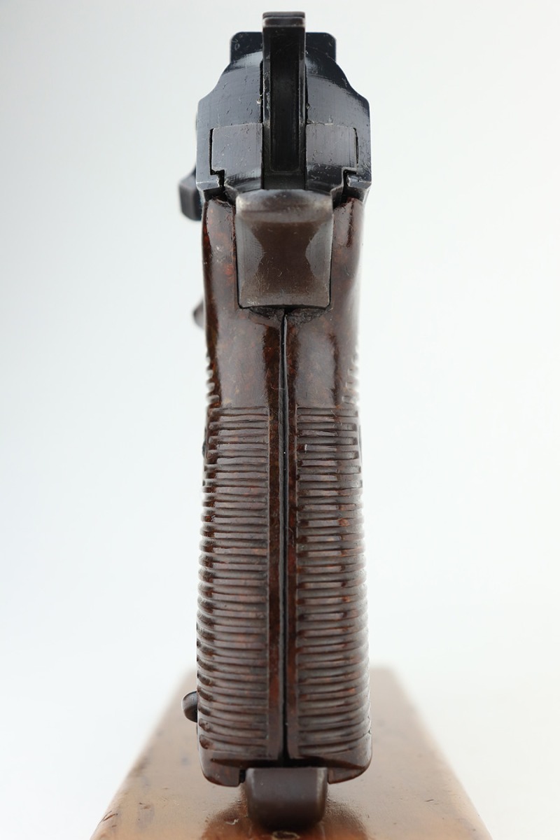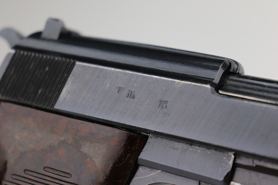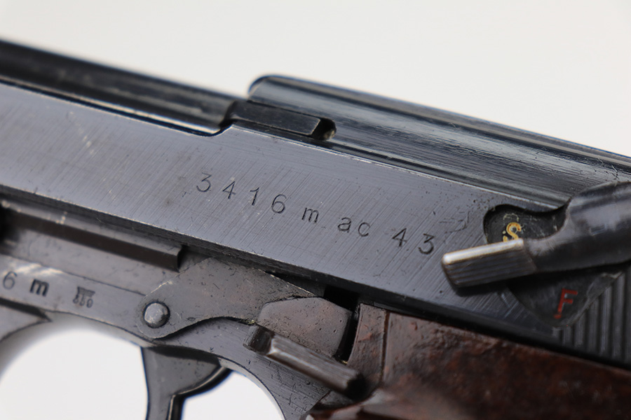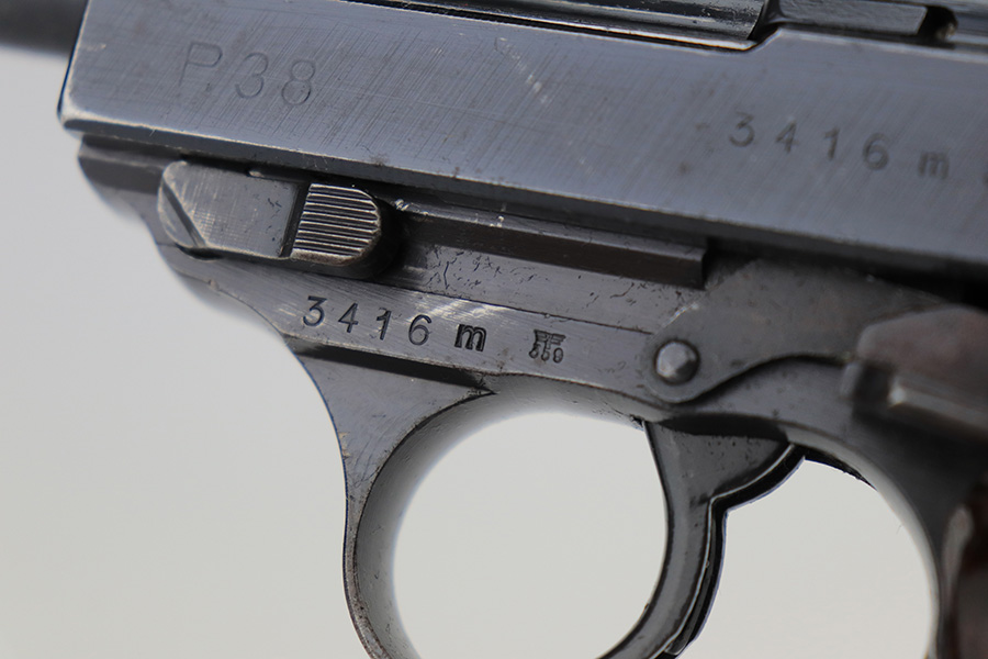 3/29/23 – This is an excellent example of a matching and original Walther P.38 1943. It’s a scarce variation with ‘ac 43’ marking in a single line on the slide, only found in the ‘n’ and ‘m’ serial blocks, one of about 18,000 made. This one has retained about 97% of its original finish with very minor wear around the muzzle and the high edges of the slide. Very light brown patina on the front strap. Fitted with excellent reddish-brown bakelite grips. Comes with an “Eagle 135” marked Mauser magazine. The bore is shiny with strong rifling, but unfortunately there is a minor bulge in the barrel around the muzzle end. De-cocker is functional.