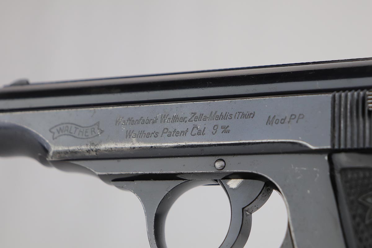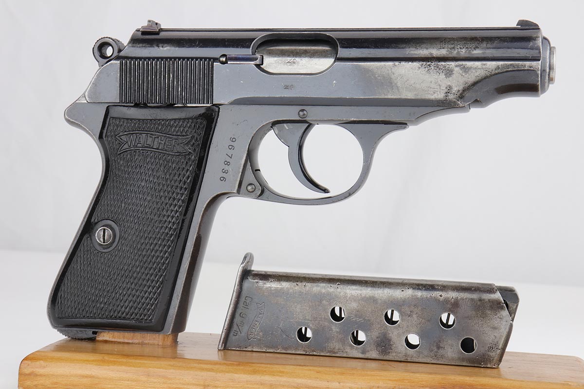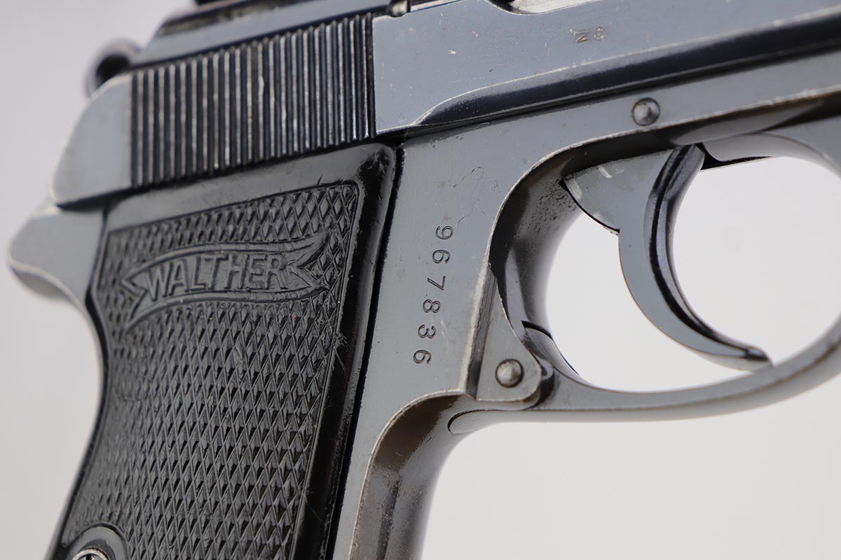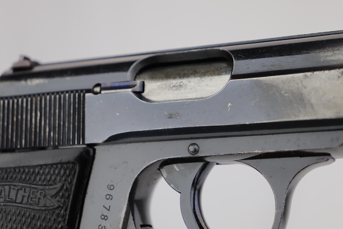 8/26/19 – This is a scarce, original Walther PP from the Nazi era, chambered for 9mm kurz. Original high-polish blue rates at about 80%, with browning and thinning of the straps, and a notable area of finish loss and freckling on the right side of the slide. Excellent bore. Nice, original grips without major defect. Correct magazine.