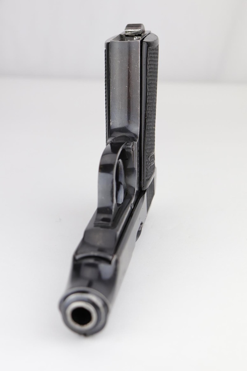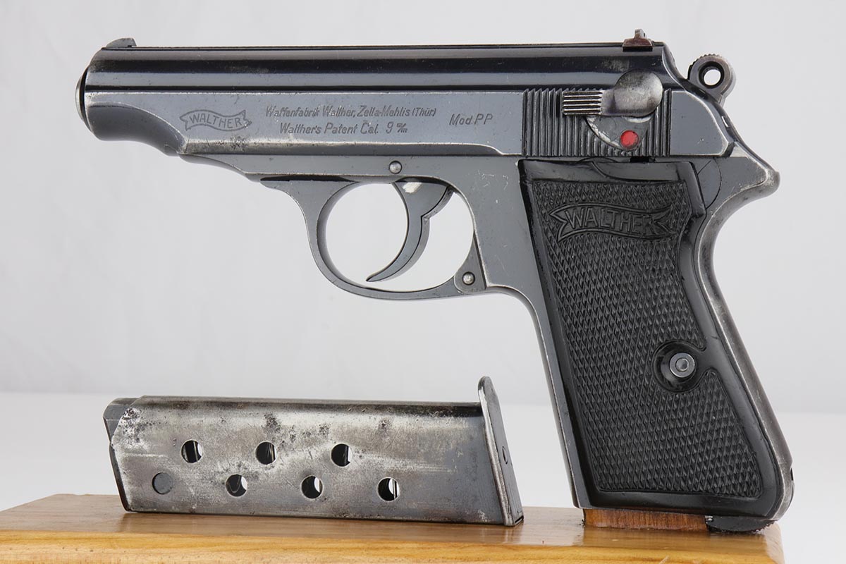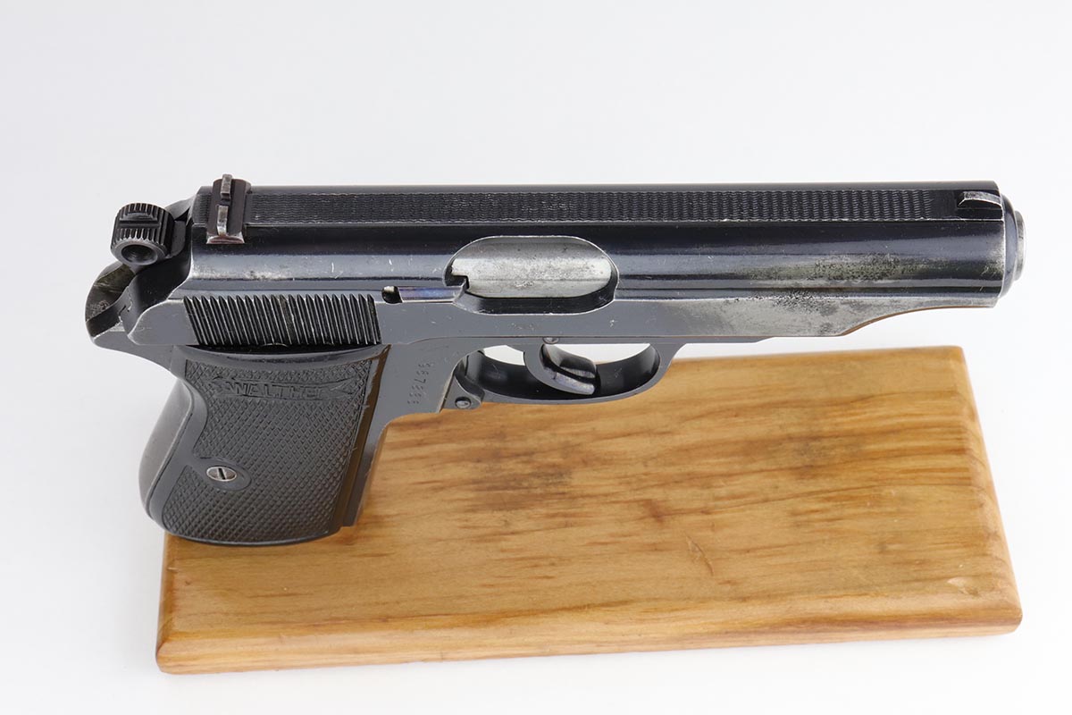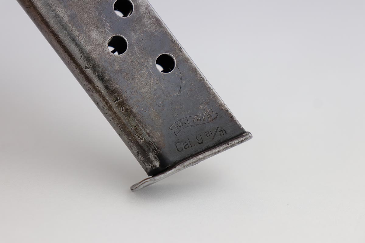 8/26/19 – This is a scarce, original Walther PP from the Nazi era, chambered for 9mm kurz. Original high-polish blue rates at about 80%, with browning and thinning of the straps, and a notable area of finish loss and freckling on the right side of the slide. Excellent bore. Nice, original grips without major defect. Correct magazine.