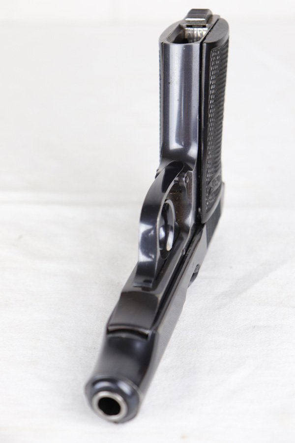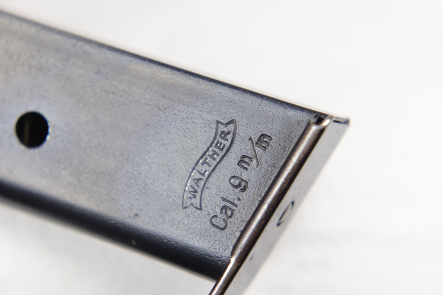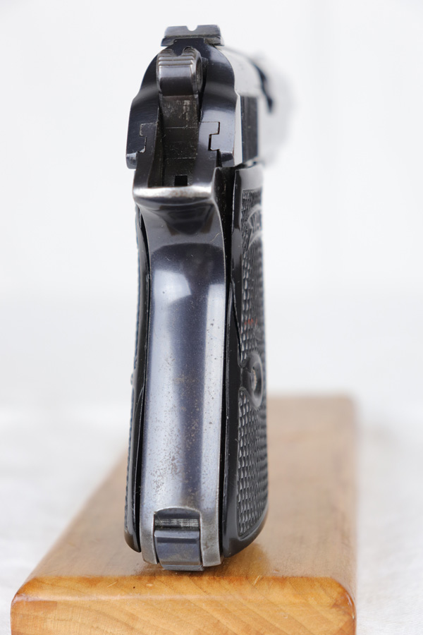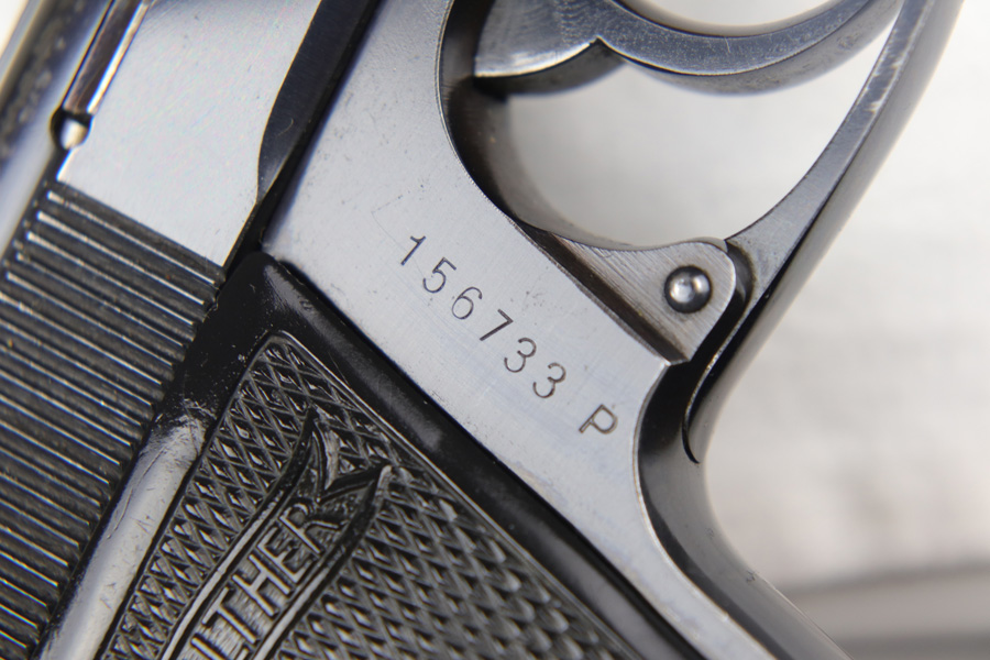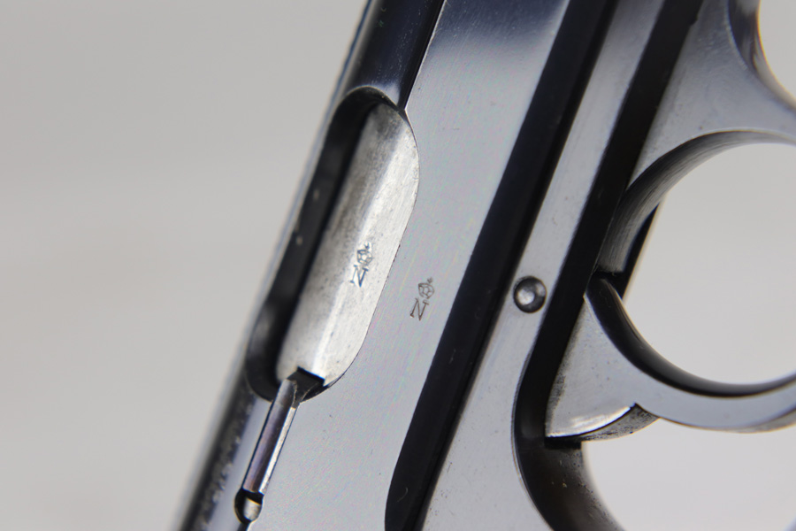 10/24/18 – This is an original Walther PP from the Nazi era, chambered in the more seldom seen 9mm. The original bluing rates at 92-93% with the majority of finish loss found along the rounded edge of the right side slide. The back strap also has some minor patina. Correct, bottom release 9mm magazine. Excellent bore. Right grip panel does have a thin crack.