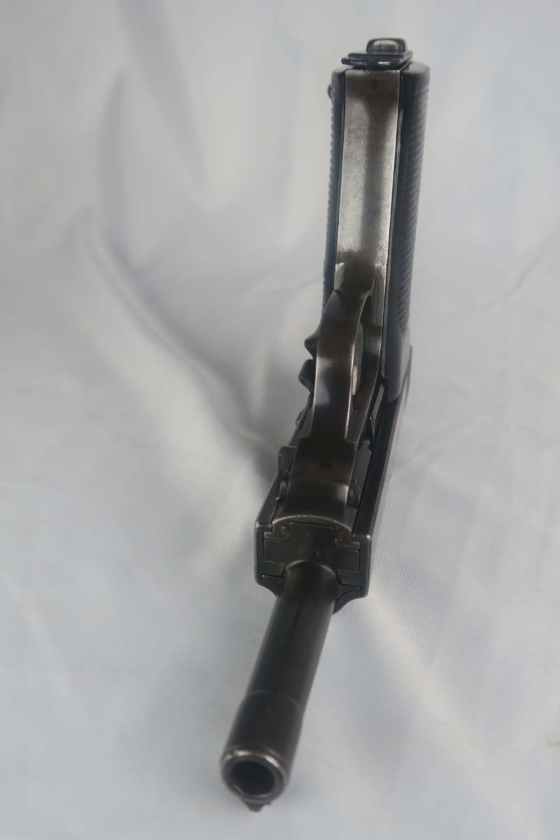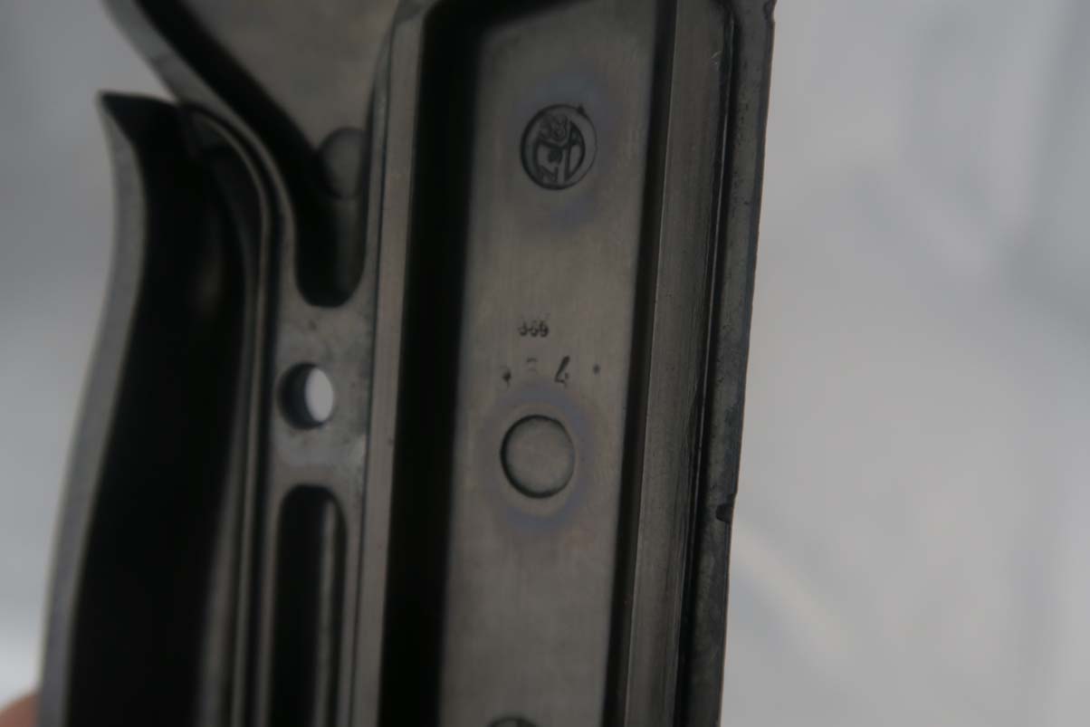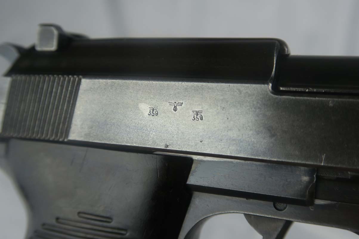 5/19/17 – This gun came from Warren Buxton’s personal collection according to James Julia auction, who sold a large number of his guns in April of this year.  It’s been a while since we’ve had an AC40. They were always hard to come by but lately they seem to have really “dried up”. There were only about 12,000 of these ac 40’s manufactured, making these more rare than the early zero series Walthers or first-year production Mauser byf 42’s.  The original finish is about 90%, with all matching parts including the grips! The magazine is numbered and close to matching – but off by less than 100 numbers.  The small parts are all correctly waffen 359 proofed. The gun is of course correct in every way.  De-cocker is functioning properly.  Mirror bore.