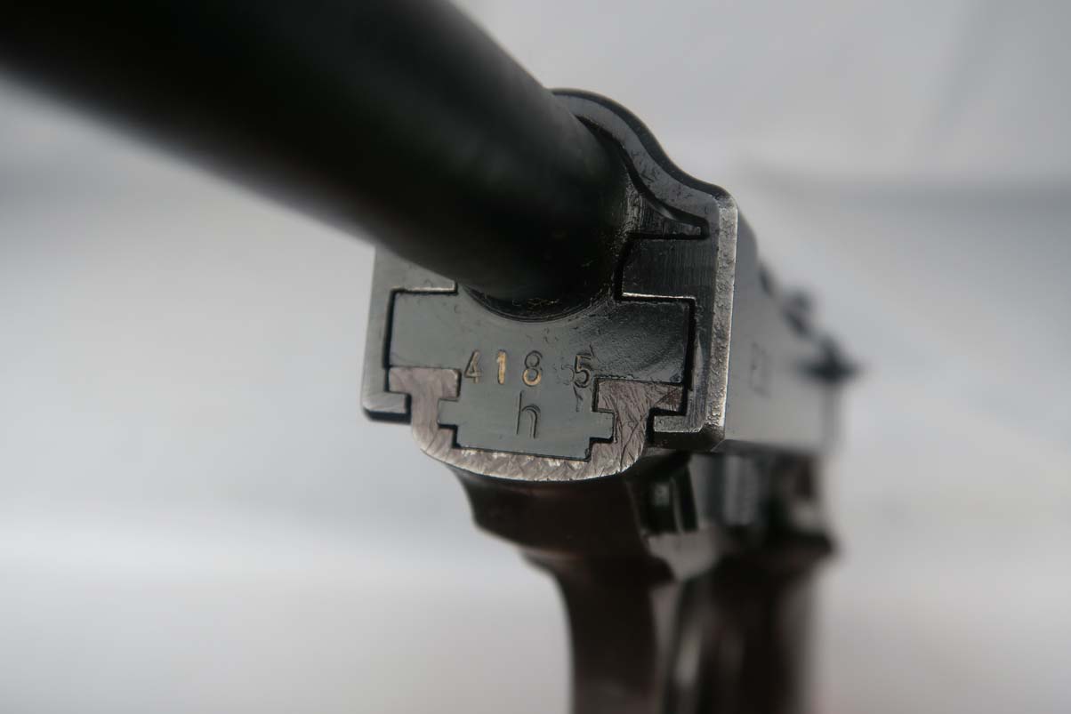 5/8/17 – This is an excellent and scarce Walther P.38 with FN manufactured frame.  The E/140 proof denotes the FN production, as well as the MI marking on the trigger guard.  The original finish rates at about 97-98%, with just minor edge wear.  The frame is a lighter plum color, and I believe the strap left the factory with this lighter/thinner finish.  It is all matching and correct, including an excellent set of reddish Walther grips, and an E/359 marked mag.  Excellent bore.