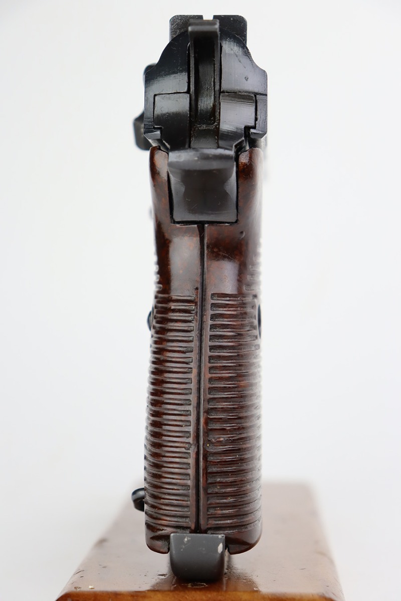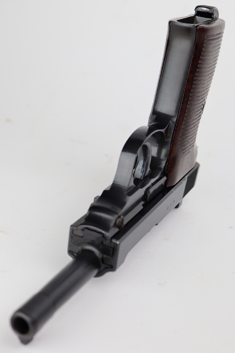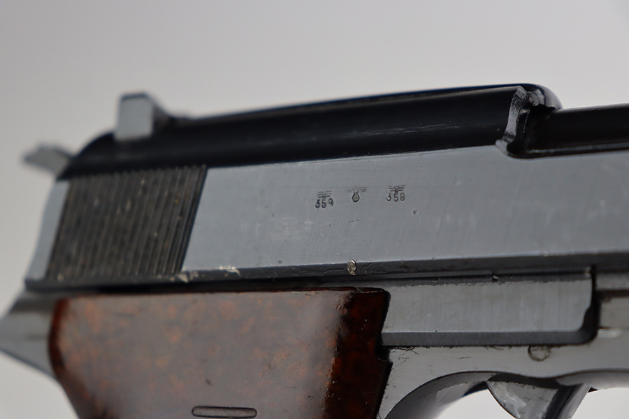 7/25/23 – This is a scarce AC 45 Walther P.38 issued to the Nazi military in 1945. What makes this one scarce is the capital “A” suffix on the frame and locking block. Only about 5,000 guns feature this oddity. It is believed that, for a short period of time in 1945, the lower case “a” die was broken or unavailable, so the Walther factory was forced to use the capital “A”. This one is all matching and has the proper “Eagle 359” military acceptance proofs throughout. It has proper late war cog-style hammer. The gun has a dark “Russian-dipped” finish. No signs of finish loss. Fitted with excellent period-correct reddish bakelite grips. Comes with a scarce late-war “U” marked Walther magazine. Excellent bore with great rifling. De-cocker is functional.