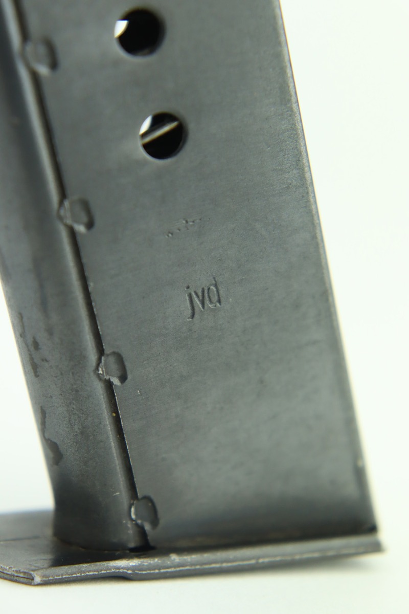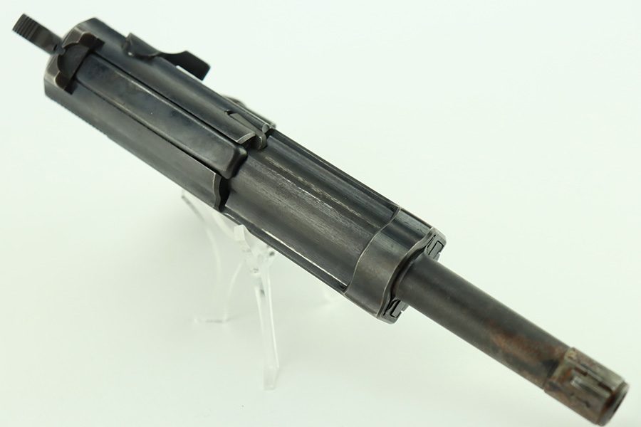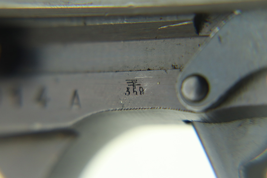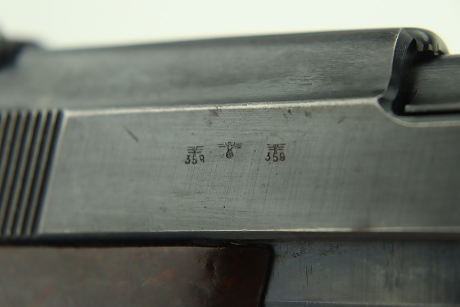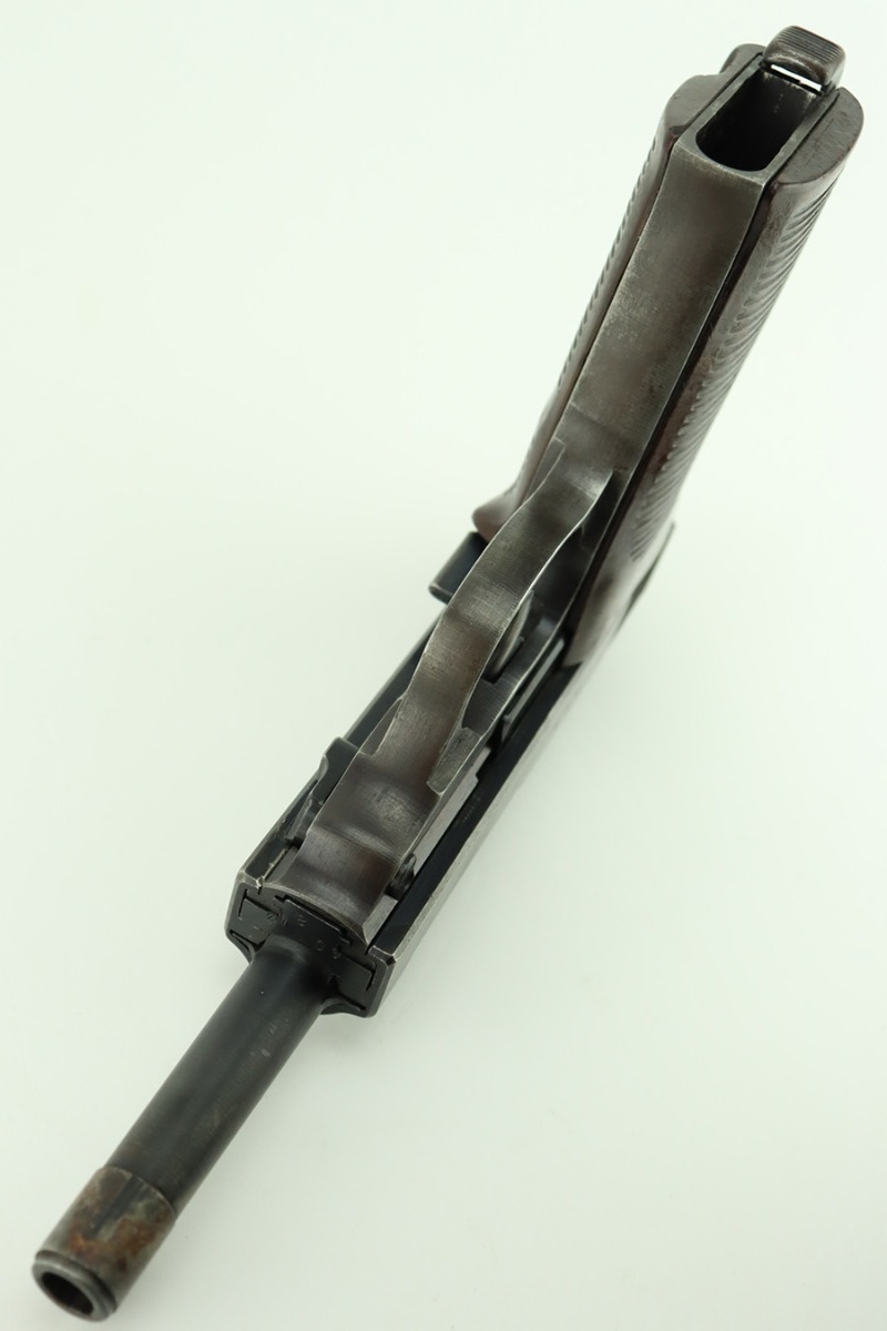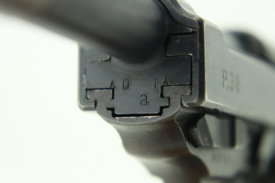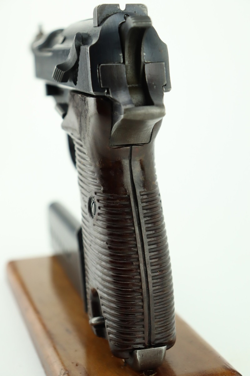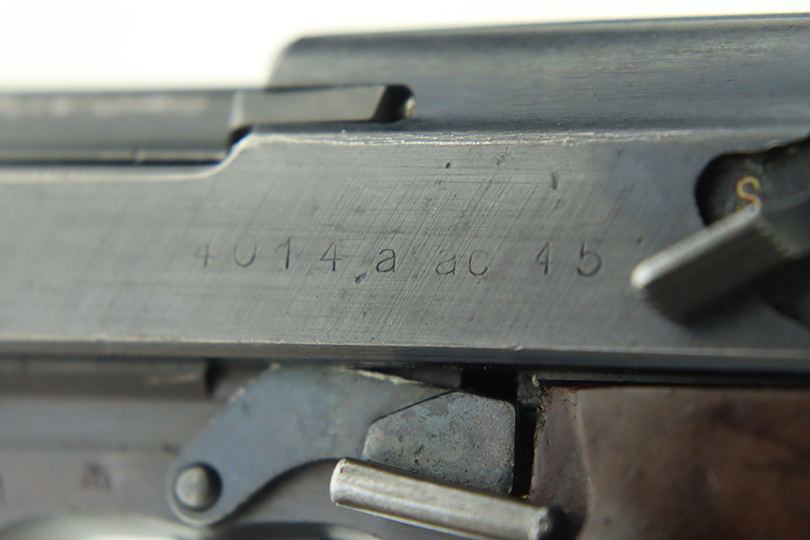 1/12/24 – This is a scarce AC 45 Walther P.38 issued to the Nazi military in 1945. What makes this one scarce is the capital “A” suffix on the frame and locking block. Only about 5,000 guns feature this oddity. It is believed that, for a short period of time in 1945, the lower case “a” die was broken or unavailable, so the Walther factory was forced to use the capital “A”. This one is all matching and has the proper “Eagle 359” military acceptance proofs throughout. The finish rates about 90% with general high edge wear and thinning on the front strap. There is also finish loss and some spotty rust around the front sight. Fitted with period-correct reddish bakelite grips and comes with a scarce late-war “U” marked magazine. The bore has great rifling with some very minor frosting in the grooves. De-cocker is not functional.