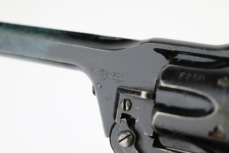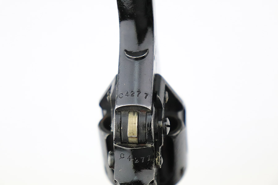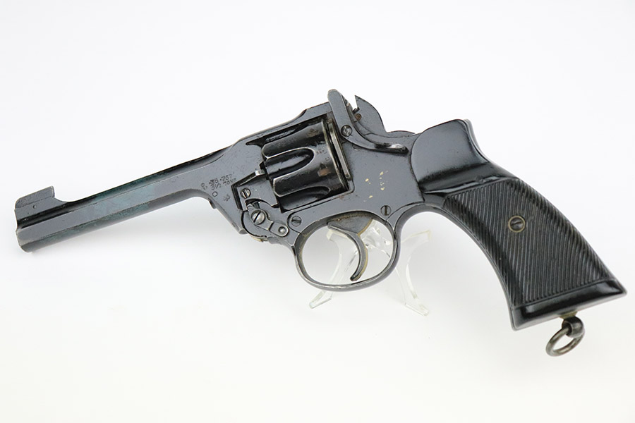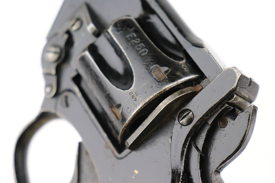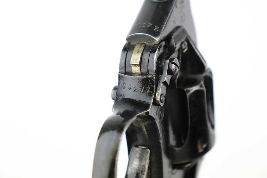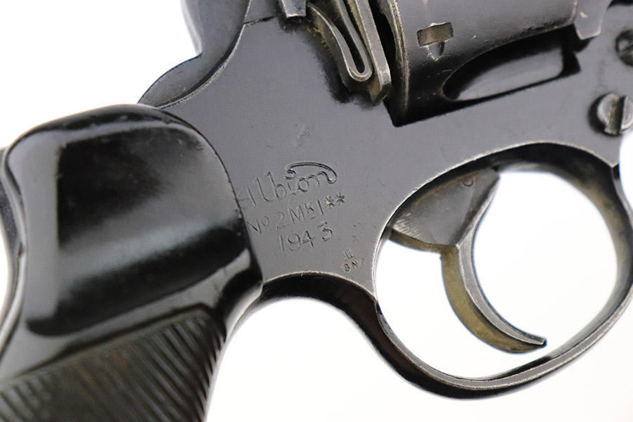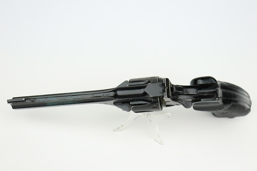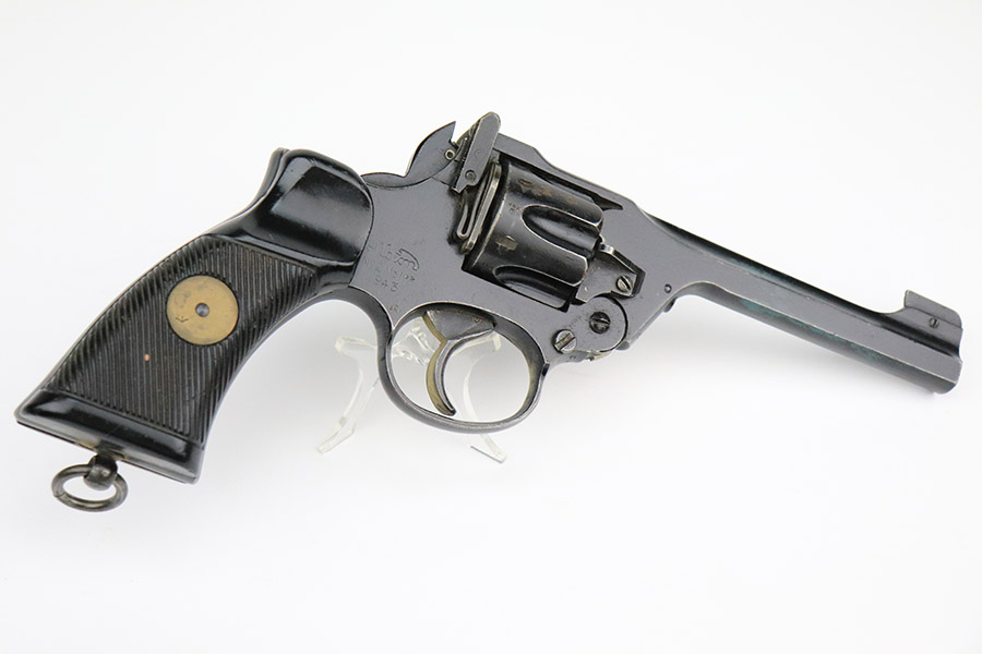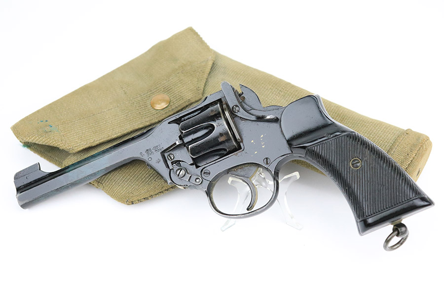 11/10/22 – This is a scarce revolver that was manufactured by Albion Motors in Scotland in 1943, and has the five inch barrel. It is a No 2 Mk 1**, and one of the much less common makers as compared to Enfield. This one is all matching and has the proper British military proofs throughout. It comes as a rig with a very nice 1941-dated canvas holster. The gun has an arsenal-reapplied black arsenal finish. Generally, there is minor wear around the high edges and light scratches / small chips in the black enamel paint throughout. There is an area of greenish-blue paint about halfway down the barrel. Comes with very nice period-correct black bakelite grips – a few tiny chips on the left side. Minty bore.