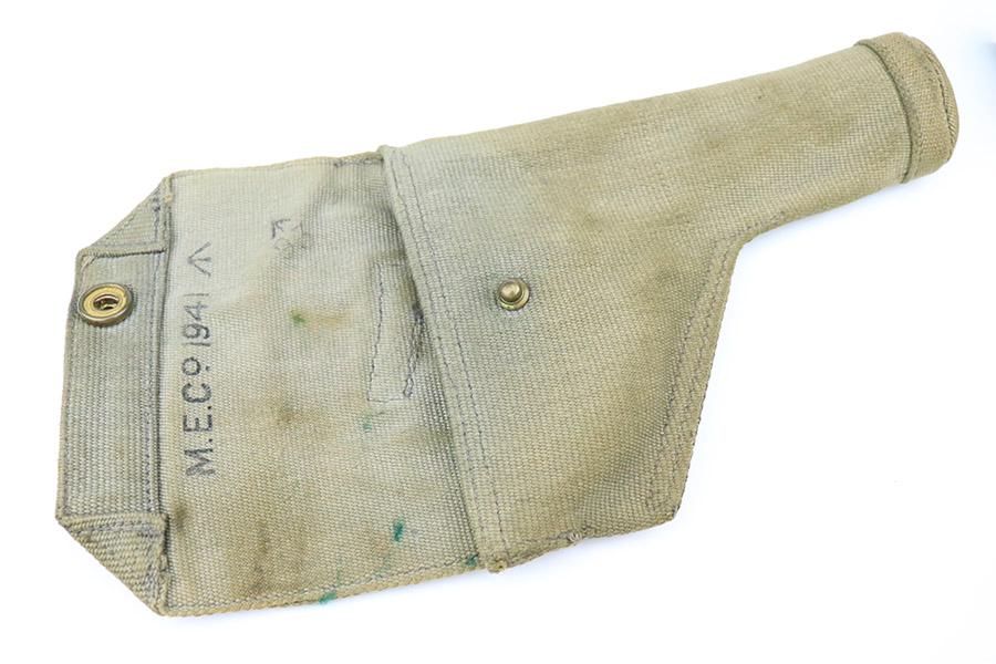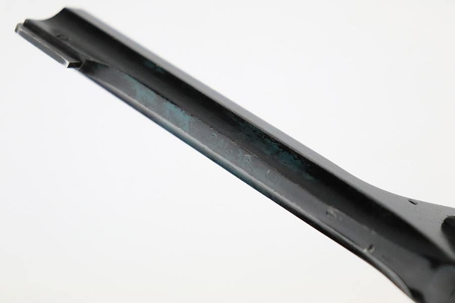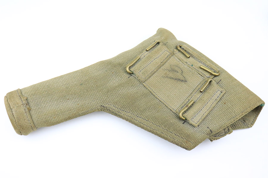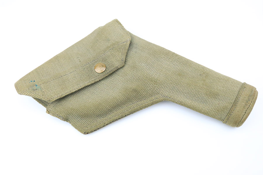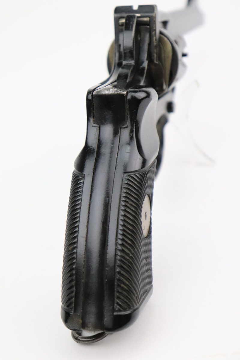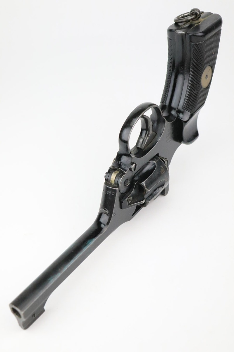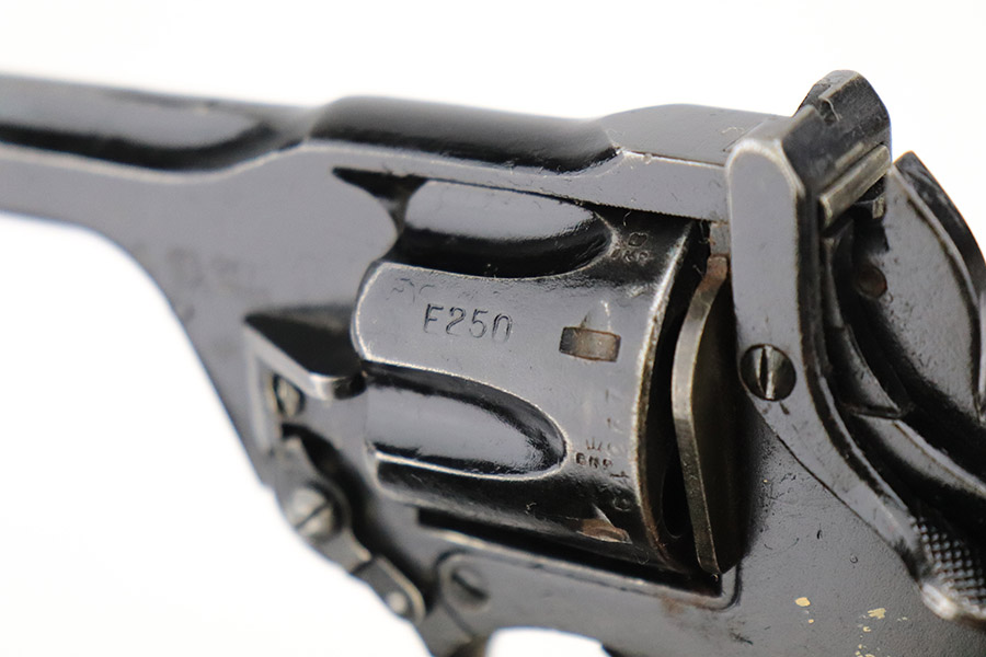 11/10/22 – This is a scarce revolver that was manufactured by Albion Motors in Scotland in 1943, and has the five inch barrel. It is a No 2 Mk 1**, and one of the much less common makers as compared to Enfield. This one is all matching and has the proper British military proofs throughout. It comes as a rig with a very nice 1941-dated canvas holster. The gun has an arsenal-reapplied black arsenal finish. Generally, there is minor wear around the high edges and light scratches / small chips in the black enamel paint throughout. There is an area of greenish-blue paint about halfway down the barrel. Comes with very nice period-correct black bakelite grips – a few tiny chips on the left side. Minty bore.
