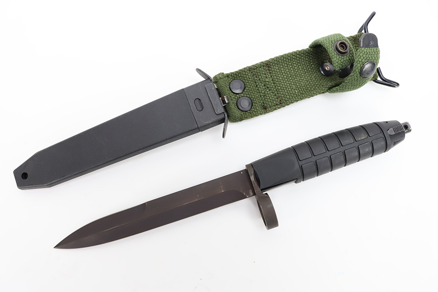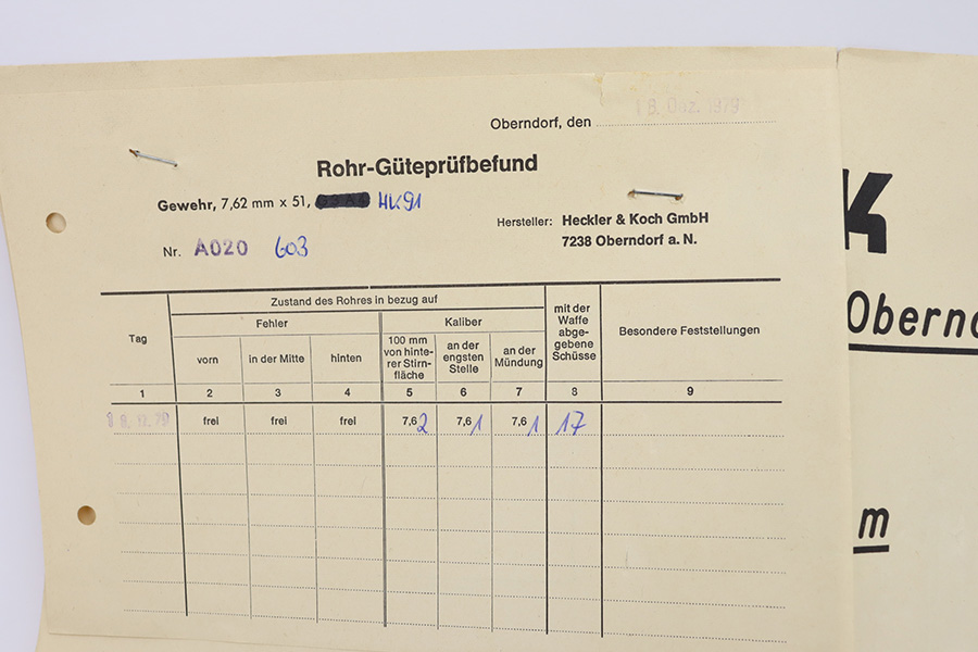 11/13/23 – This is a rare Heckler & Koch HK91 in its original box. It’s in terrific, original condition. Date code on receiver indicates it was manufactured in 1979. The rifle shows only minor wear along the top of the receiver, perhaps indicating a previous owner once had a scope mount on it temporarily. Included with this listing are six HK steel magazines that were made in Germany, an original bayonet, two slings, manuals, the original matching test target, a hand guard, a scope mount and more. Comes with its original bipod and box.