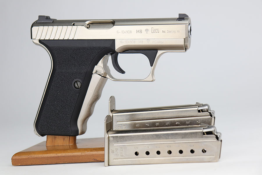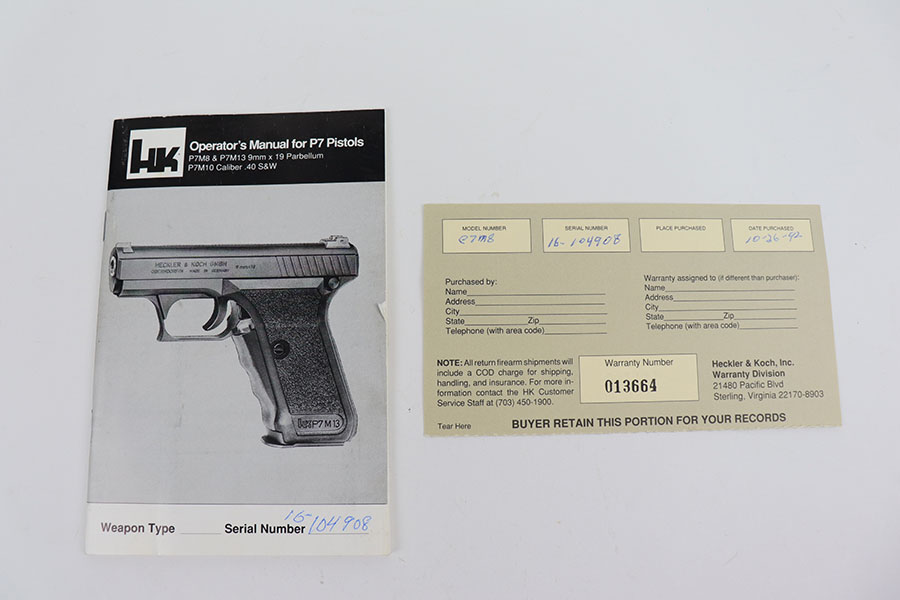 1/3/23 – This is a scarce and desirable Heckler & Koch P7M8 in the original box with factory nickel finish. The hard plastic H&K box is serialized to the gun, and both the box and slide are marked P7M8. The factory nickel shows no signs of use, nor does the bore. Includes a total of two magazines, a manual and the original warranty card. A difficult to find pistol that we receive many requests for, and this one is in a condition that can’t be upgraded.