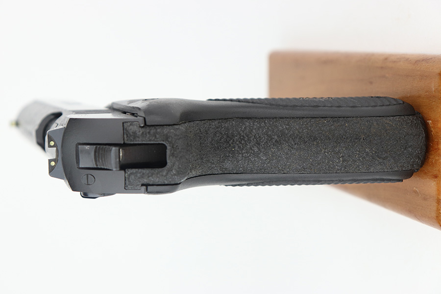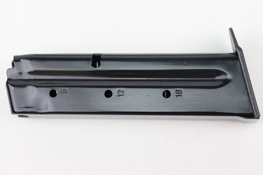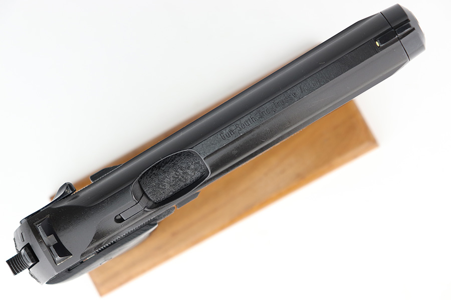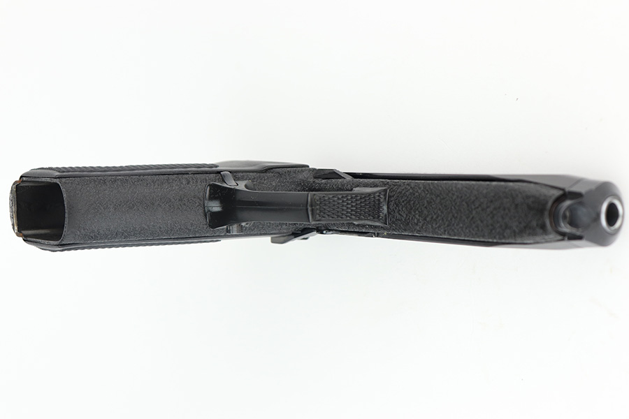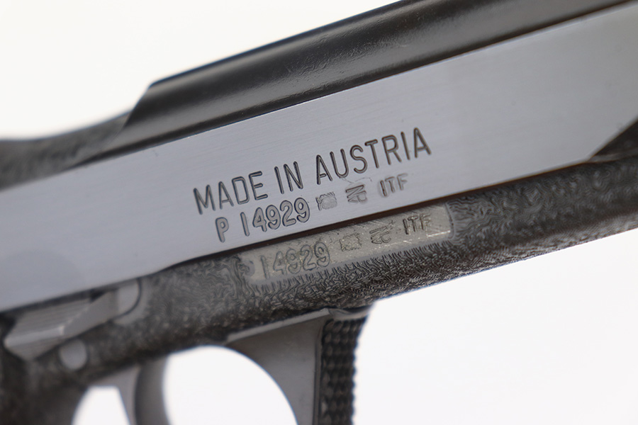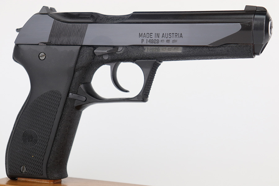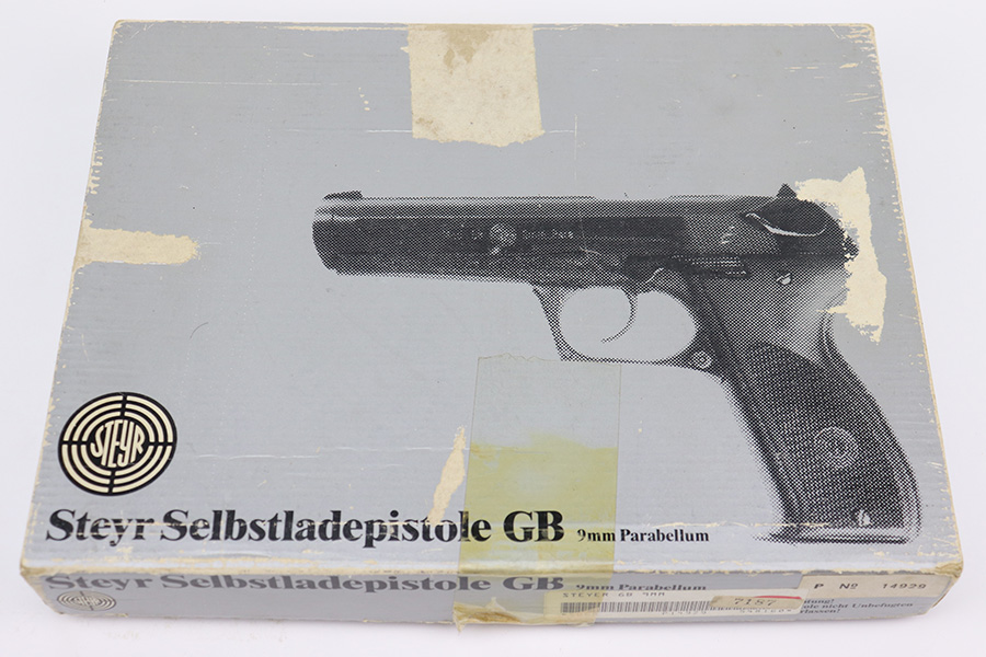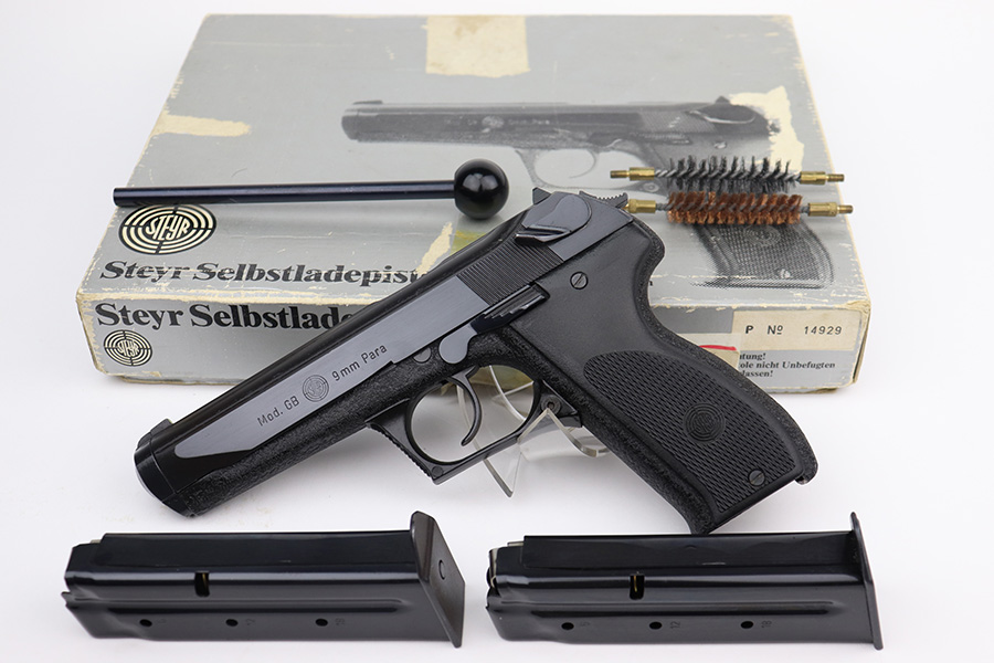 11/28/22 – This is a mint example of a Steyr Model GB, made in September of 1984 (ITF date code). It is rare to see these in their original, matching boxes, such as this one. This particular example also appears to be in nearly unused condition with a minty bore. Other GB characteristics include: 9mm Para. cal., DA/SA, delayed blowback action, 5 1/4 in. barrel with Polygon rifling, 18 shot mag., steel construction, non-glare checkered plastic grips, matte finish, 2 lbs. 6 oz. The box has the original insert with cleaning rod, one of the brushes and a spare magazine. The box is fairly tattered along the edges. Mint bore. FFL required.