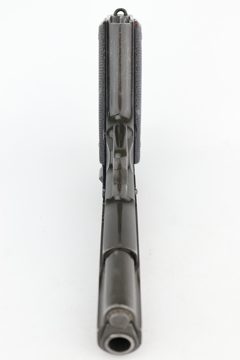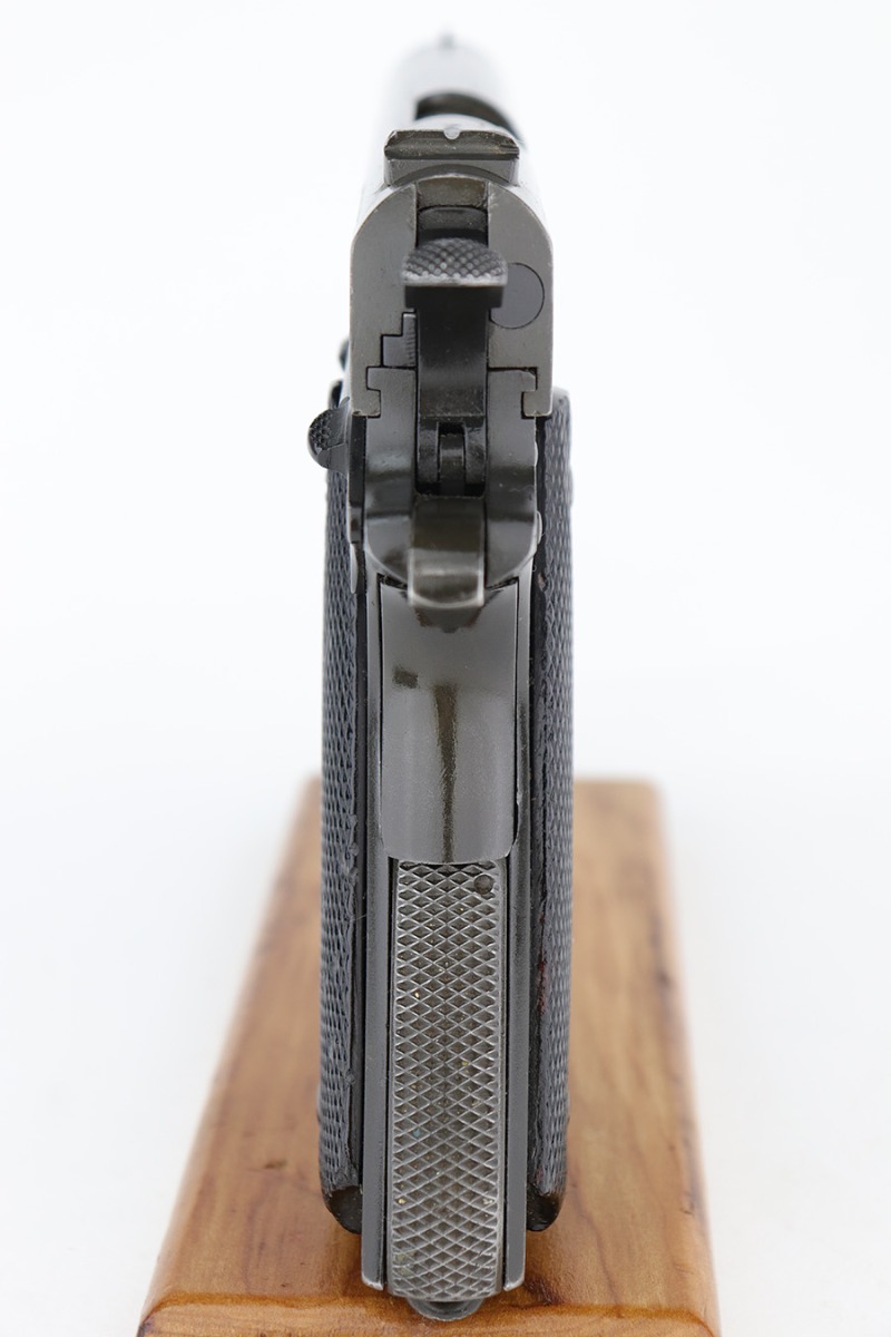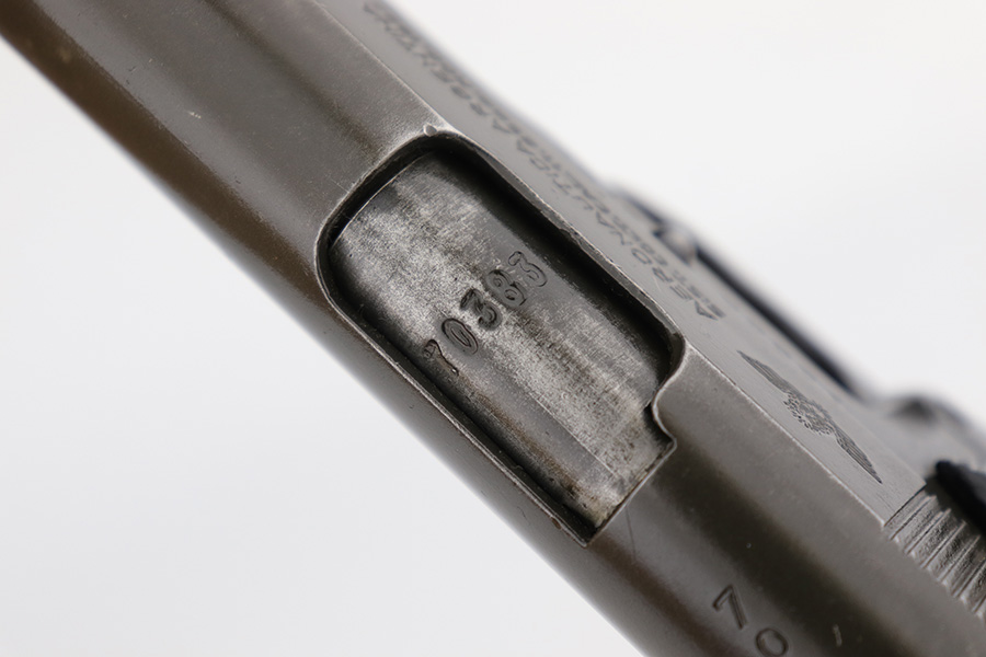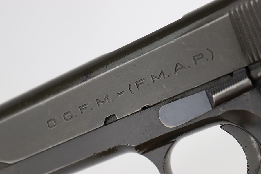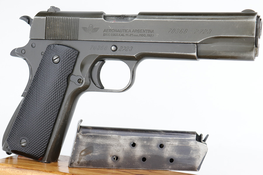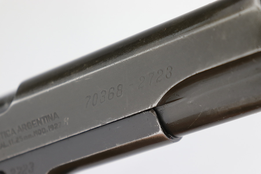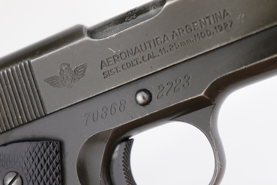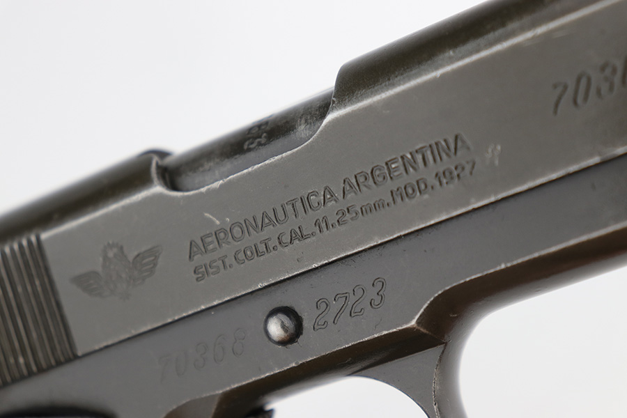 5/16/24 – This DGFM Model 1927 issued to the Argentine Air Force after WW2. It has the “Aeronautica Argentina” Air Force marking on the right side of the slide. This one is all matching and has a tiny import mark on the left side of the frame. It has retained about 96% of its finish. There is very minor wear around the muzzle and high edges of the slide and some tiny dings on the front strap. Comes with excellent black plastic grips and one period-correct magazine that is numbered but not matching. The bore has strong rifling, but there is some light freckling in the grooves.