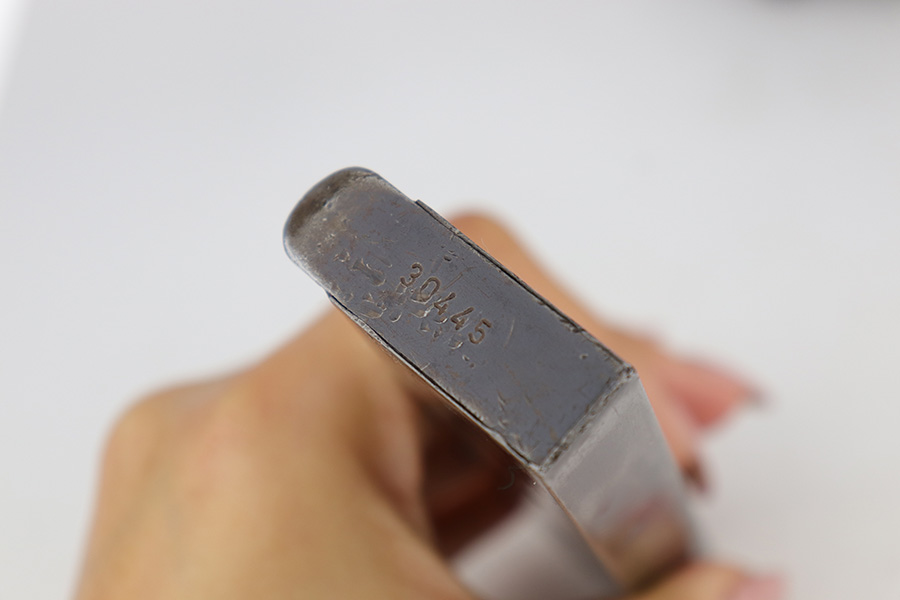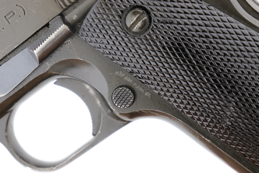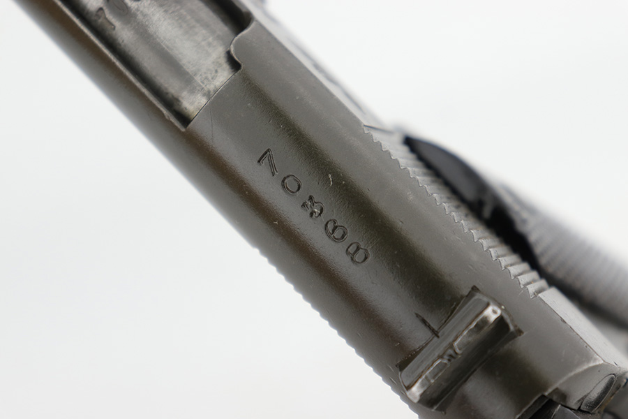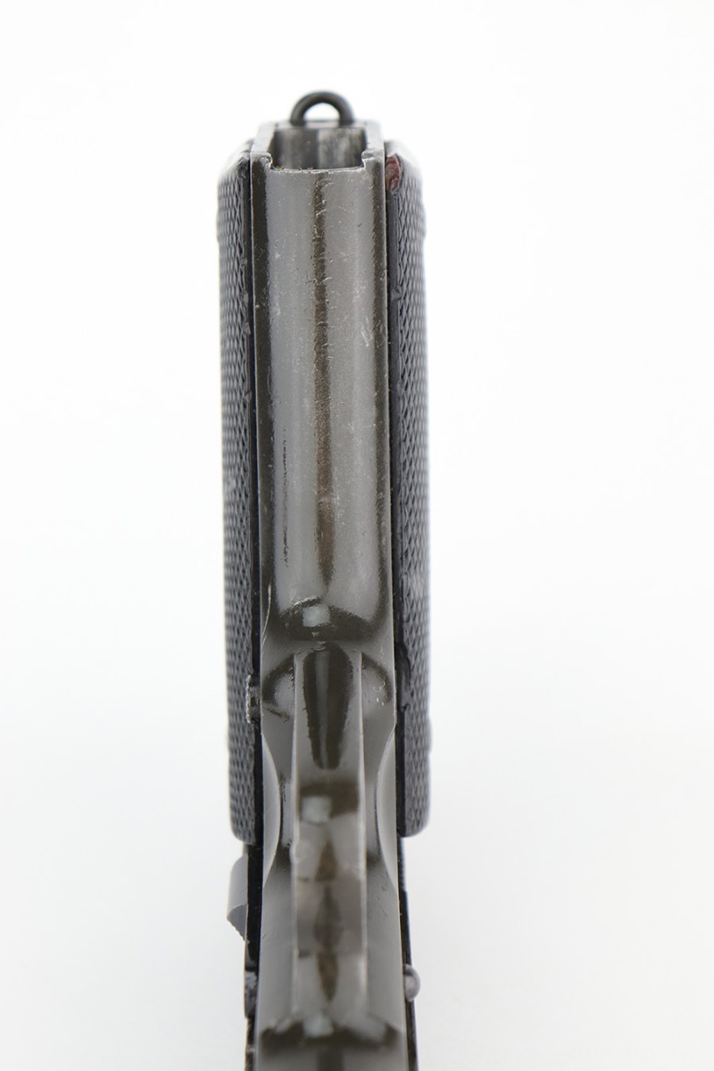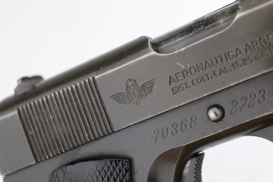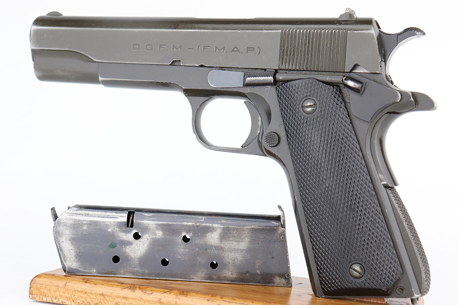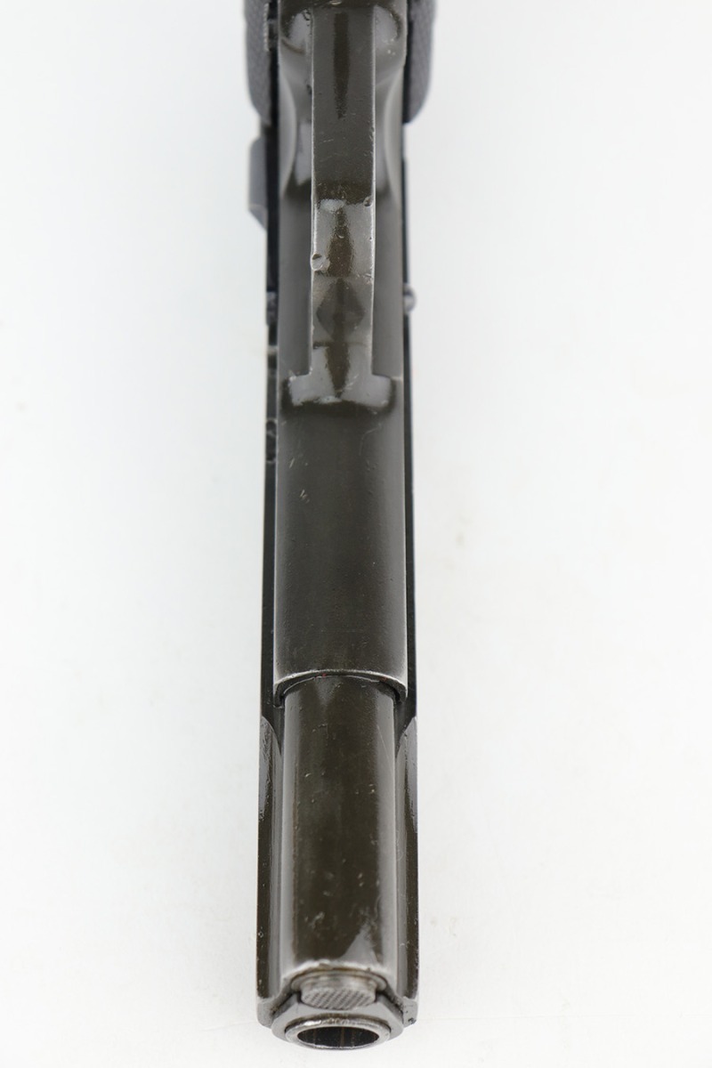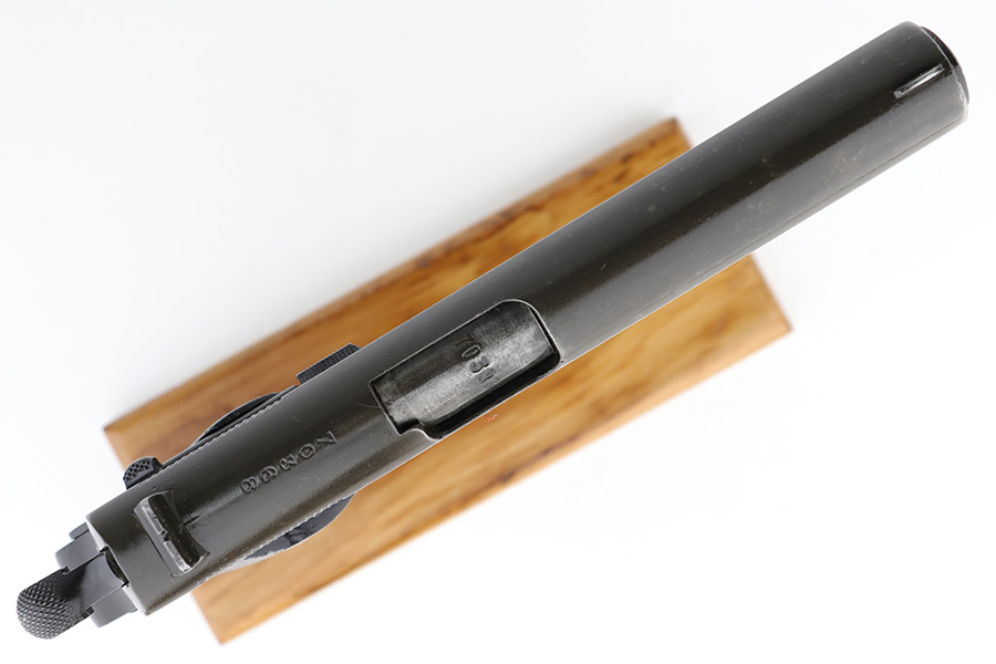5/16/24 – This DGFM Model 1927 issued to the Argentine Air Force after WW2. It has the “Aeronautica Argentina” Air Force marking on the right side of the slide. This one is all matching and has a tiny import mark on the left side of the frame. It has retained about 96% of its finish. There is very minor wear around the muzzle and high edges of the slide and some tiny dings on the front strap. Comes with excellent black plastic grips and one period-correct magazine that is numbered but not matching. The bore has strong rifling, but there is some light freckling in the grooves.