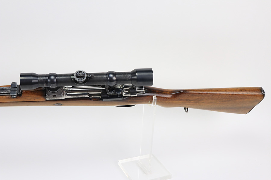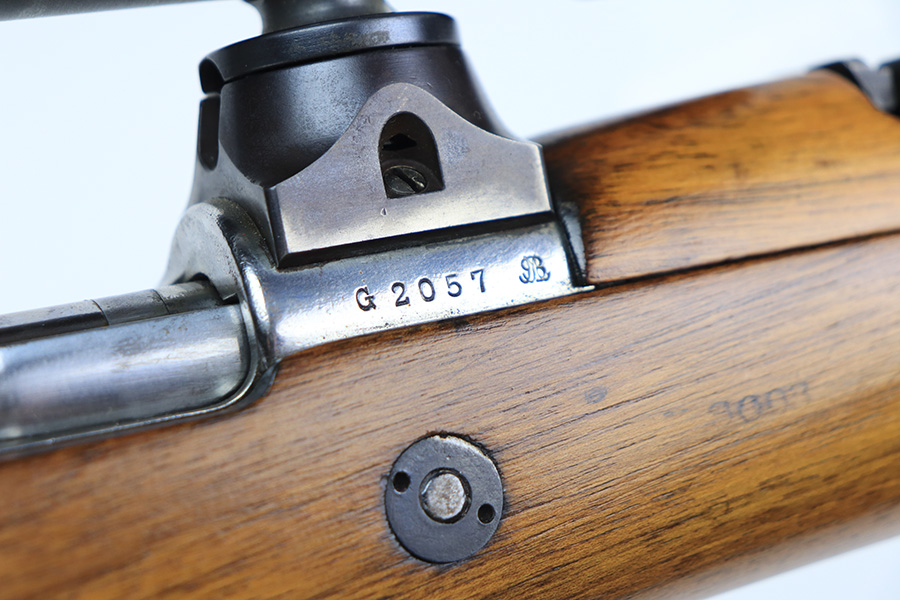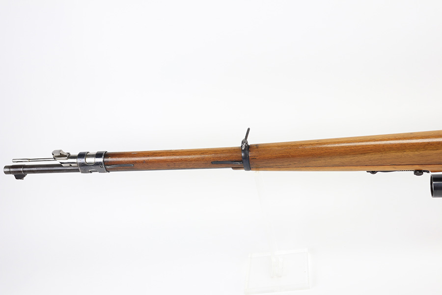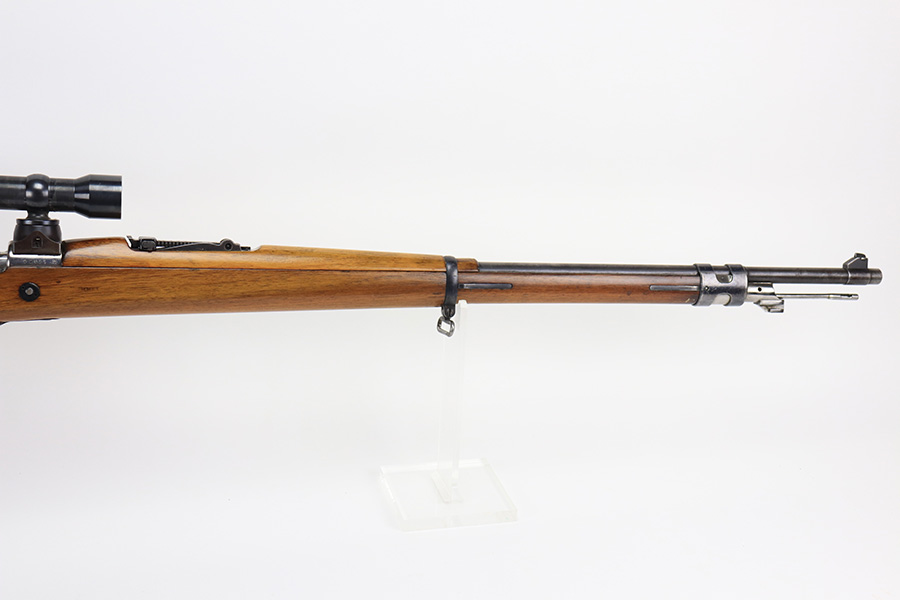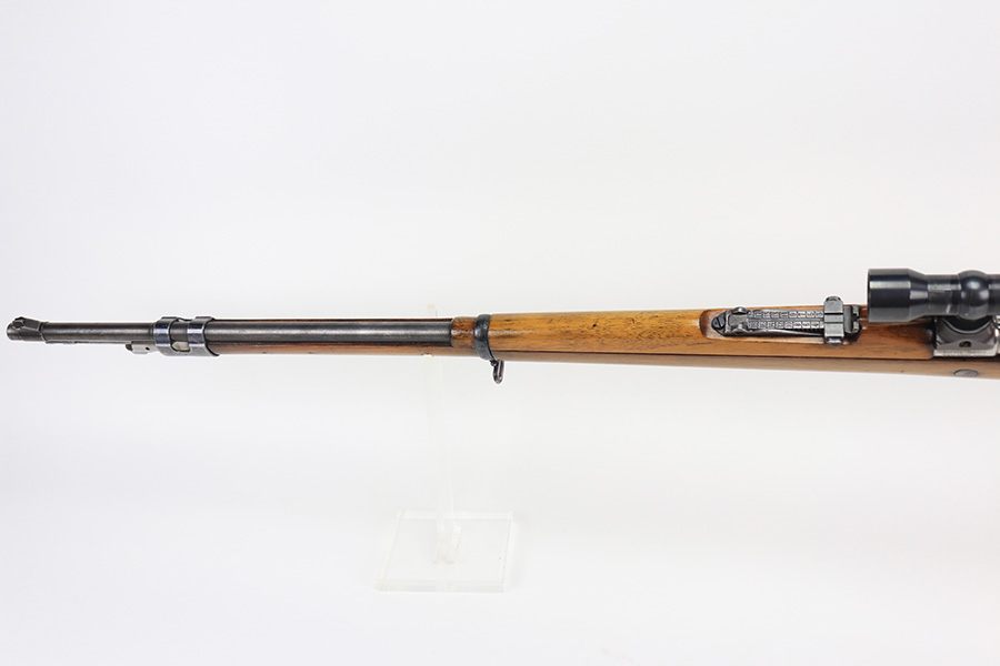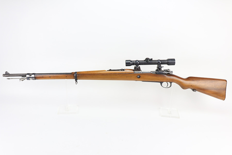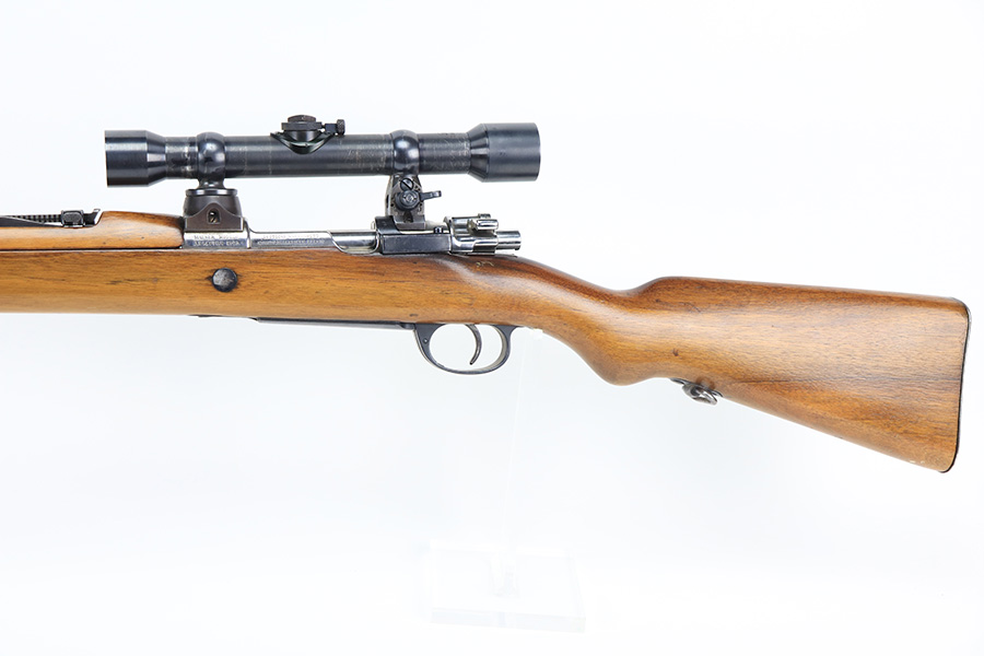 1/17/22 – This is a nice example of an uncommon 1909 Mauser sniper rifle that was part of a contract order by the Argentine military. This is an example of an early Model 1909 Mauser rifle as manufactured under commercial contract by DWM for the country of Argentina, that was produced as a low turret sniper rifle. These early sniper rifles were all supplied with Zeiss scopes using low turret mounts, but this one has an after-market Jena scope with clear optics. This is the first example we’ve sold but we believe the scope mounts are original, but the rings were added when the scope was. Matching numbers on receiver, trigger group, bolt. Import mark on right side of receiver. Thinning of the bluing on the barrel and front band. Bore has strong rifling but some frost throughout. Excellent stock with just a few minor dings.