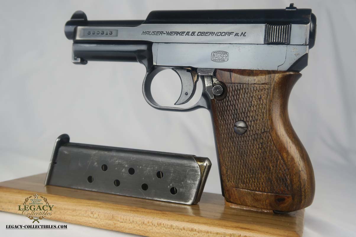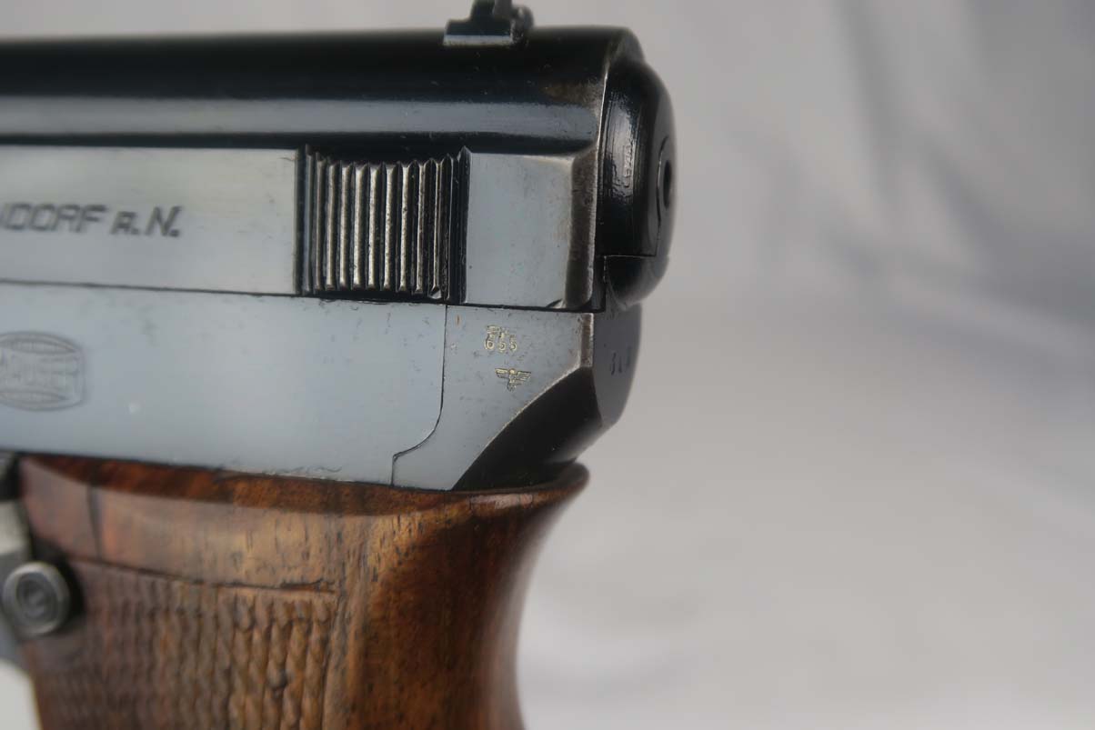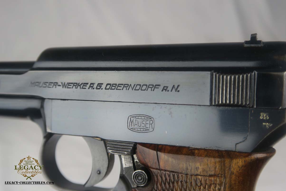 9/5/17 – This is a hard to find Eagle/655 proofed 1934 Mauser from World War II.  There were only 8,000 of these procured for the Germany Army, all between 1940 and 1941. The original finish is about 94-95% with wear on the slide and front strap. It also looks like someone scratched their initials in the right of the frame. All parts are matching and correct. Comes with a nice Mauser banner magazine and correct wood grip.  Excellent bore.