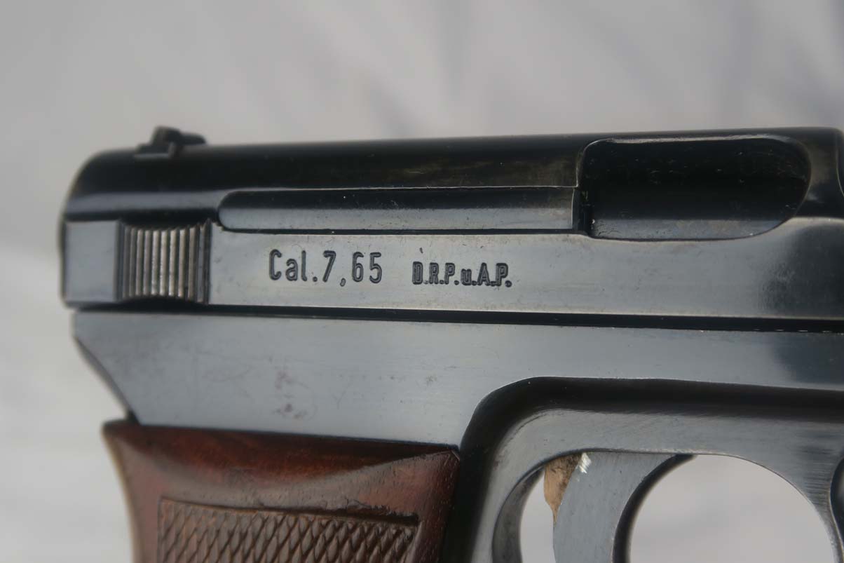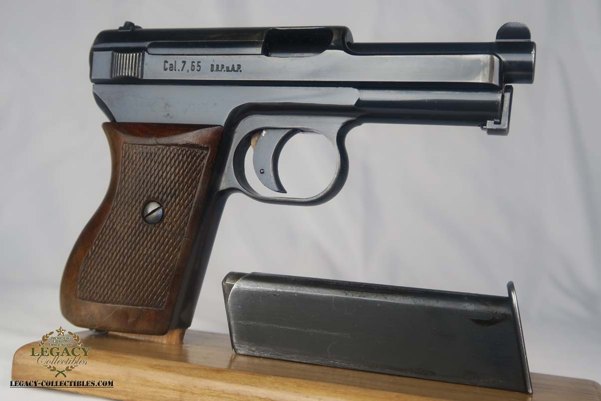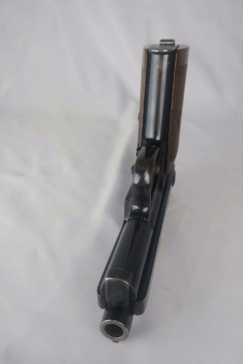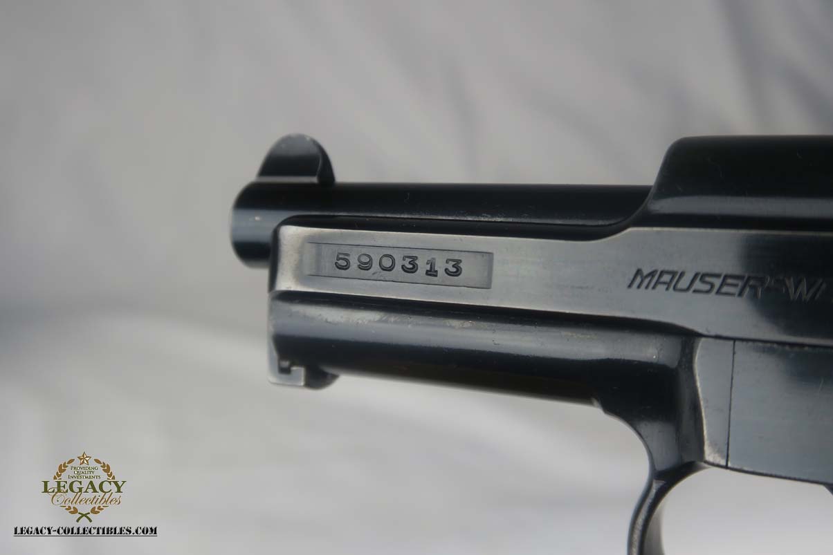 9/5/17 – This is a hard to find Eagle/655 proofed 1934 Mauser from World War II.  There were only 8,000 of these procured for the Germany Army, all between 1940 and 1941. The original finish is about 94-95% with wear on the slide and front strap. It also looks like someone scratched their initials in the right of the frame. All parts are matching and correct. Comes with a nice Mauser banner magazine and correct wood grip.  Excellent bore.