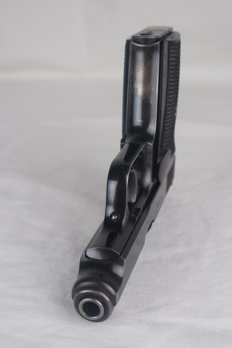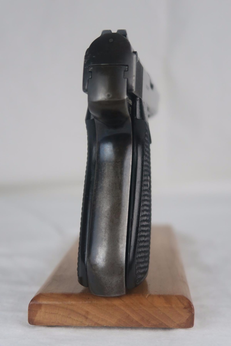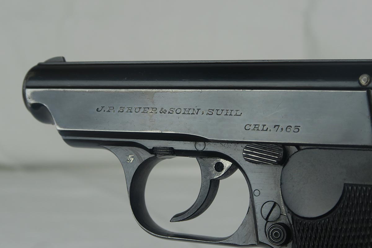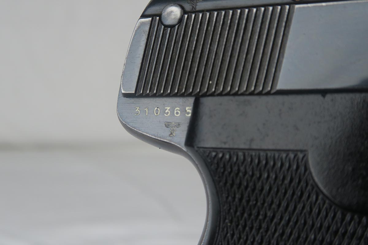 7/31/17 – This is a scarce variation 2 Sauer 38h from WW2.  It was issued to the army and has a high-polish blue.  There were only ~9,000 of this variation procured, compared to ~40,000 with duller military finish.  This one is all original and correct with about 90-92% bluing.  Nearly all of the finish loss can be found on the straps.  E/37 proofed on the trigger guard.  Excellent grips.  Minty bore.