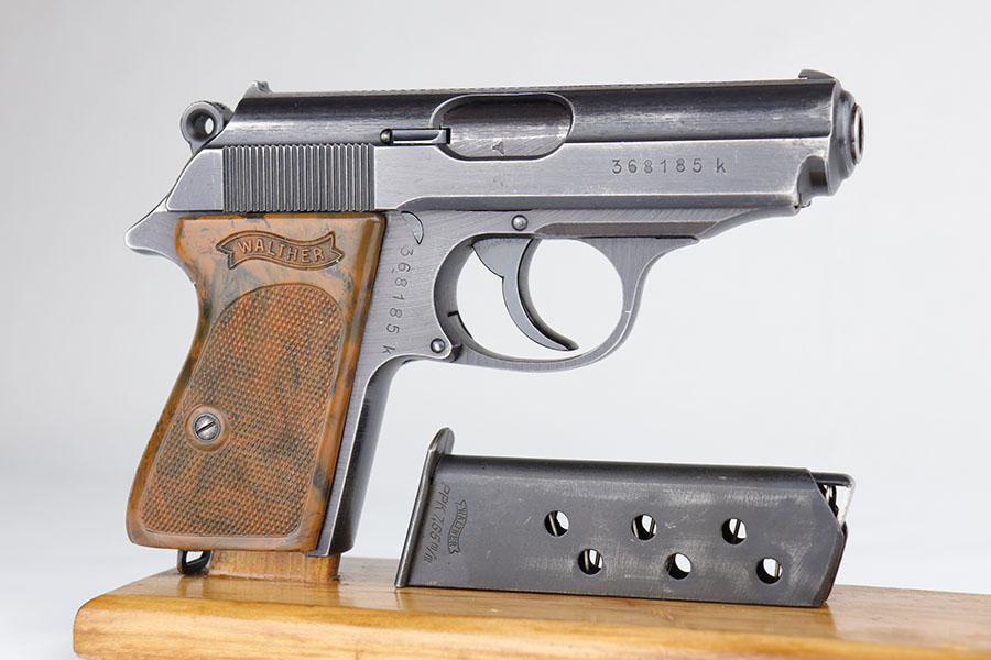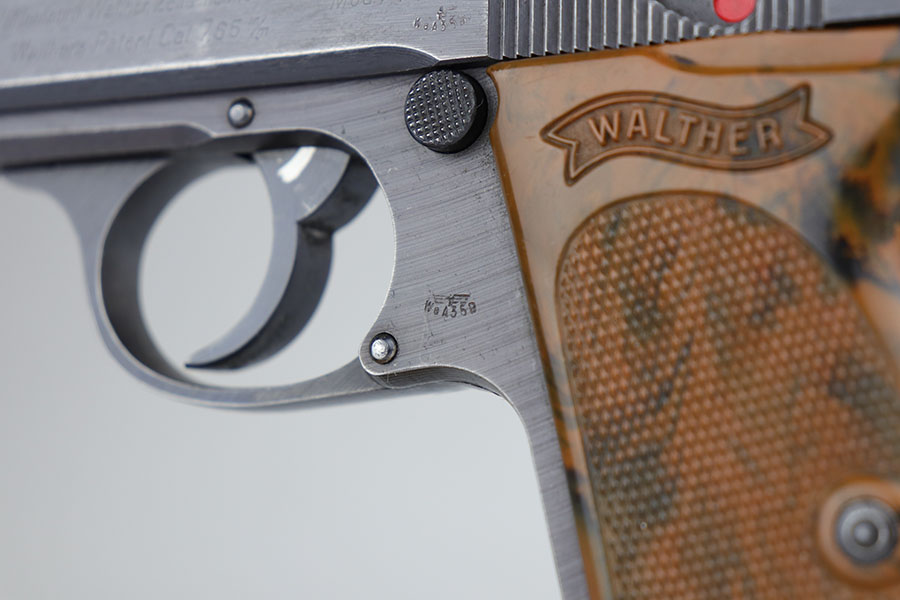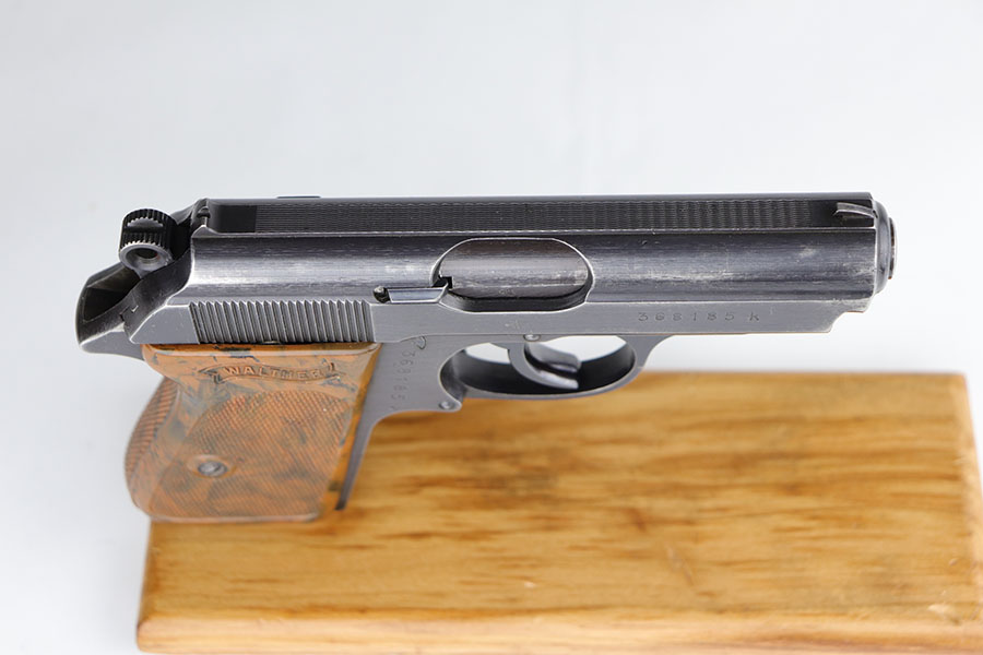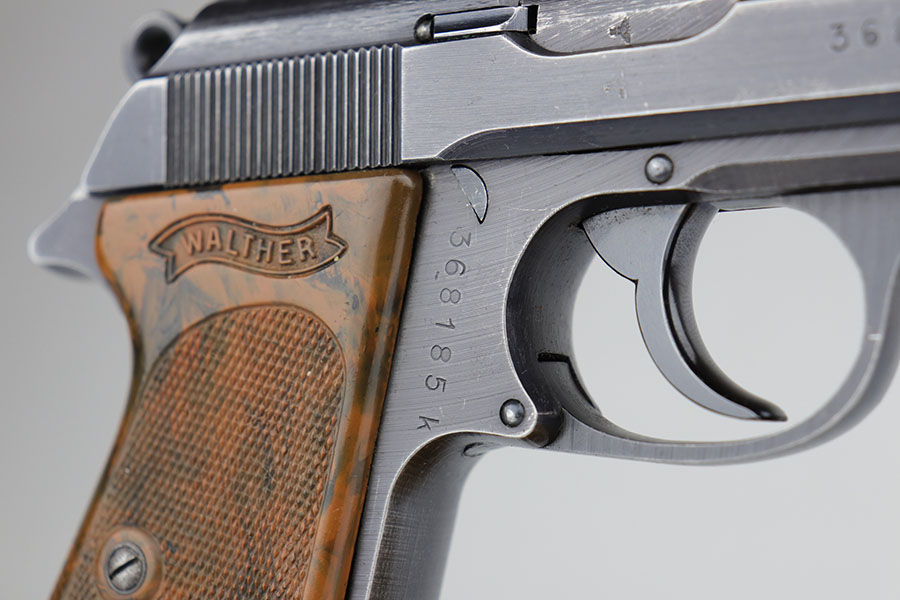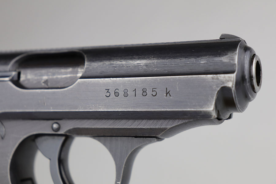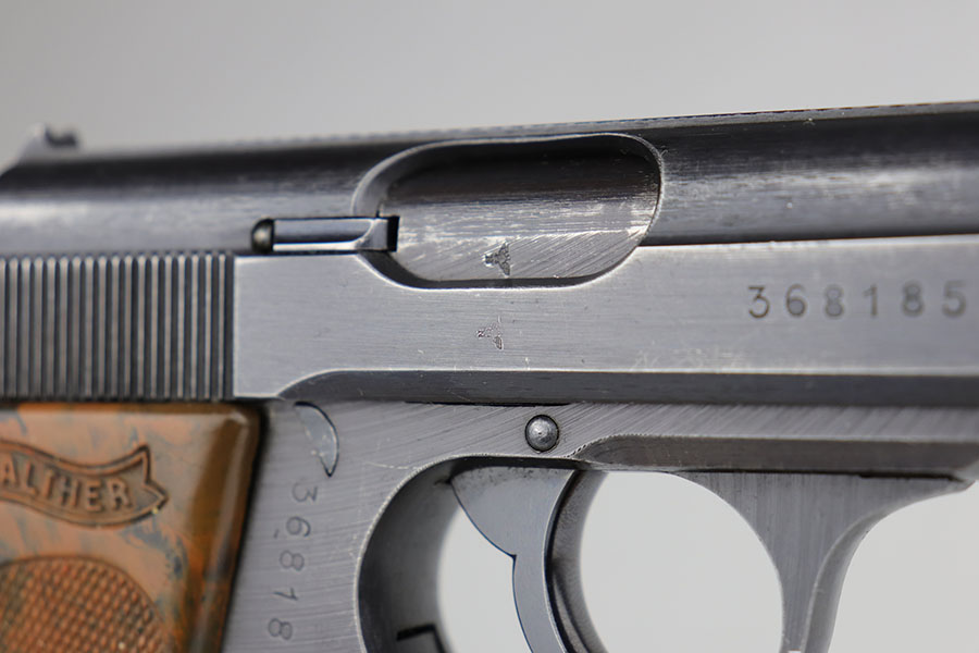 5/5/20 – This is a scarce Army Walther PPK from 1942. It’s a third variation example, and one of about ~15k produced. It has 95% or so of the original, military blue. Both sides of the slide have muzzle wear, and there are a couple small areas of wear on the left side of the slide. Mint bore and excellent grip. It has no cracks but a previous owner did lightly scratch his initials on the underside.