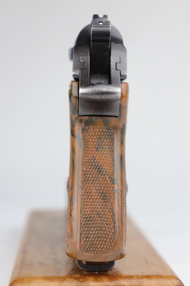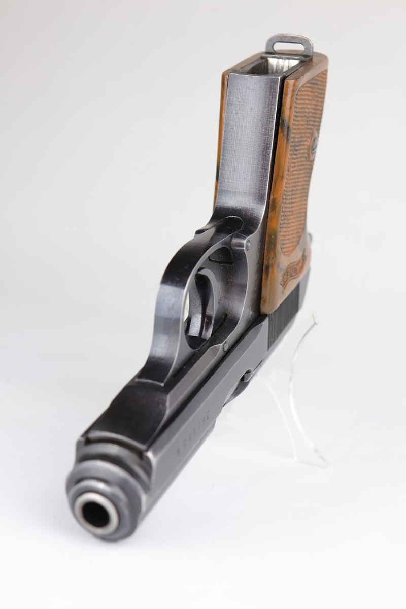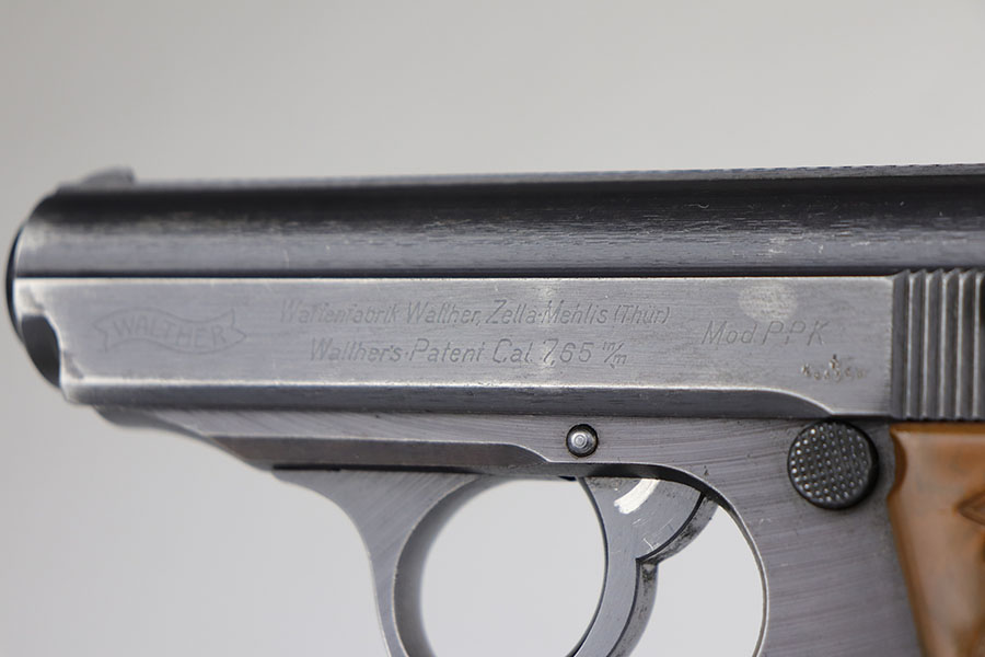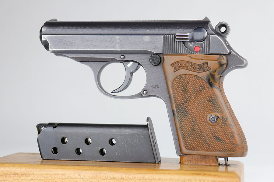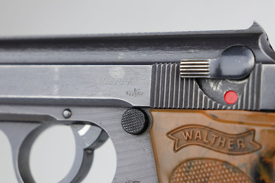 5/5/20 – This is a scarce Army Walther PPK from 1942. It’s a third variation example, and one of about ~15k produced. It has 95% or so of the original, military blue. Both sides of the slide have muzzle wear, and there are a couple small areas of wear on the left side of the slide. Mint bore and excellent grip. It has no cracks but a previous owner did lightly scratch his initials on the underside.