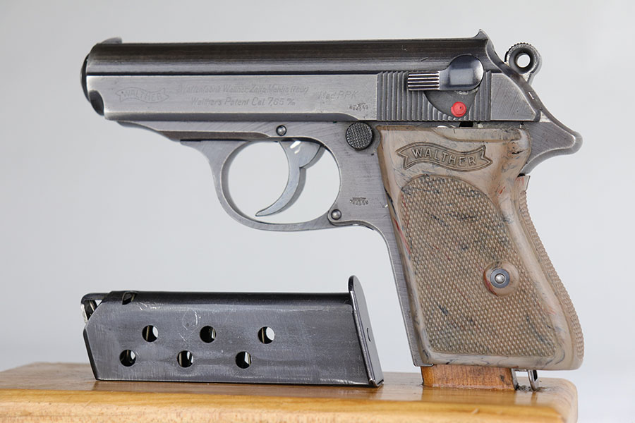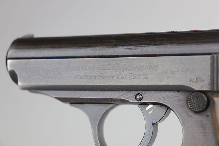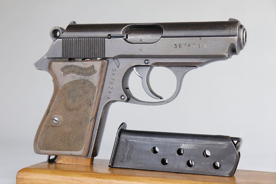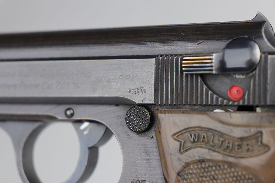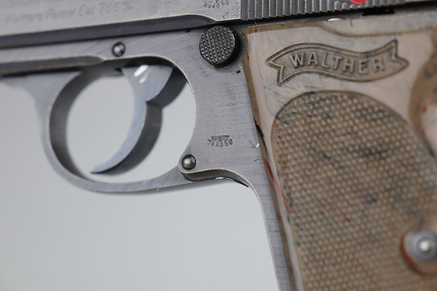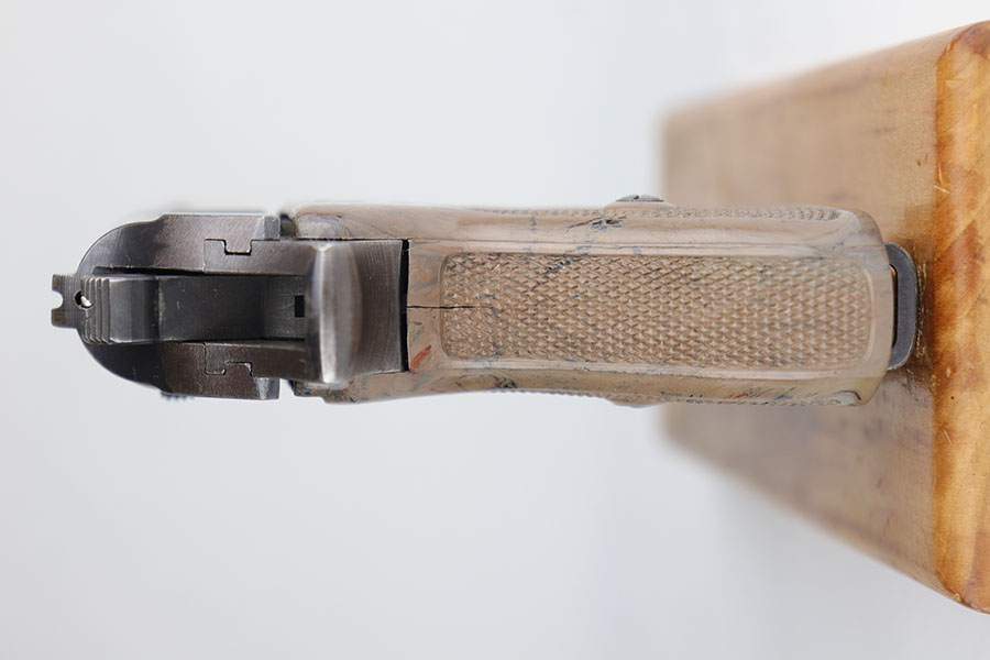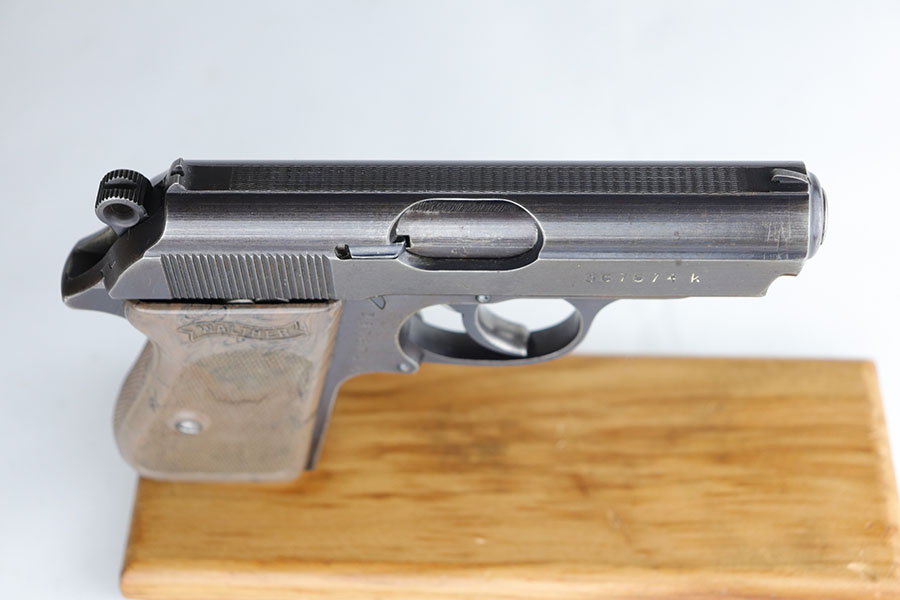7/9/20 – This is a scarce Walther PPK that was issued to the German Army in 1942. It is all original and matching but the finish is tough to rate on this one. There’s minor high edge wear, but the color is a bit of a duller brown throughout. There isn’t much actual bluing loss. There are a few thin scratches on the right side of the slide, near the muzzle Sharp waffenamts present on slide and frame. This is a third variation Army PPK, with 12,500 produced. Minty bore. Excellent and desirable gray grip with the common stress crack in the spine.