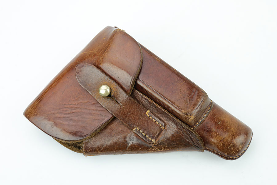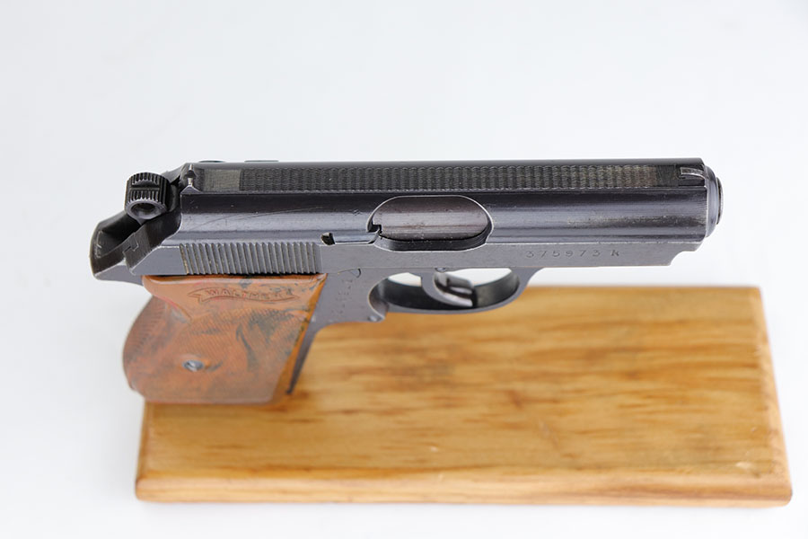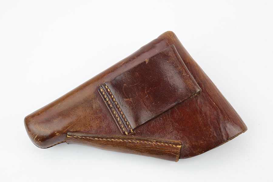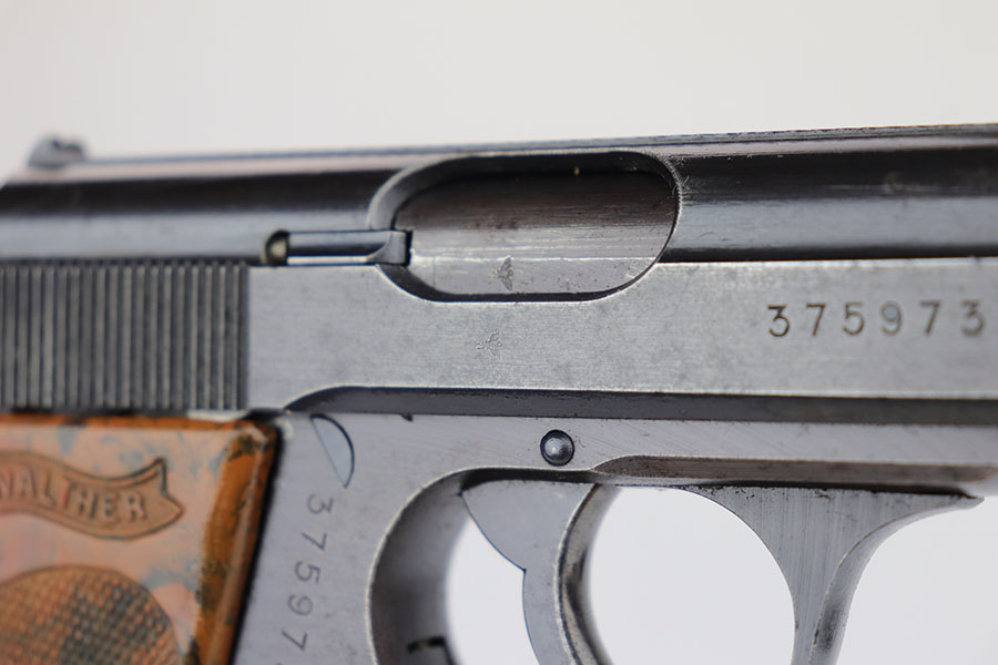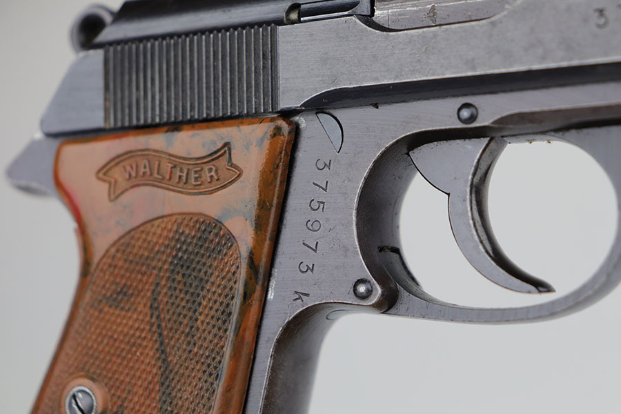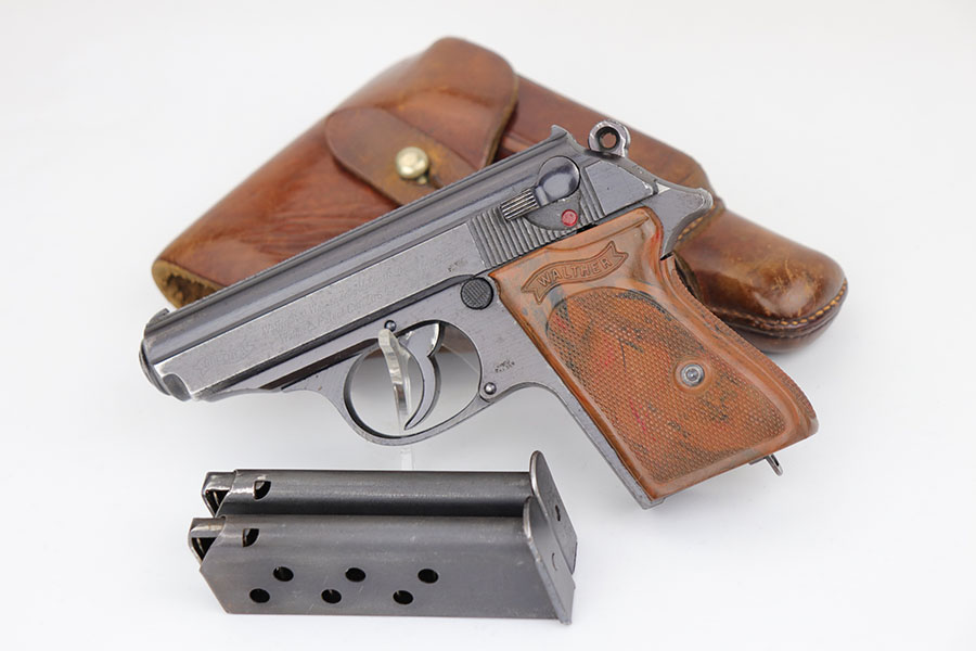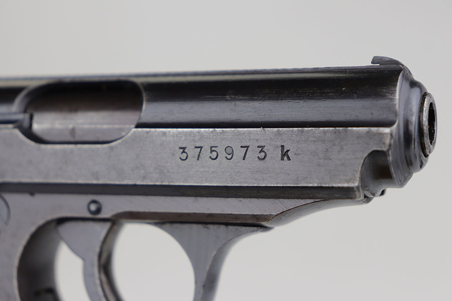 4/3/20 – This is a scarce and complete Army Walther PPK rig from 1942. This is a third Army variation example, one of about 12,500 produced with military blue and waffenmts on slide and frame. The finish on this one is a little tough to rate as there’s some general dulling/thinning to the finish but no major areas of wear. Most of the finish loss is on the front strap. Mint bore. Pistol also has a minty grip without any cracks or chips. Rig includes two correct magazines. It is completed by an original Akah holster that has a bit of cracking in the top flap but is in otherwise very good condition.