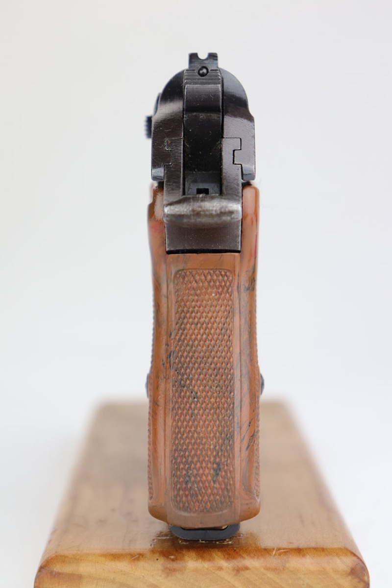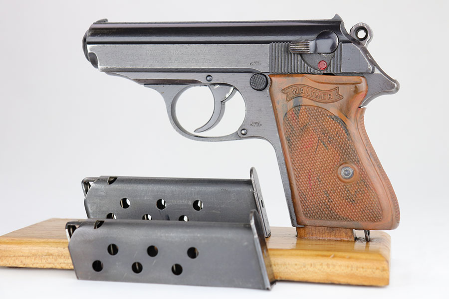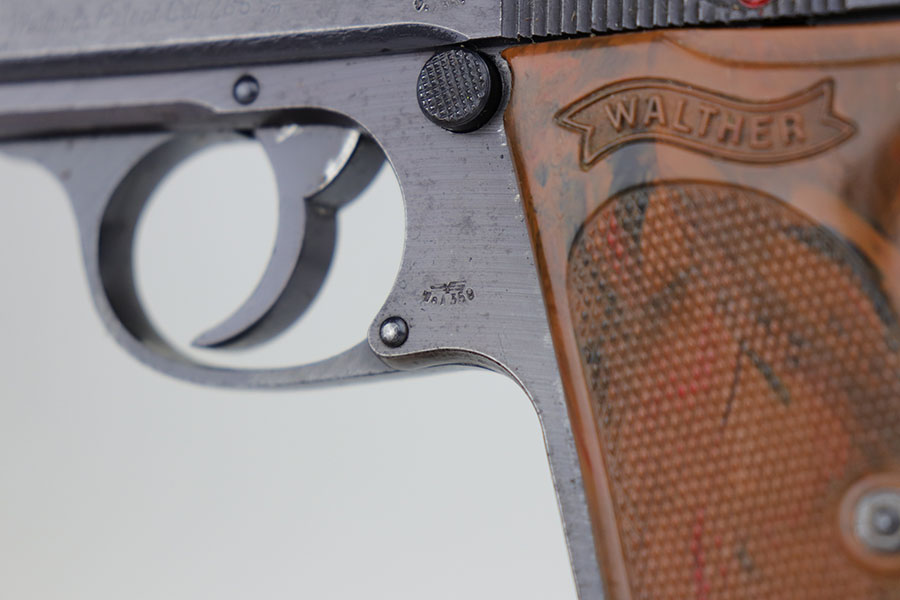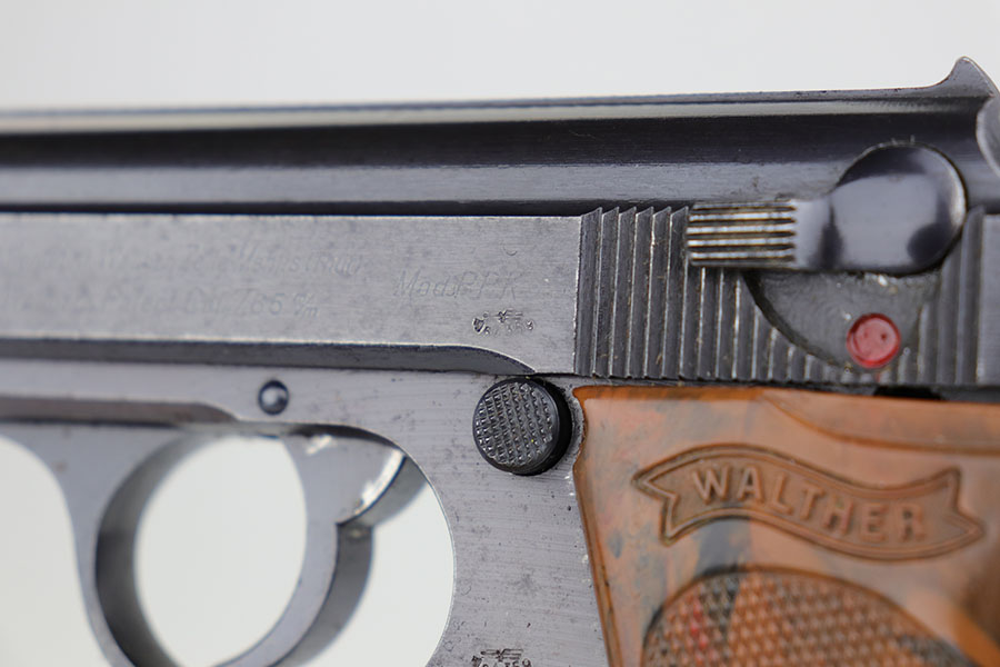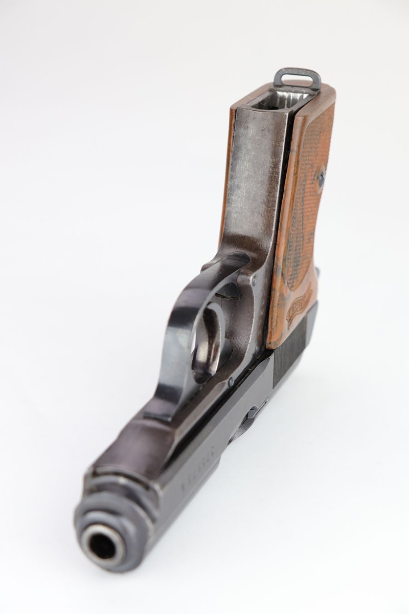 4/3/20 – This is a scarce and complete Army Walther PPK rig from 1942. This is a third Army variation example, one of about 12,500 produced with military blue and waffenmts on slide and frame. The finish on this one is a little tough to rate as there’s some general dulling/thinning to the finish but no major areas of wear. Most of the finish loss is on the front strap. Mint bore. Pistol also has a minty grip without any cracks or chips. Rig includes two correct magazines. It is completed by an original Akah holster that has a bit of cracking in the top flap but is in otherwise very good condition.