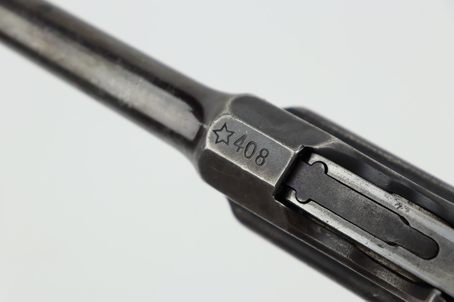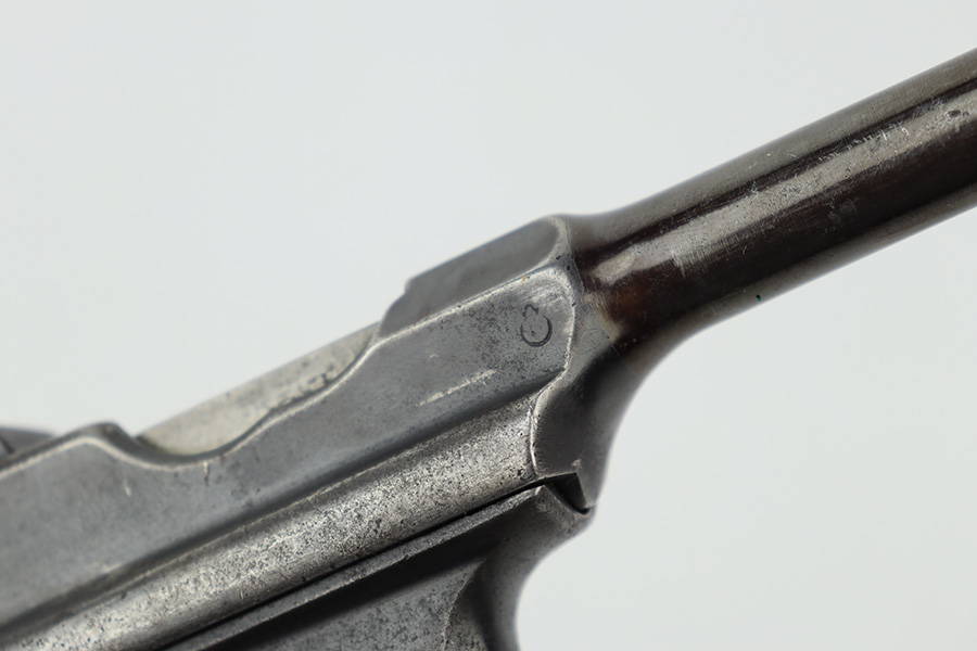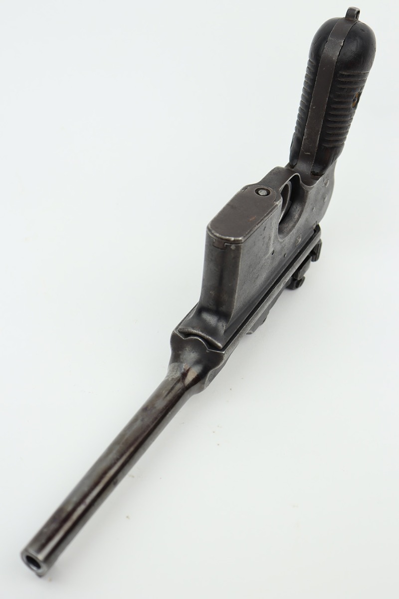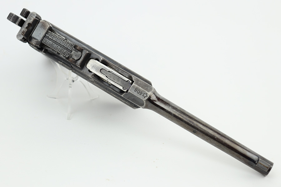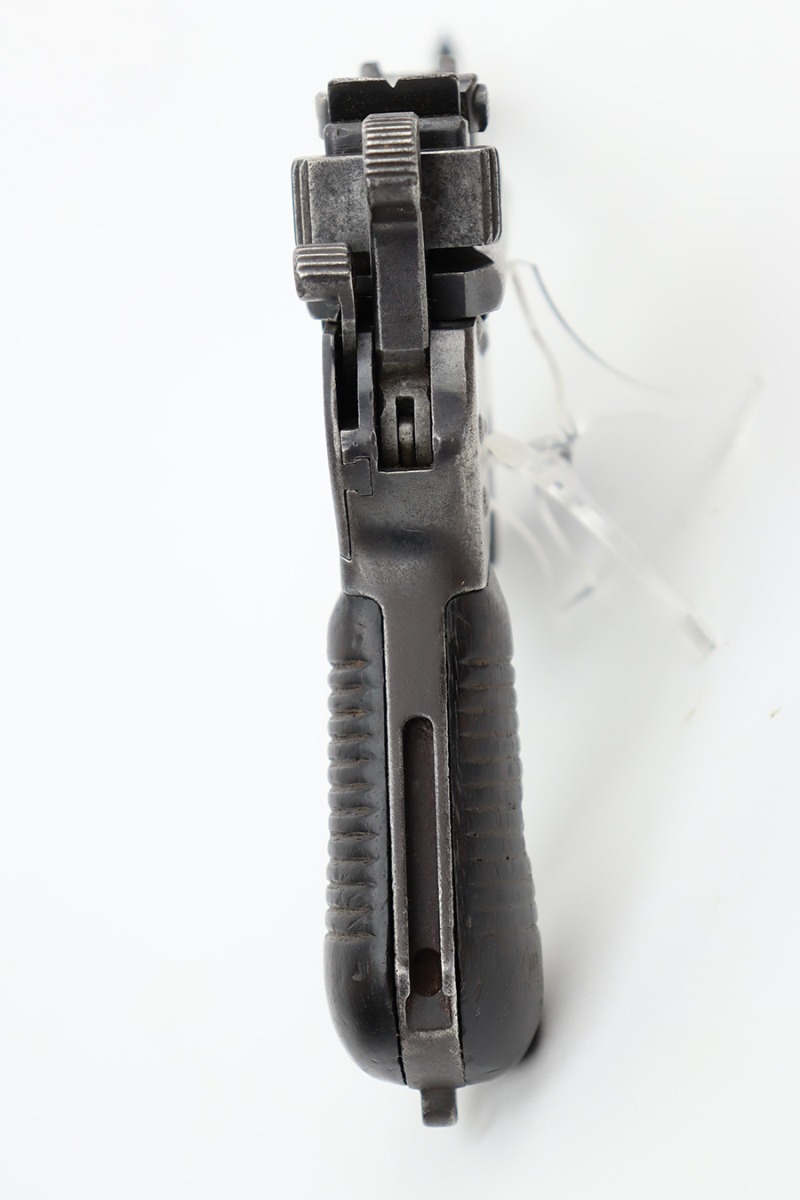 8/2/23 – This is a fairly rare Astra Model 900 that was manufactured sometime in the early to mid 1930’s. The Astra 900 was a pistol developed to take advantage of a large Chinese demand for semiauto pistols with shoulder stocks, following the massive sales of the Mauser C96 in that country. There was a loophole in the international treaty accords that stocked pistols were not considered military arms, so civil war in China had a huge market for arms that this variant was able to meet. There were only ~21,000 of these pistols produced. Large ring hammer and 1000 meter tangent sight. This one is mismatched and has retained roughly half of its original finish. There is obvious spotty wear and tiny pitting throughout. The finish loss is concentrated mostly on the top half of the gun. Brown patina on the grip straps. Fitted with fairly worn matching-numbered wood grips. Excellent bore. The lanyard ring is missing. Import mark on the left side of the frame.