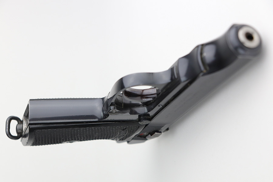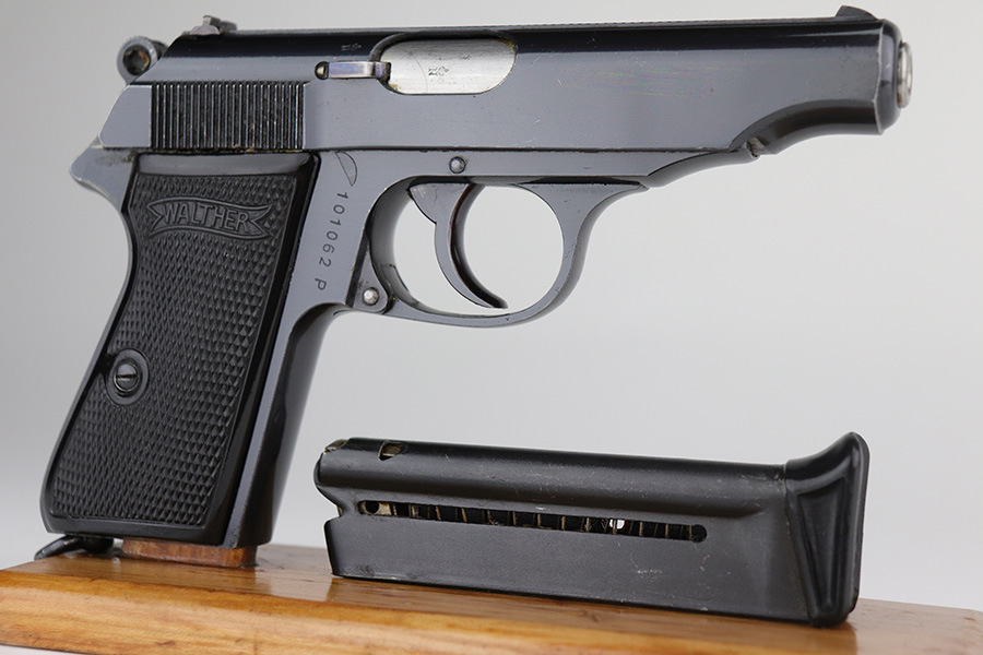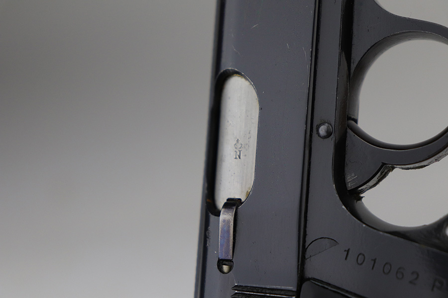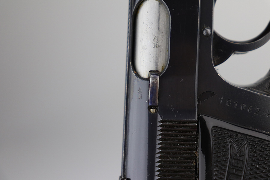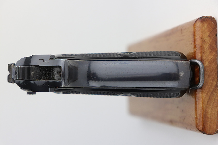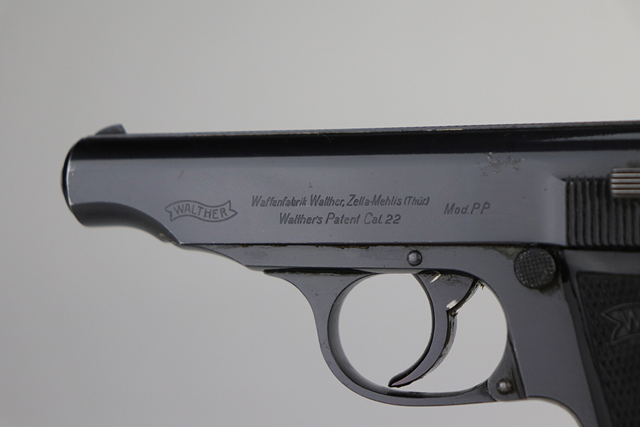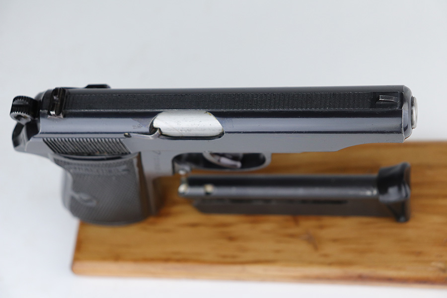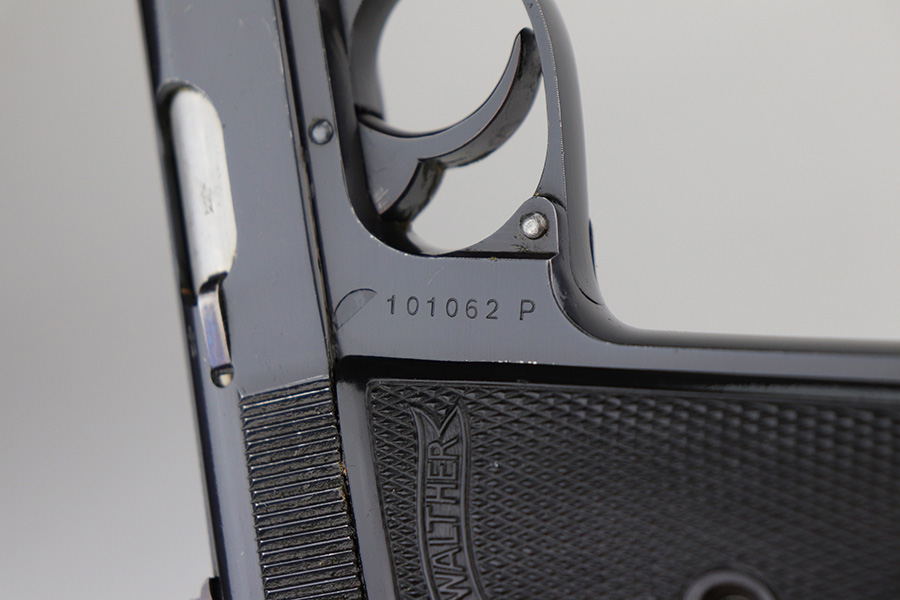 8/26/21 – This is a minty and original Walther PP from 1938. It’s chambered in .22LR, and only ~3.5% of total wartime and pre-war PP production was in this caliber. It has 98% of the original blue, with a hint of muzzle wear and a little bluing loss on the back strap. There’s also a small patch of pitting on the left side of the slide. Mint bore. Excellent grips with just a little handling wear on the left panel. Finger extension magazine.