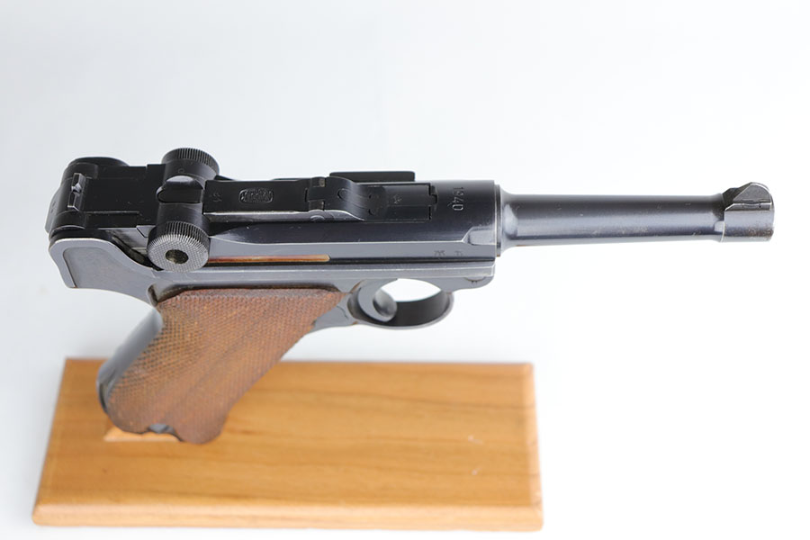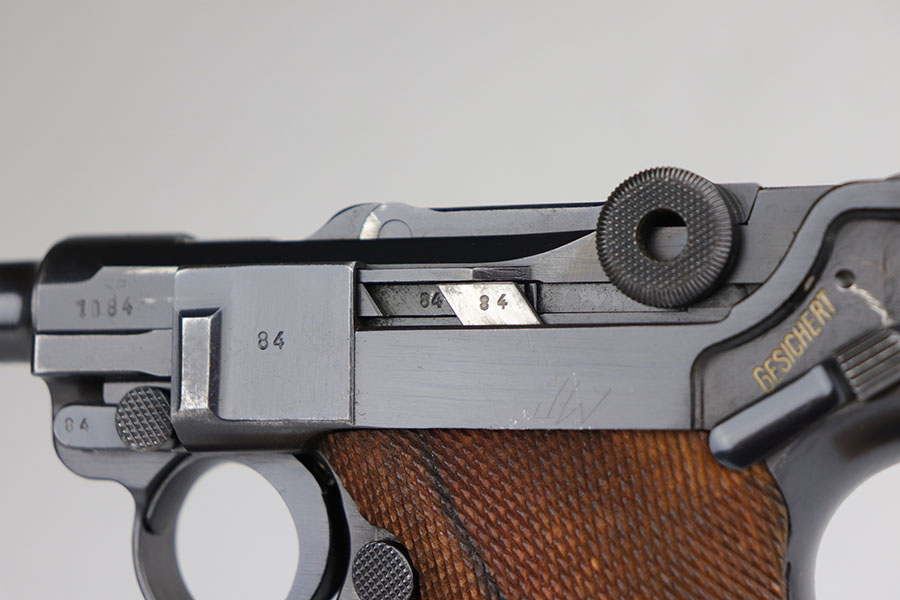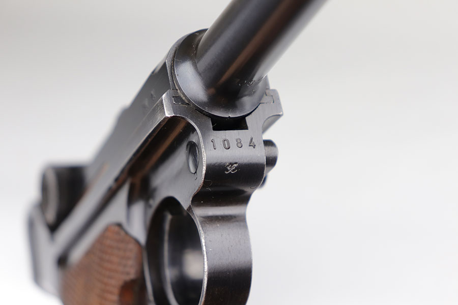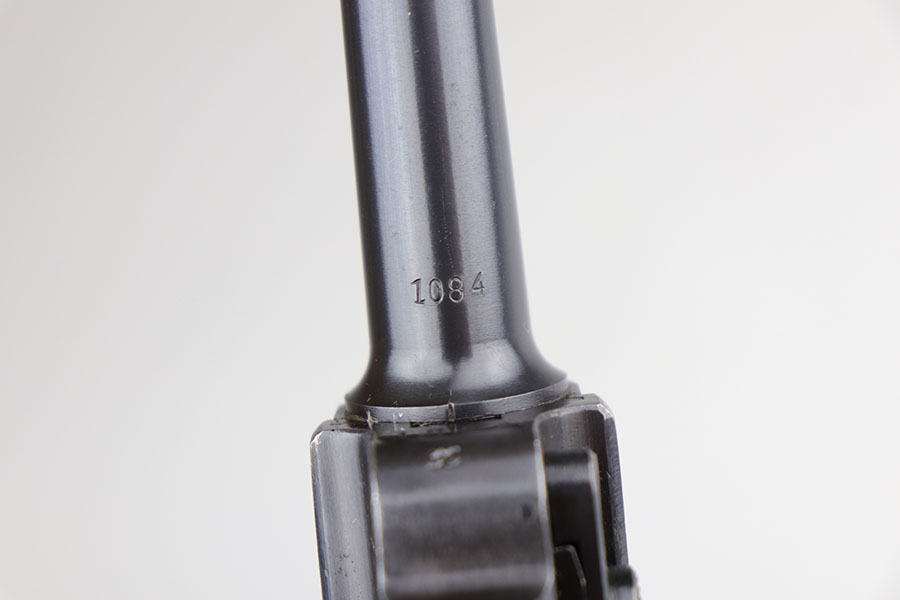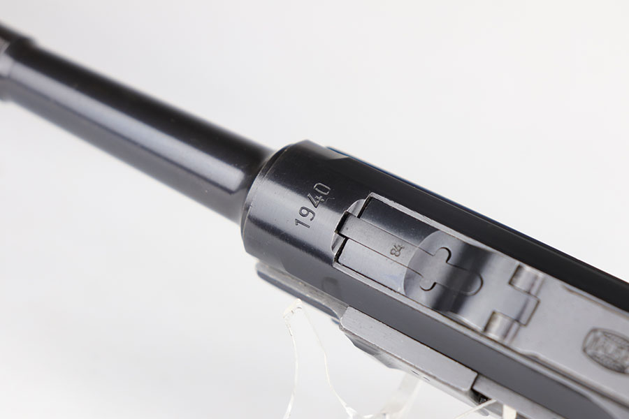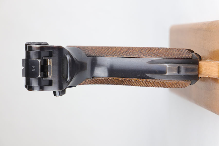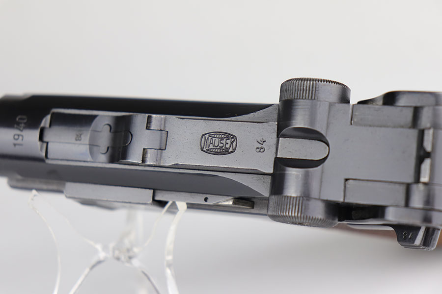 6/26/20 – This is an excellent example of a rare Mauser Luger from 1940 that was made for the commercial market but later diverted to the military. Eagle/N proofs on left side of receiver denote it was initially a commercial gun but two military acceptance proofs were later added to the right side. It’s all matching with about 97% of the original blue. There’s high edge wear on muzzle, sideplate, stock lug and right side rail. The grips are in minty condition and numbered to the gun. Magazine is period original but mismatched. Bore is shiny with strong rifling but there is a bit of freckling.