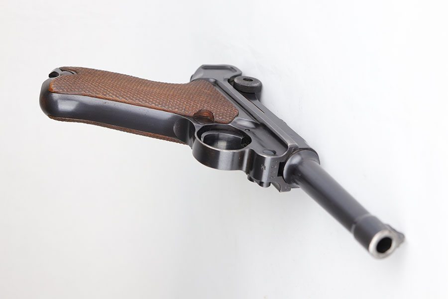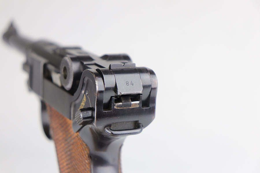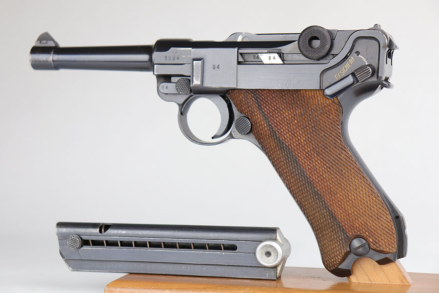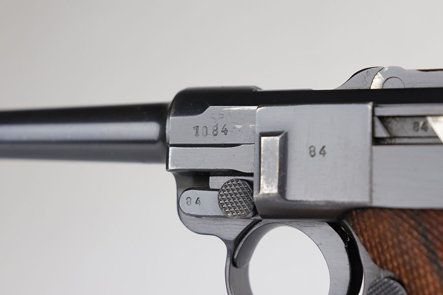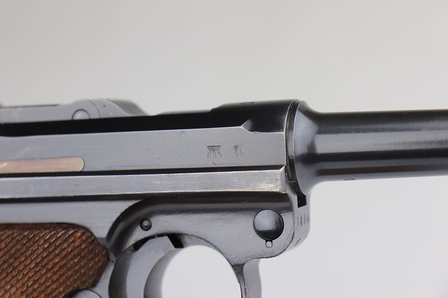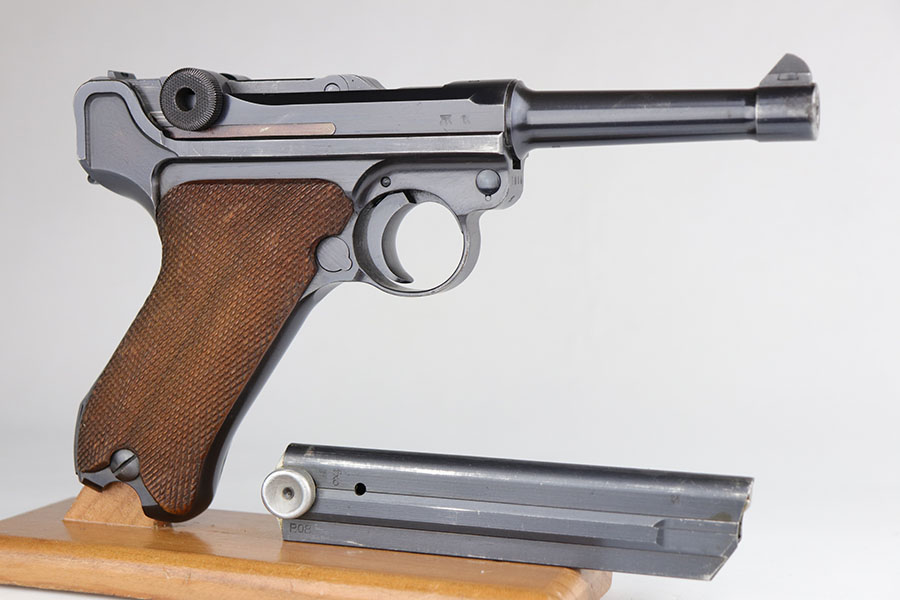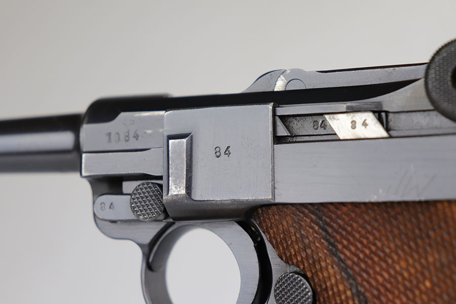 6/26/20 – This is an excellent example of a rare Mauser Luger from 1940 that was made for the commercial market but later diverted to the military. Eagle/N proofs on left side of receiver denote it was initially a commercial gun but two military acceptance proofs were later added to the right side. It’s all matching with about 97% of the original blue. There’s high edge wear on muzzle, sideplate, stock lug and right side rail. The grips are in minty condition and numbered to the gun. Magazine is period original but mismatched. Bore is shiny with strong rifling but there is a bit of freckling.