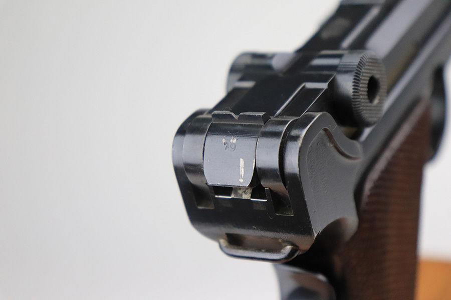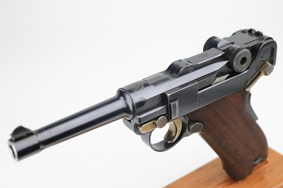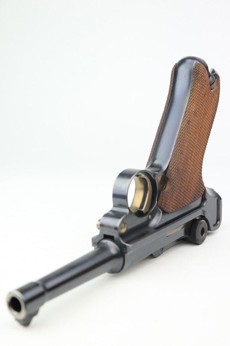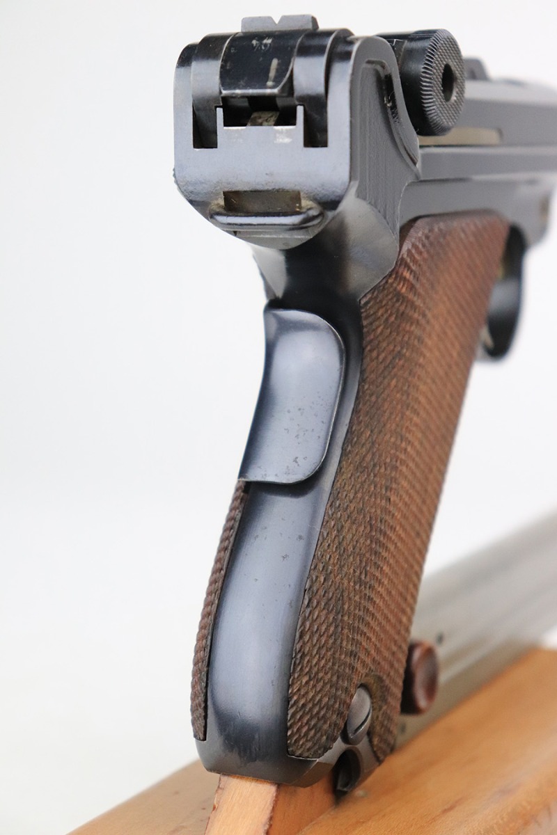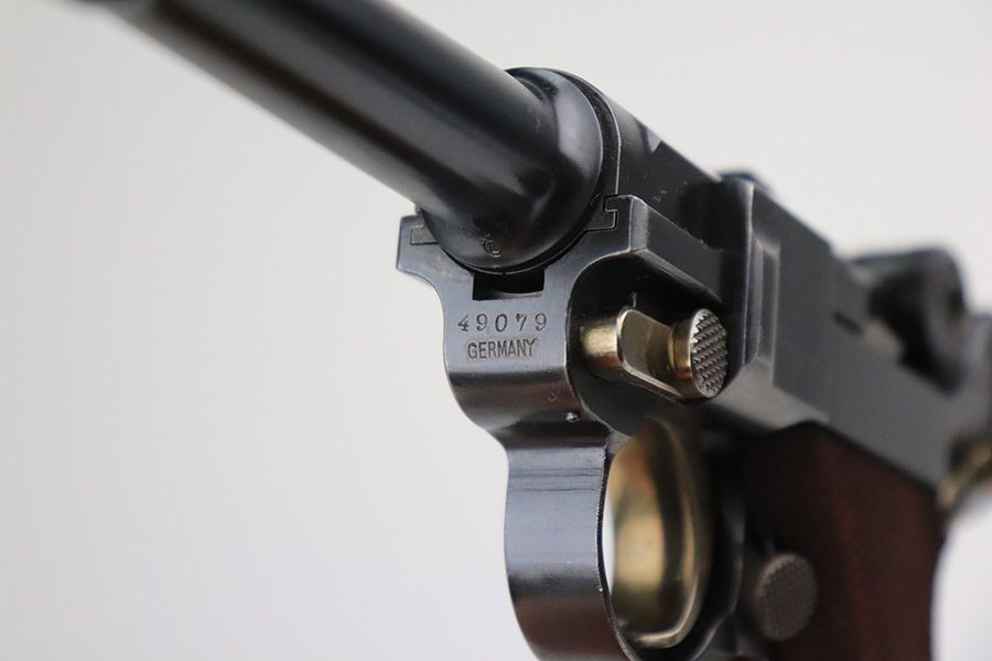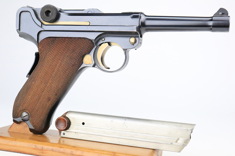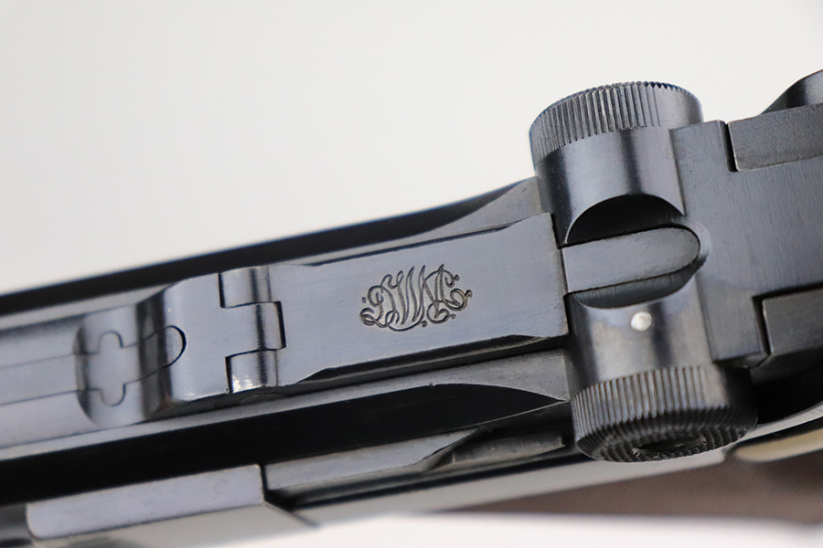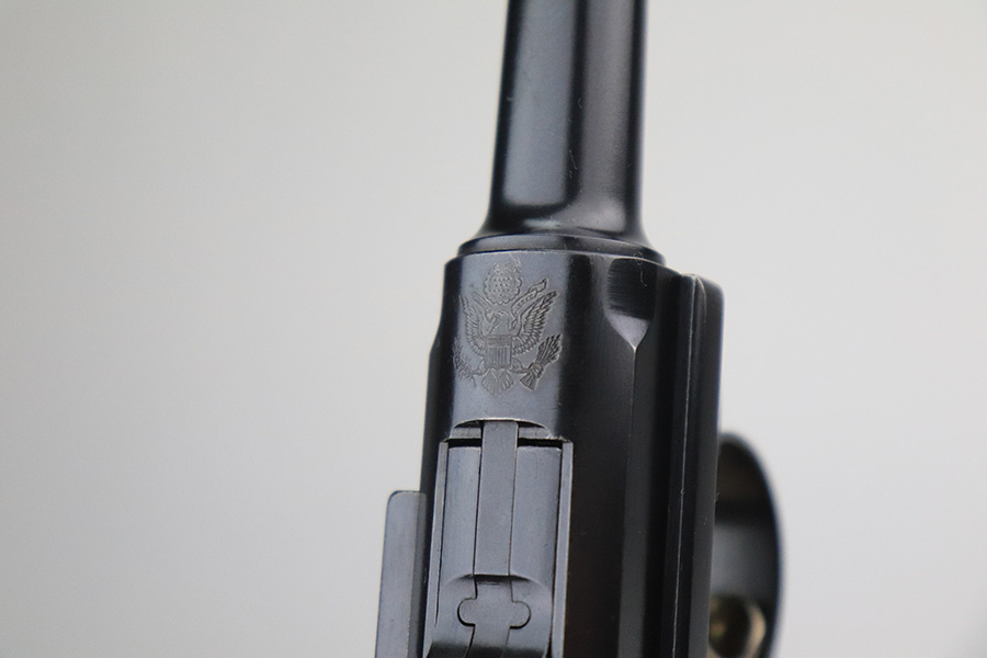 6/17/22 – This is a beautiful, original 1906 DWM Luger with American Eagle crest over chamber. It’s a scarce and desirable example as it’s chambered for 9mm Luger, one of about 3,000 produced. The original blue rates at 98% with minor high edge wear (sideplate, trigger guard, right side rail) and excellent straw. All numbered parts match. Grips and magazine are both unmarked. Strong, shiny bore.