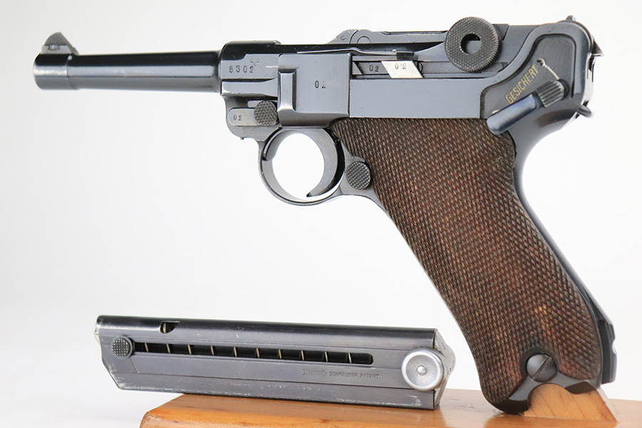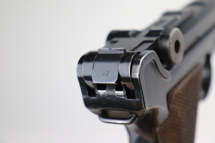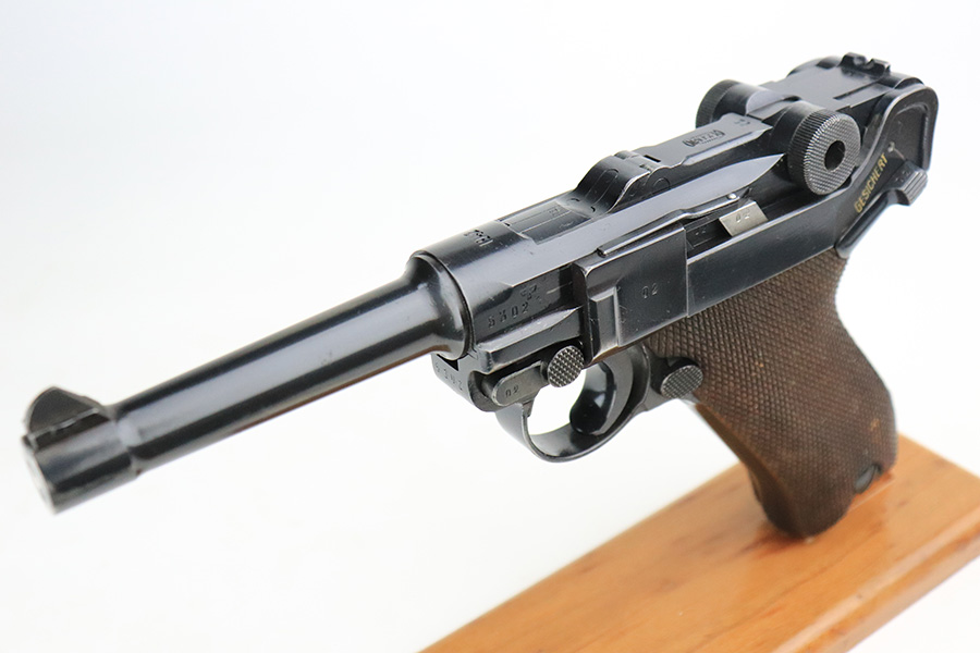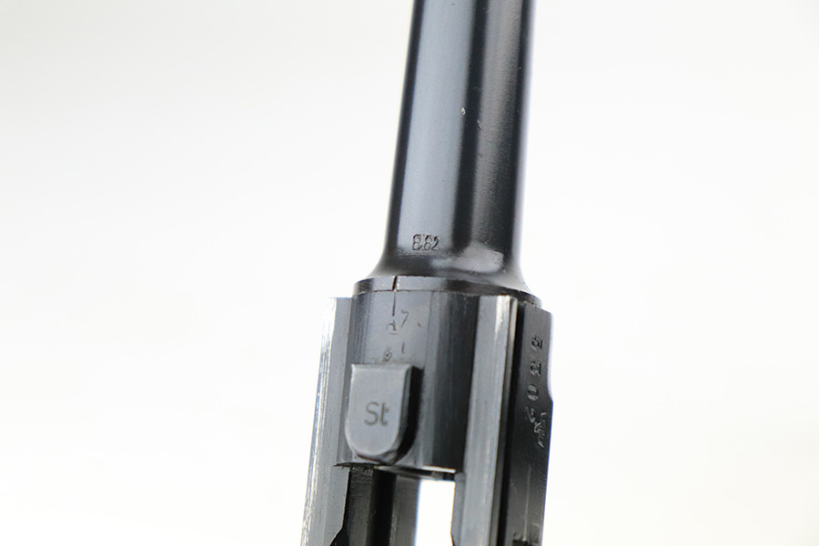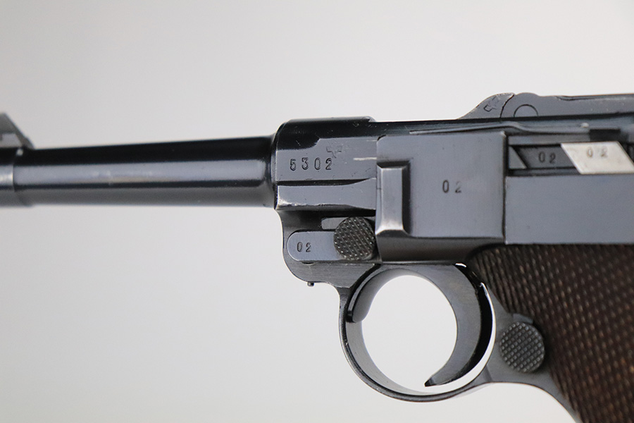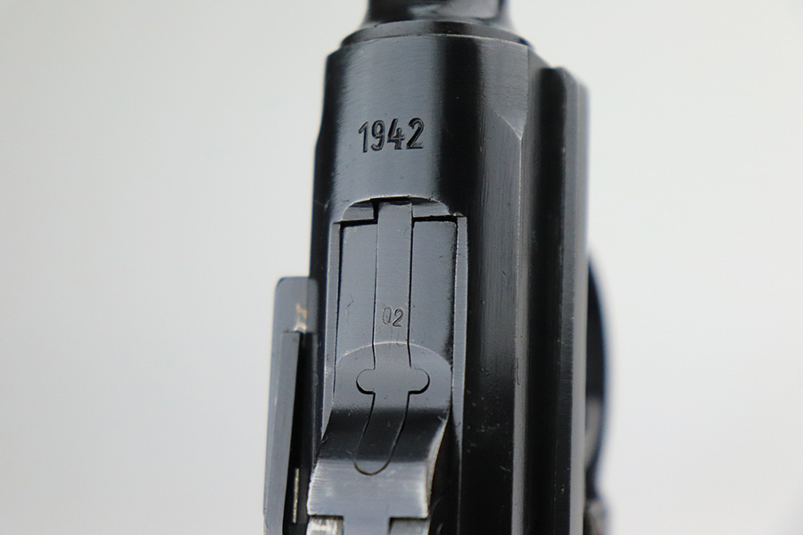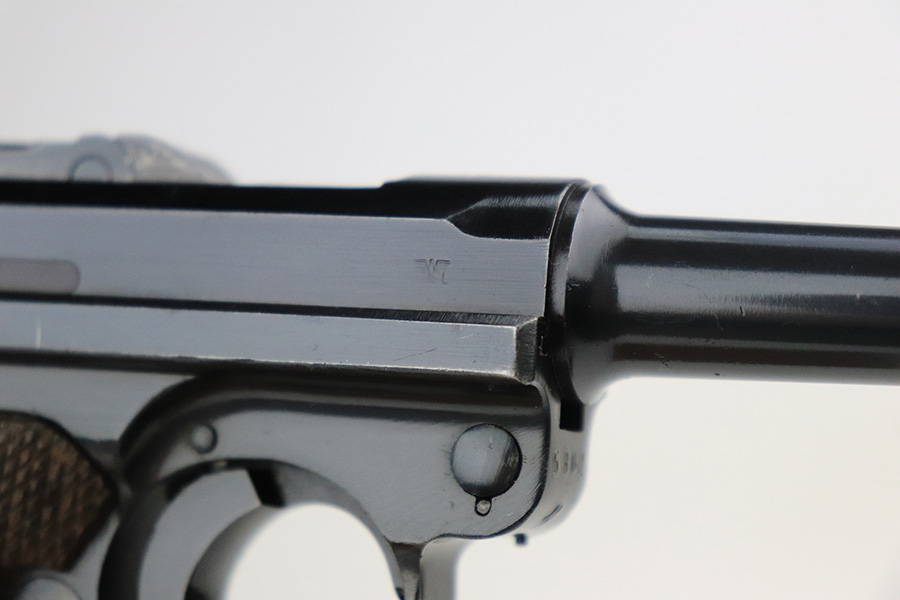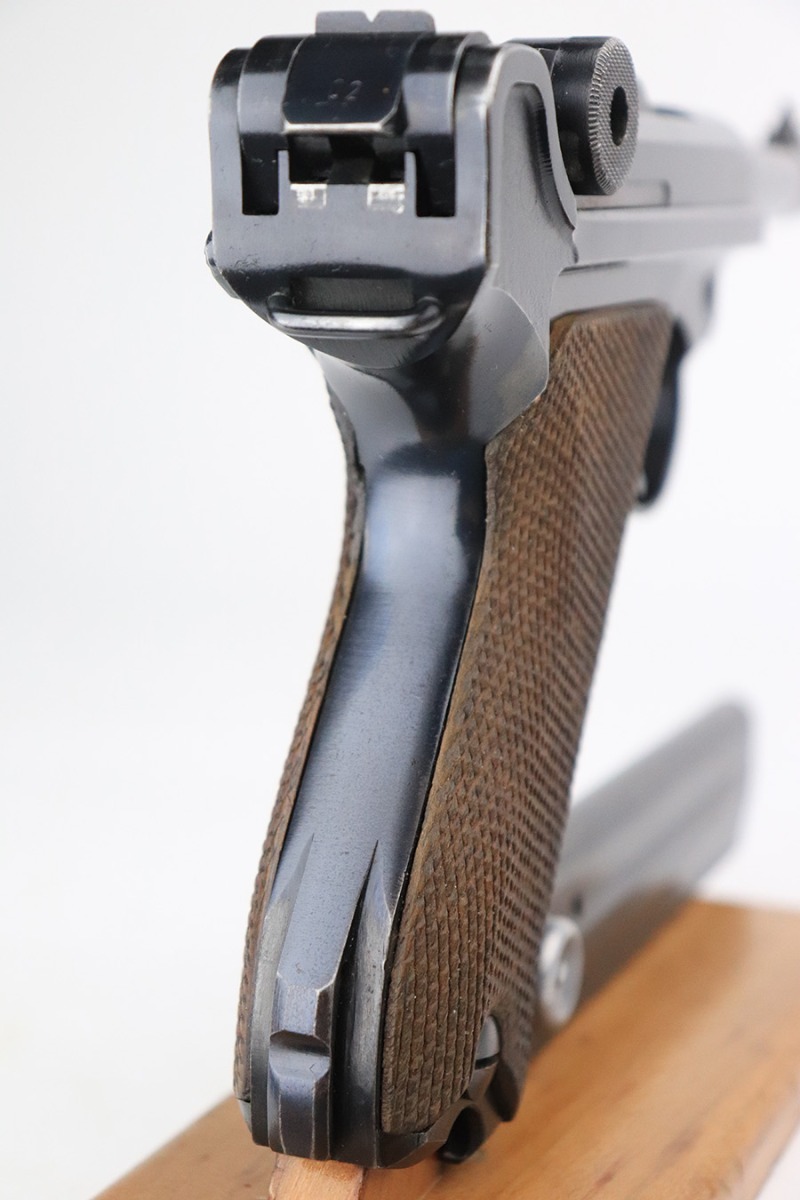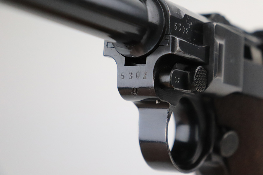 8/2/22 – This is a terrific and scarce Mauser Banner Luger from 1942. It was issued to the German police, with Eagle/L acceptance proof on receiver. All matching numbered parts, including the magazine. Unnumbered grips. About 97-98% of the original blue remains with just a little wear on the sideplate and around the muzzle. The bore is mint, looks like it’s barely been used. The grips fit snugly and have sharp checkering with very little handling wear.
