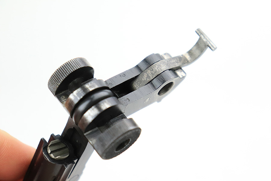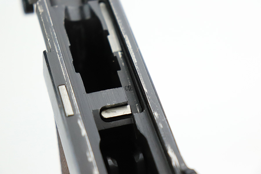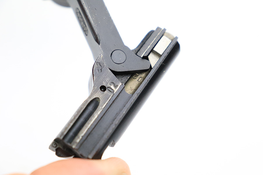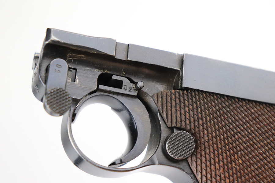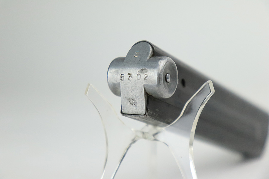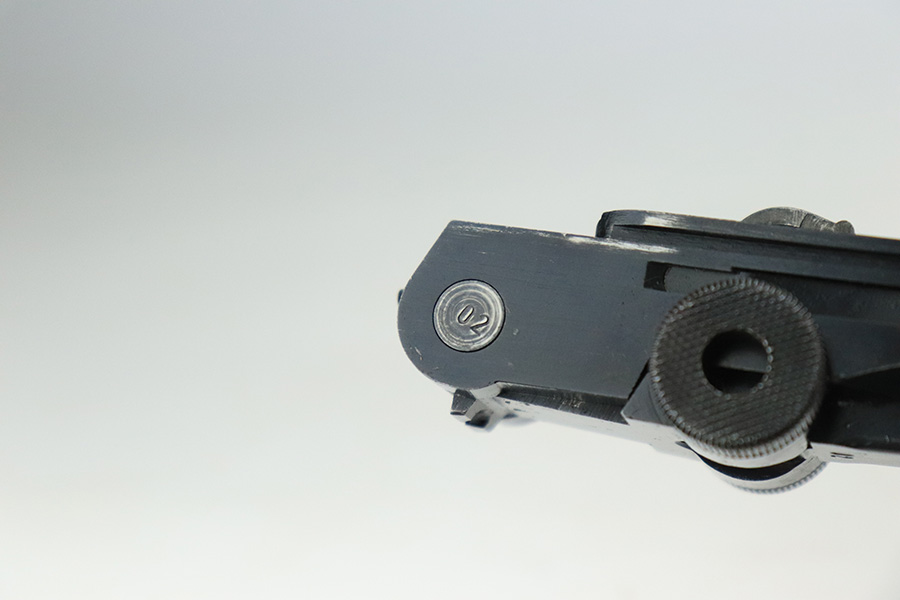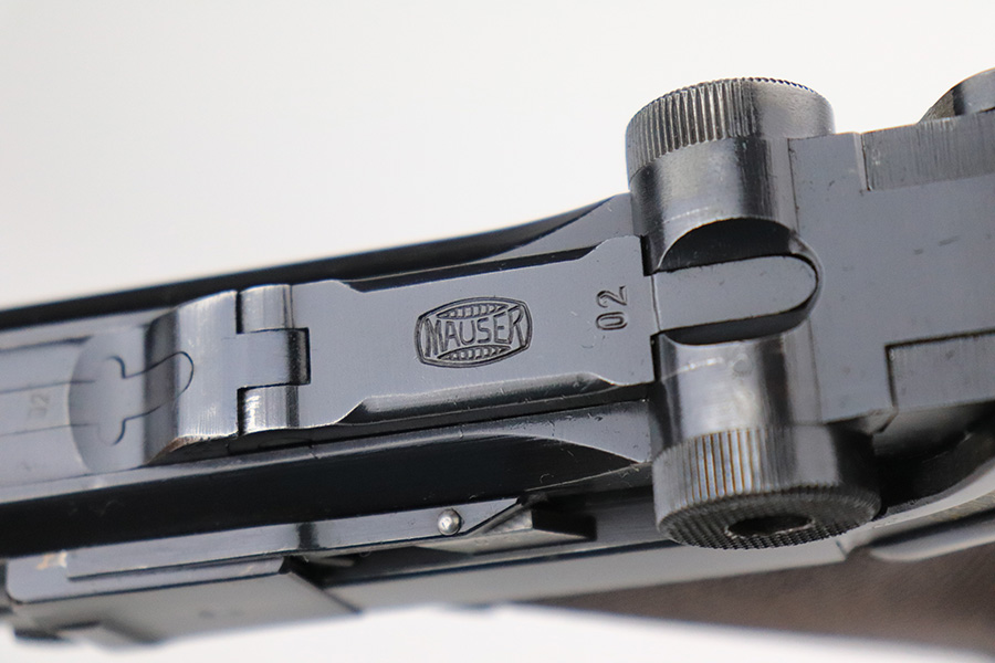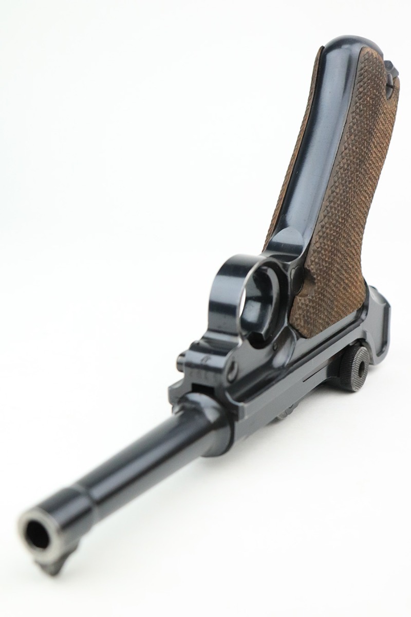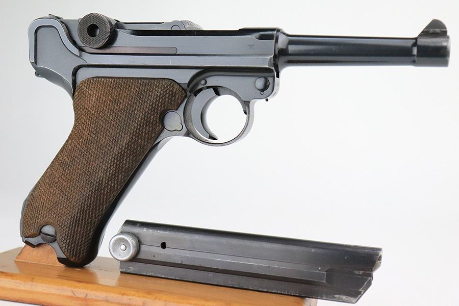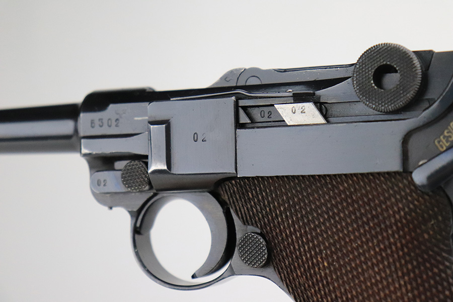 8/2/22 – This is a terrific and scarce Mauser Banner Luger from 1942. It was issued to the German police, with Eagle/L acceptance proof on receiver. All matching numbered parts, including the magazine. Unnumbered grips. About 97-98% of the original blue remains with just a little wear on the sideplate and around the muzzle. The bore is mint, looks like it’s barely been used. The grips fit snugly and have sharp checkering with very little handling wear.