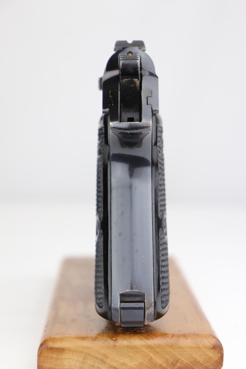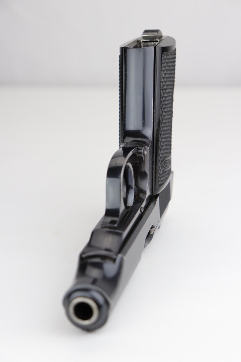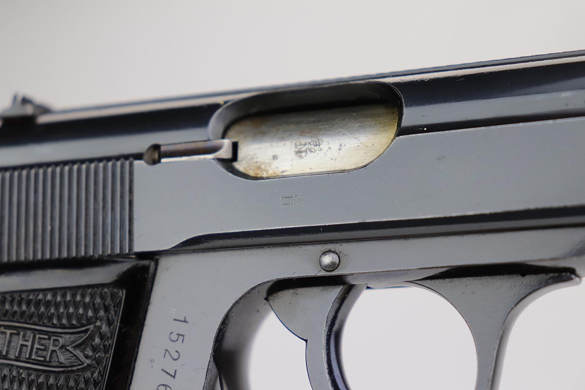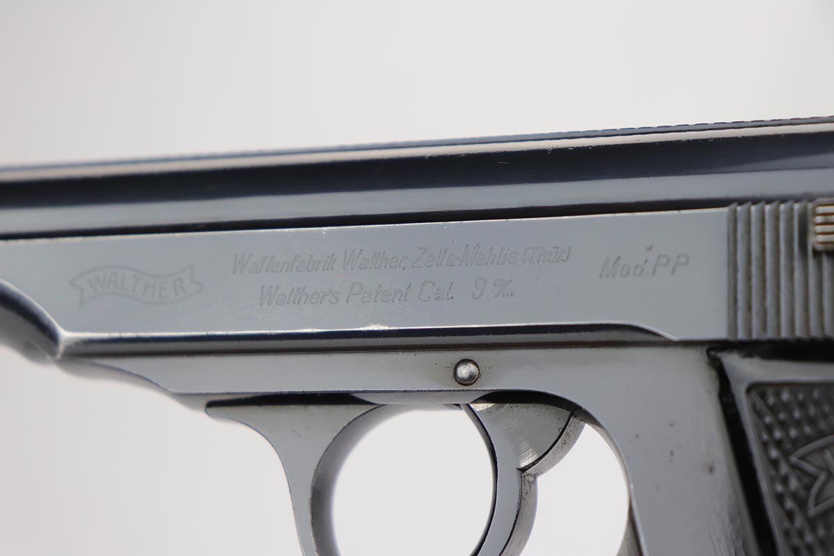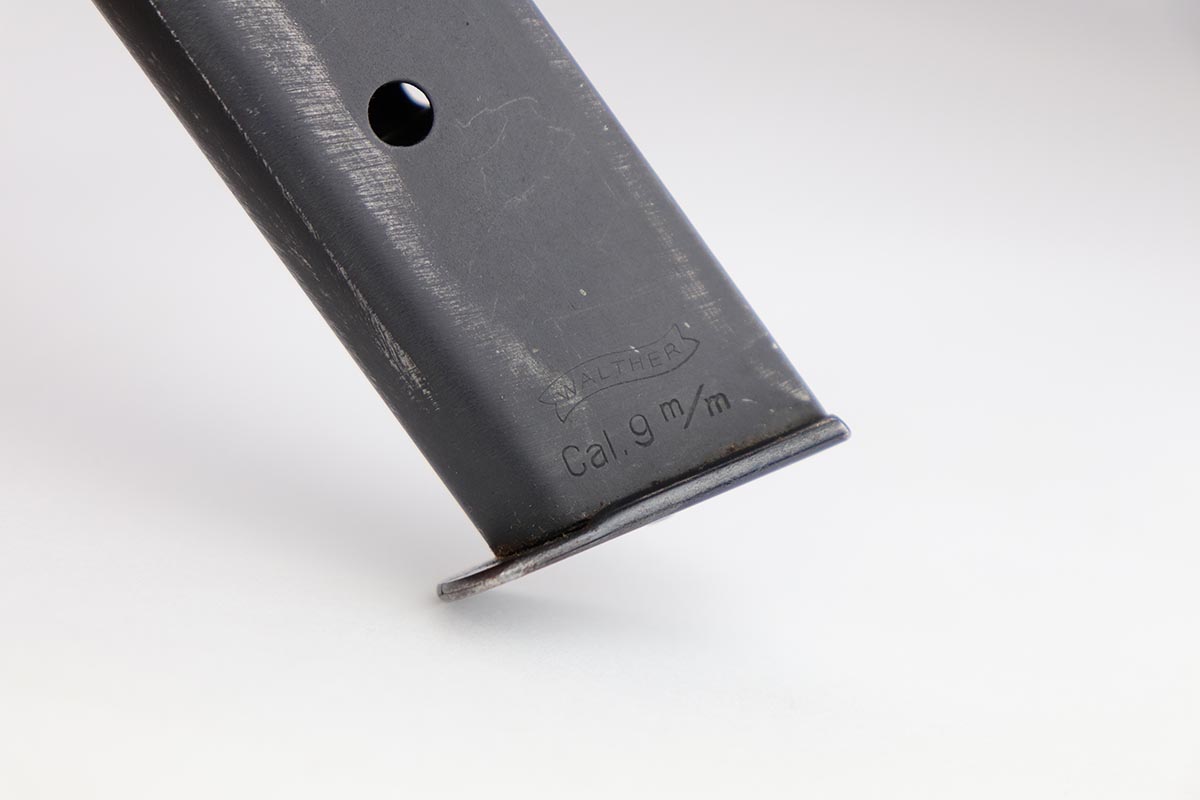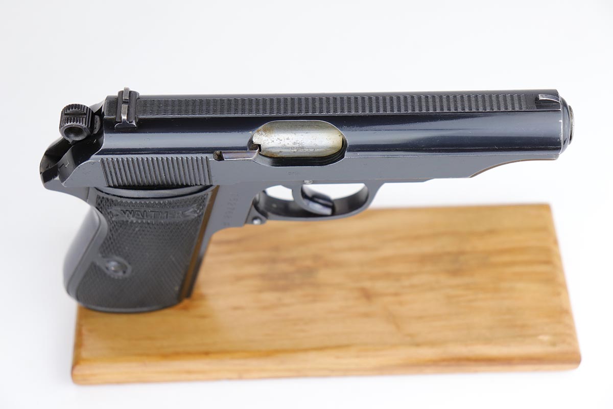 9/26/19 – This is a fantastic example of a Walther PP from the Nazi era that’s chambered in the less common but often more desirable 9mm kurz. It has about 98% of the original, high-polish blue. There’s only very minor high point wear on the slide, and a small area of finish loss on the bottom of the frame, just above the mag release. Correct magazine is present and in great condition. Excellent grips and a mint bore. One of the better examples we’ve encountered in a while.