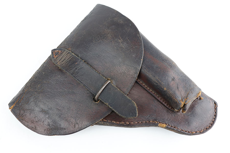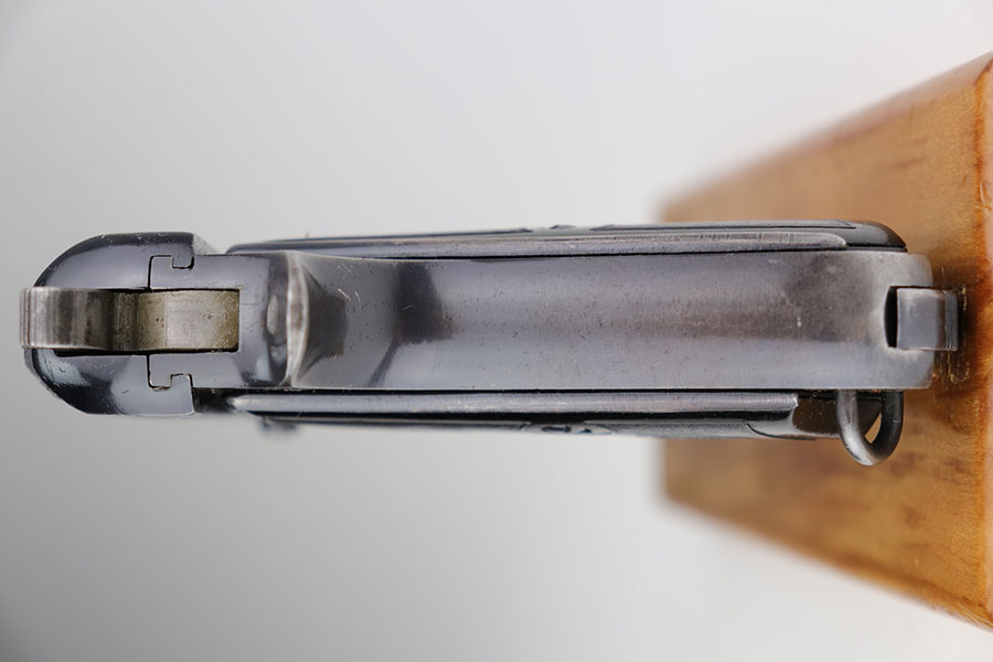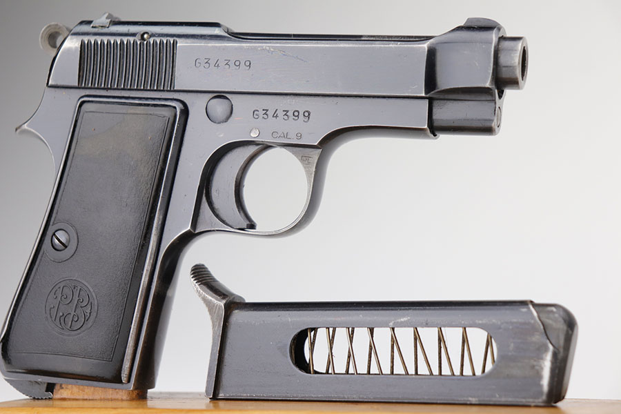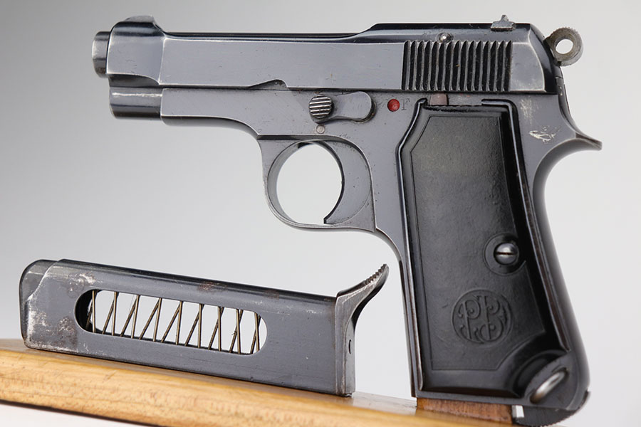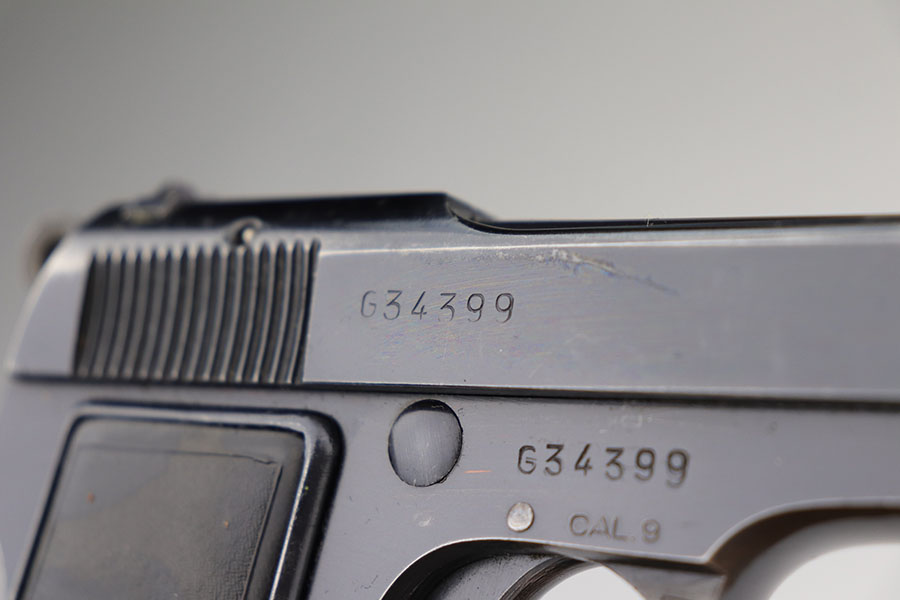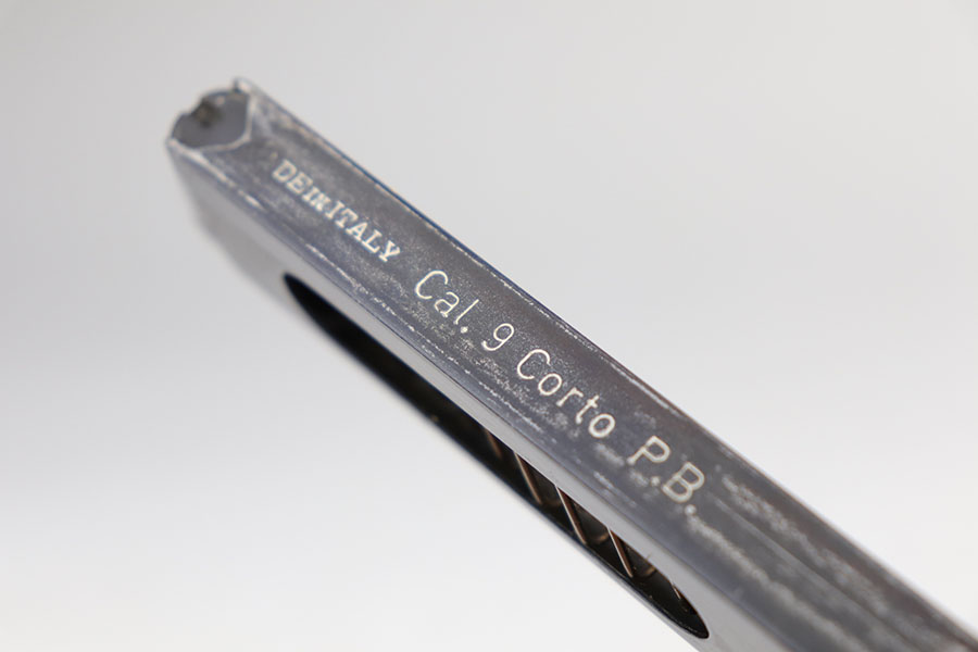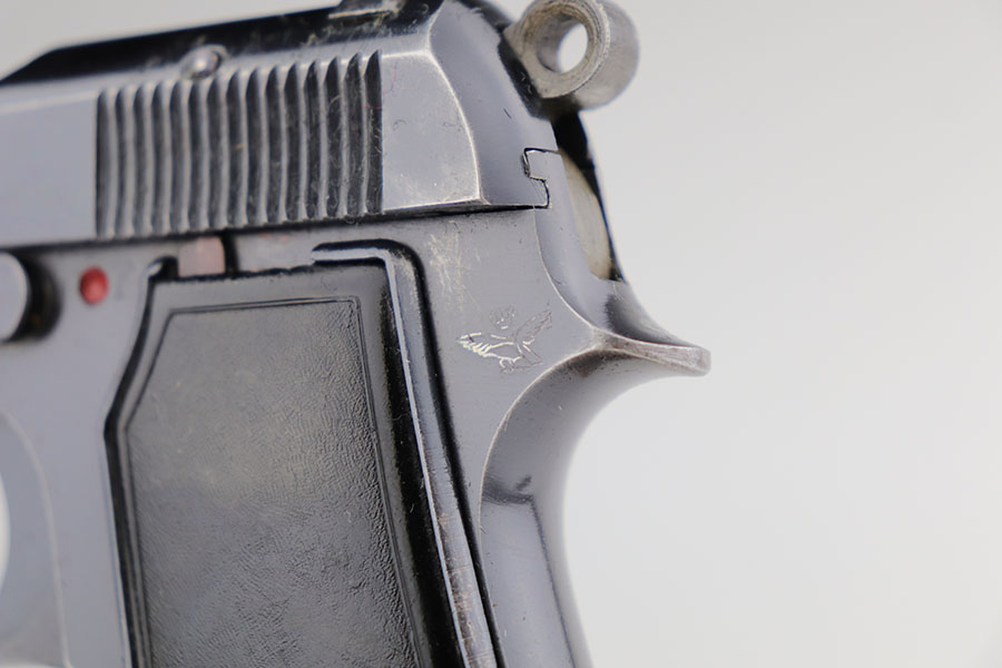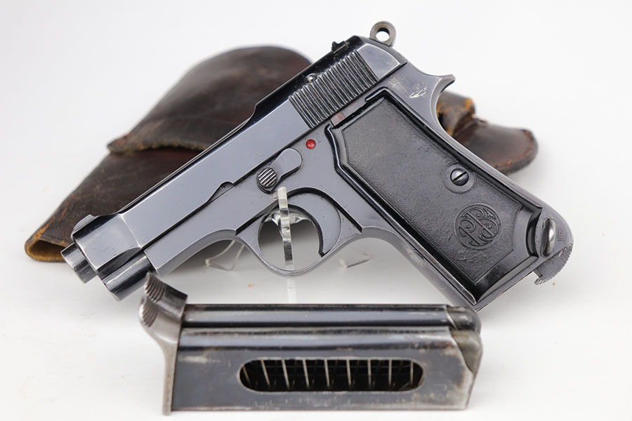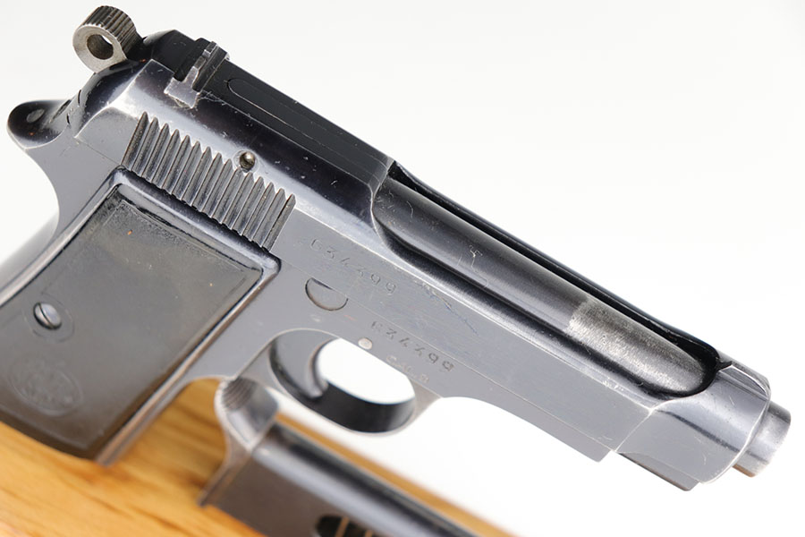2/11/21 – This is a scarce Beretta M1934 rig that was issued to the Italian Air Force in 1944. The pistol is all matching and original with blank slide legend, and Air Force acceptance on left side of frame. It has an excellent profile view, but most of the wear is on the grip straps. Terrific bore and grips. Includes a total of two original magazines. Rig includes an original but worn holster with a few holes.