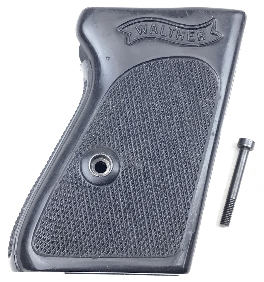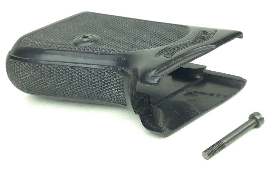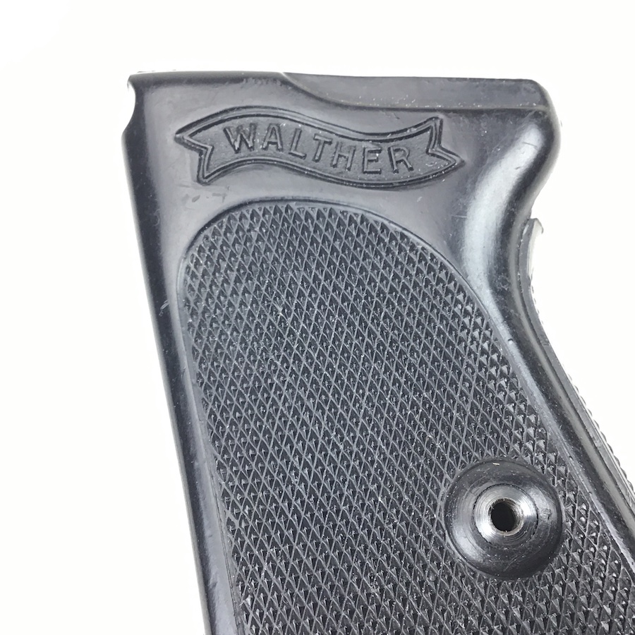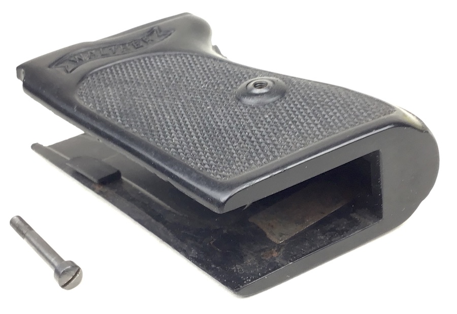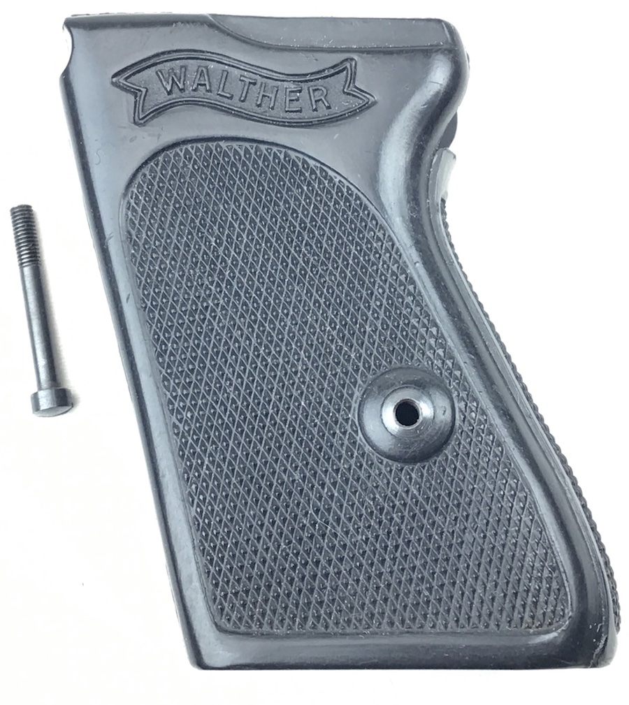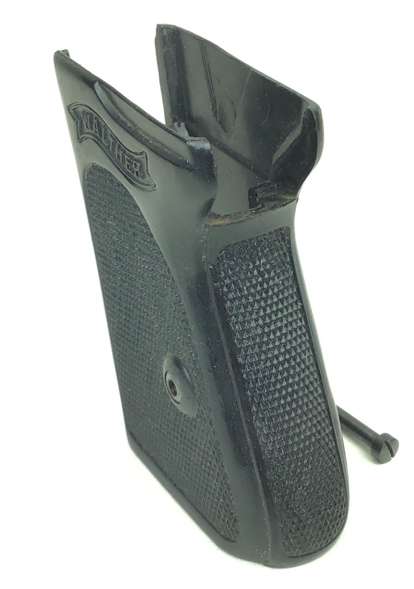 2/25/20 – Original and scarce, one piece, black PPK grips. Includes original screw. No chips or cracks. No warping. Nice, distinct checkering and Walther logo. Screw in excellent condition as well.