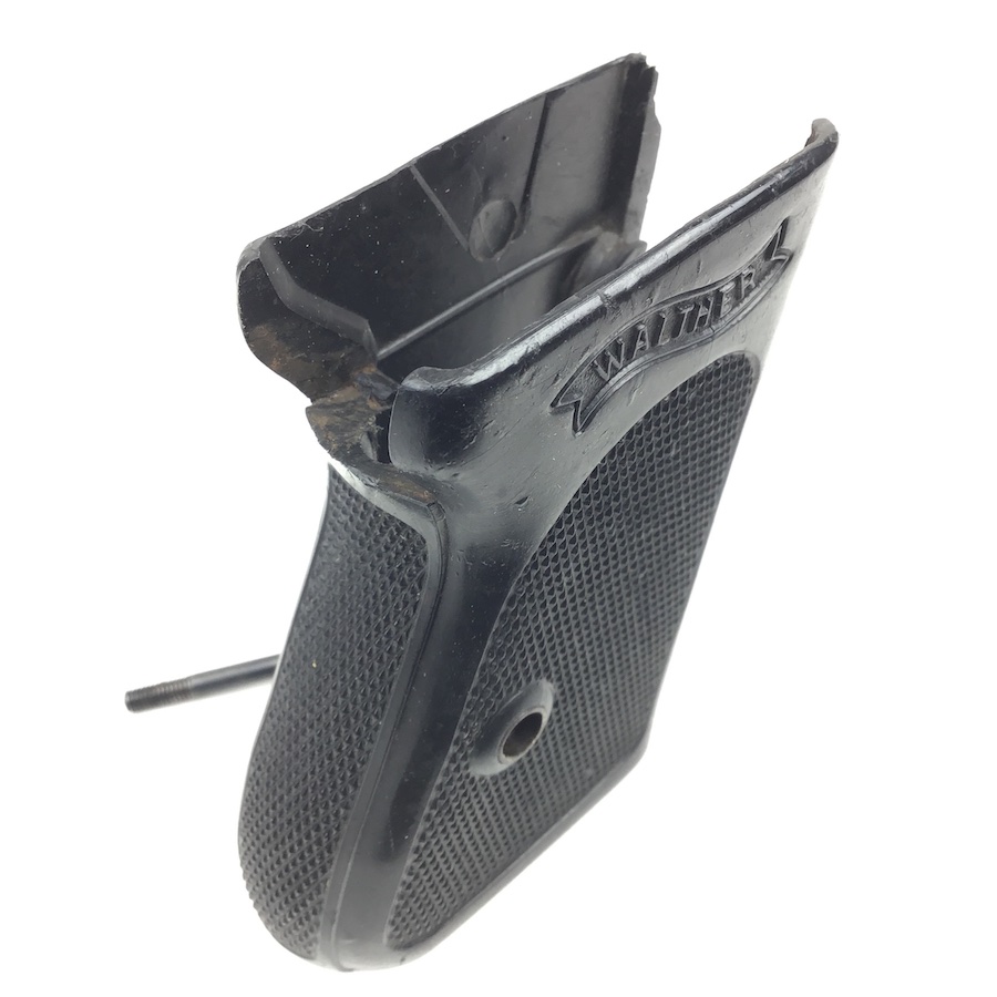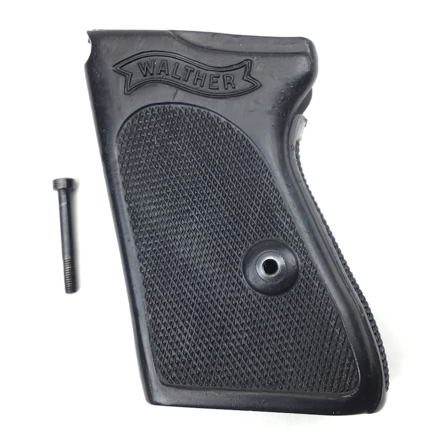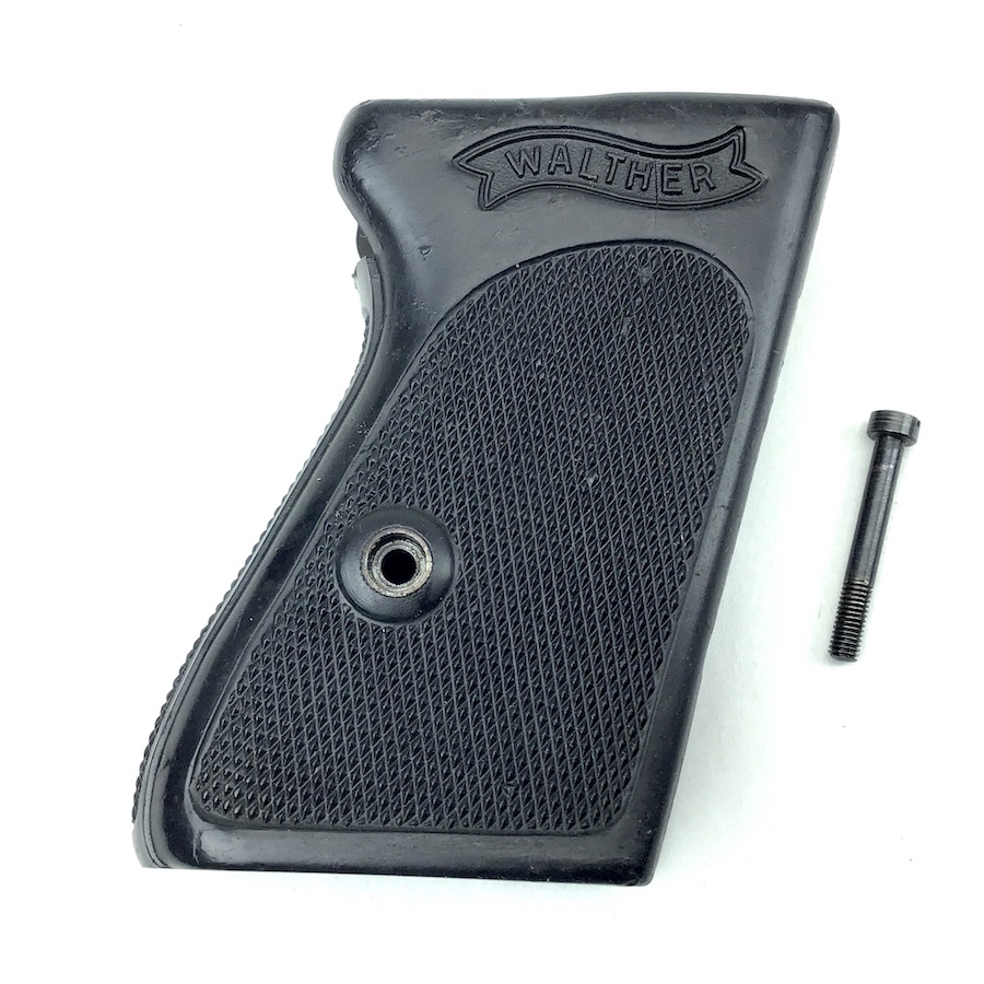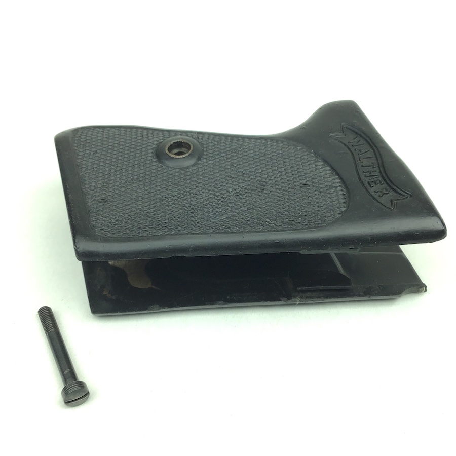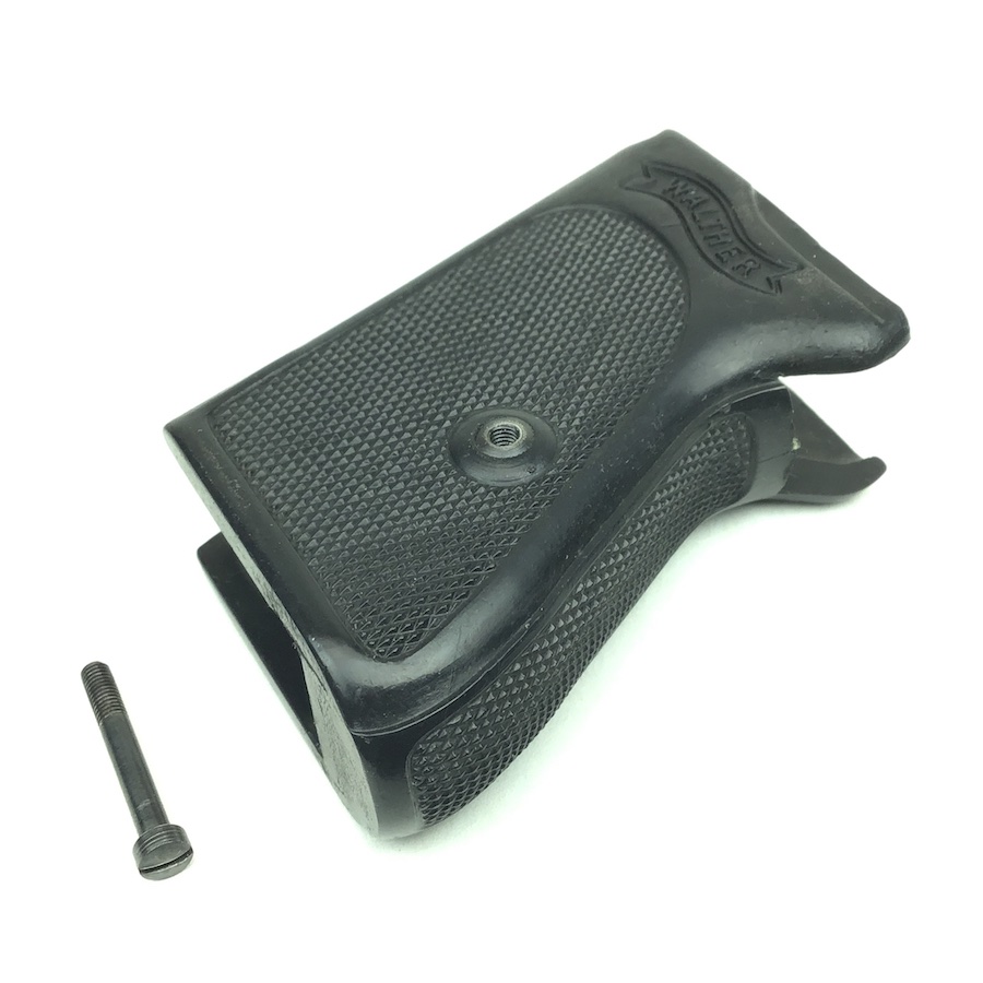3/5/20 – Original and scarce, one piece, black PPK grips. Includes original screw. No chips or cracks. No warping. Nice, distinct checkering and Walther logo. Screw in excellent condition as well.