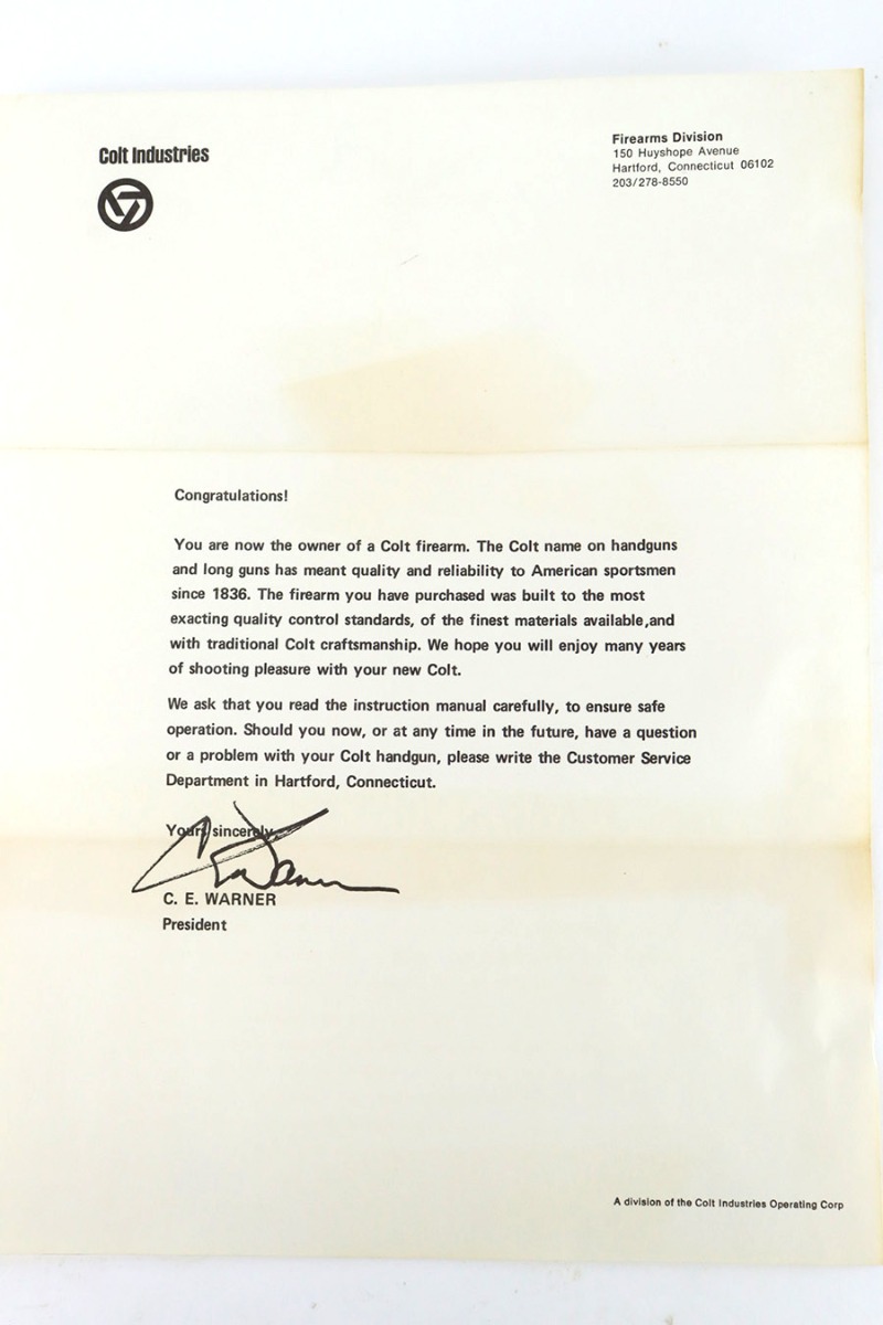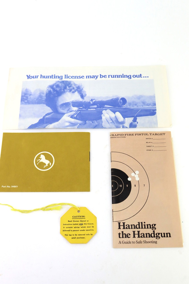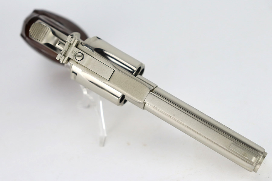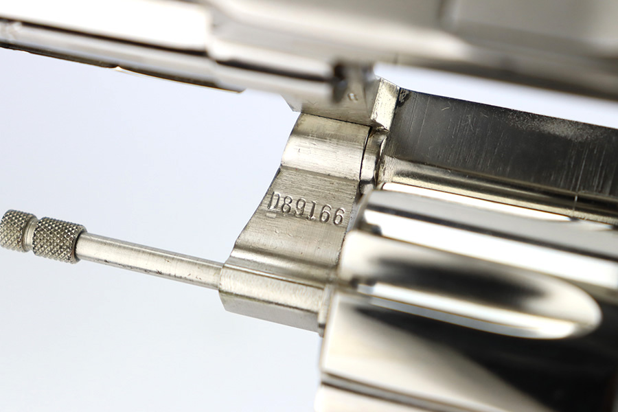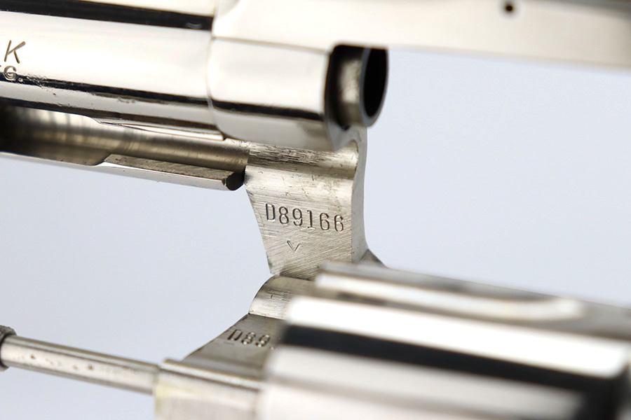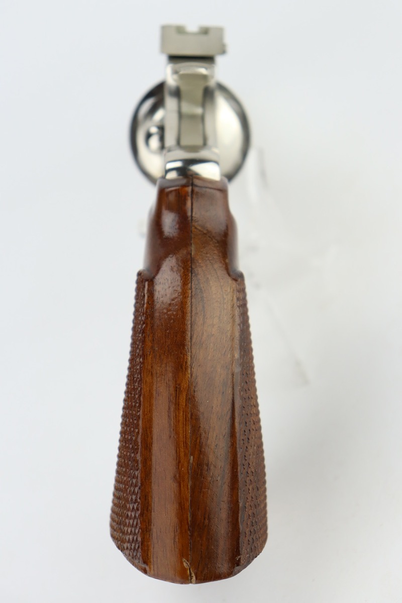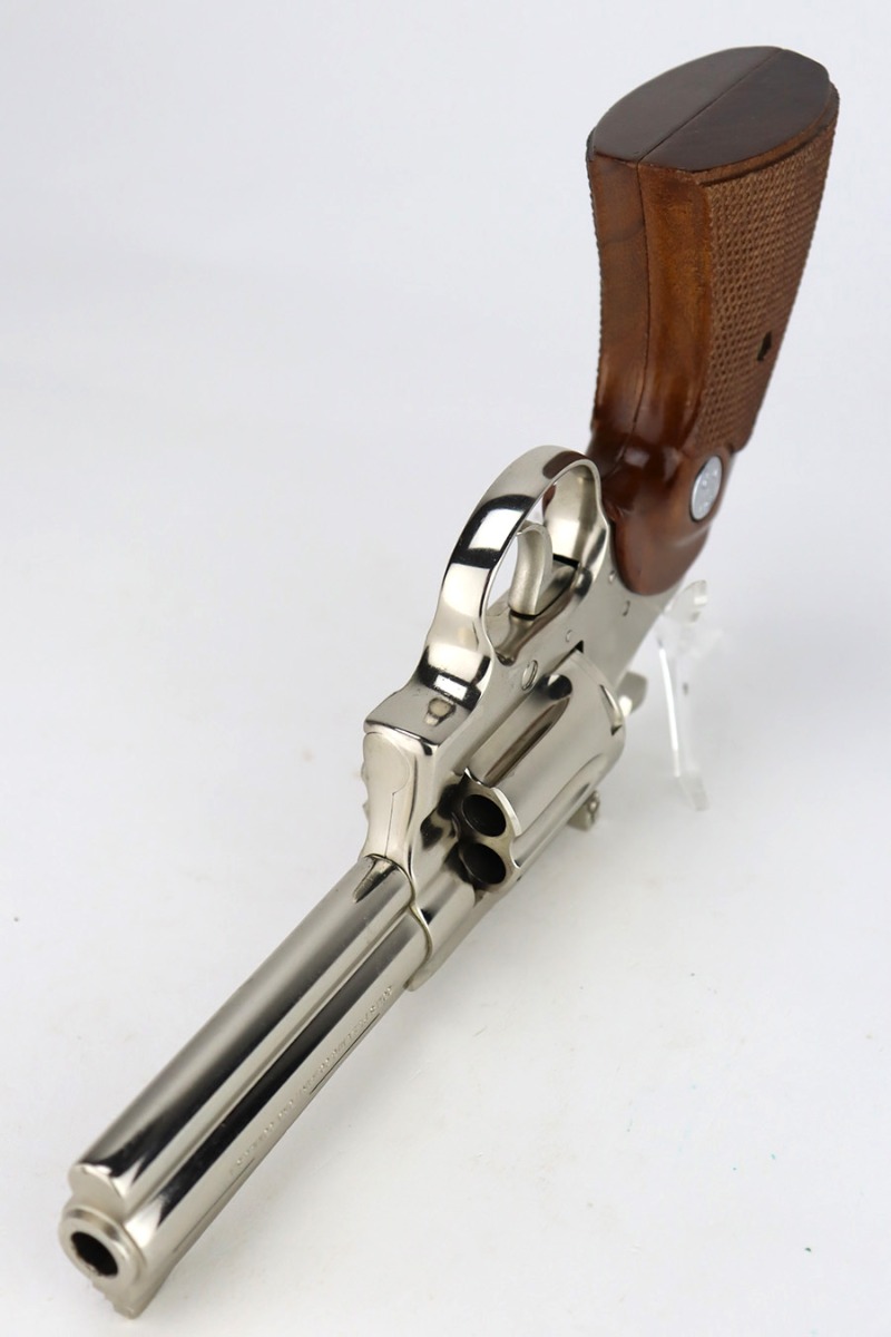 12/15/23 – This is a scarce nickel-plated Colt Diamondback revolver from 1976. Chambered in .38 Special with a 4″ barrel. It comes with its original matching box, sales papers, and owners manual. The only sign of wear on the gun is a very light roll mark on the cylinder. Excellent checkered wood grips. Like-new bore.