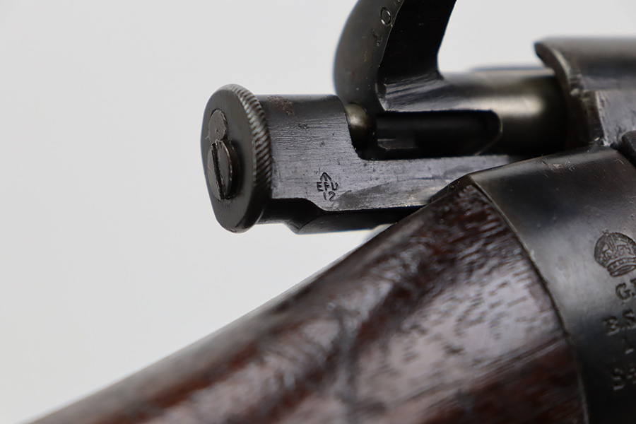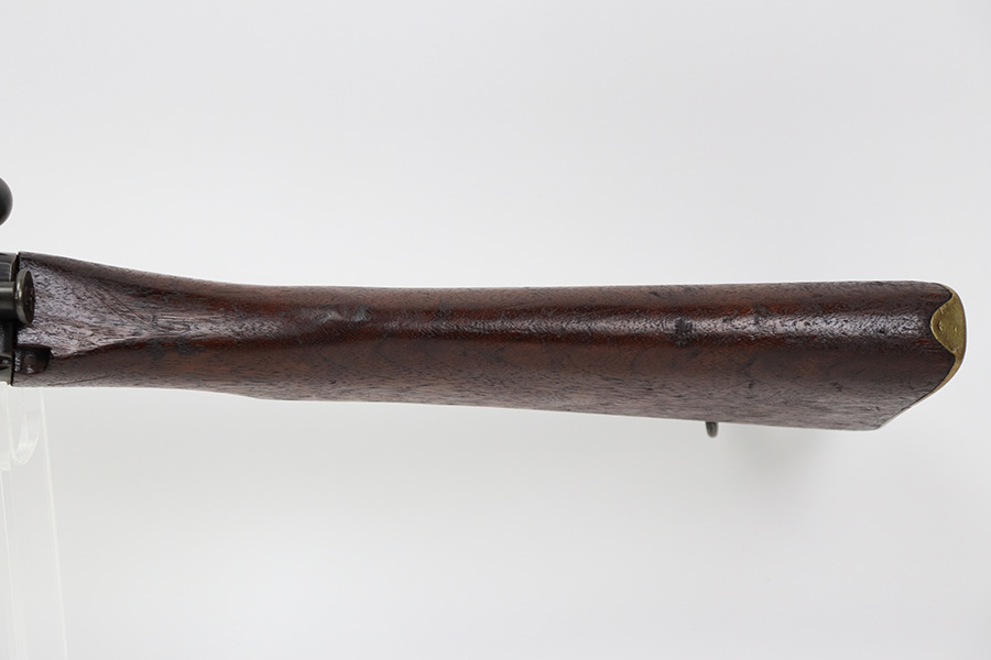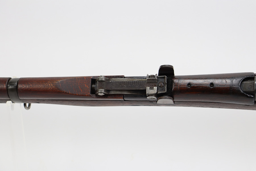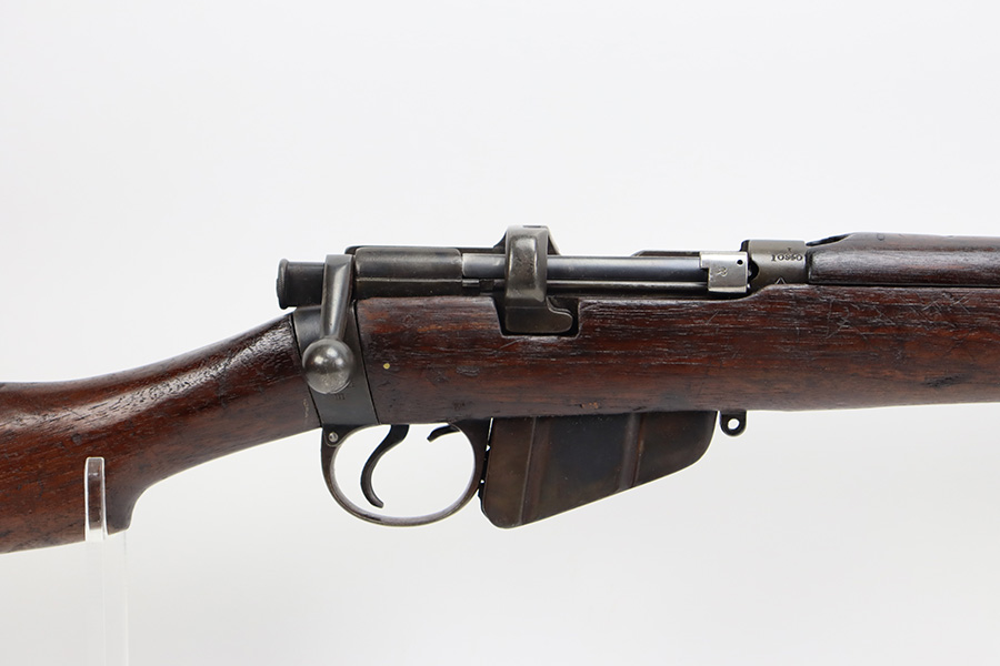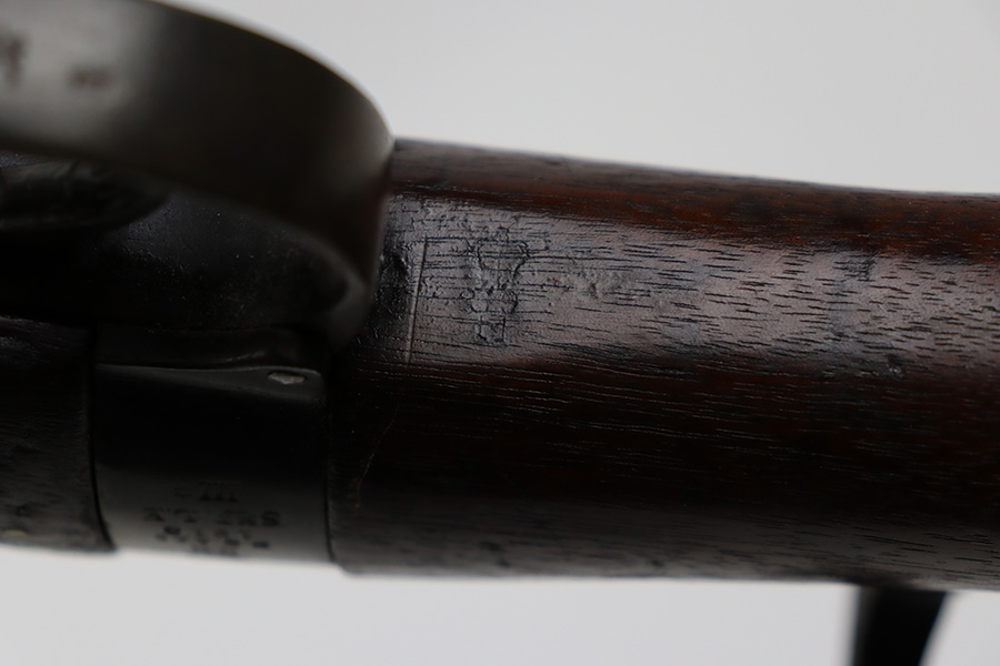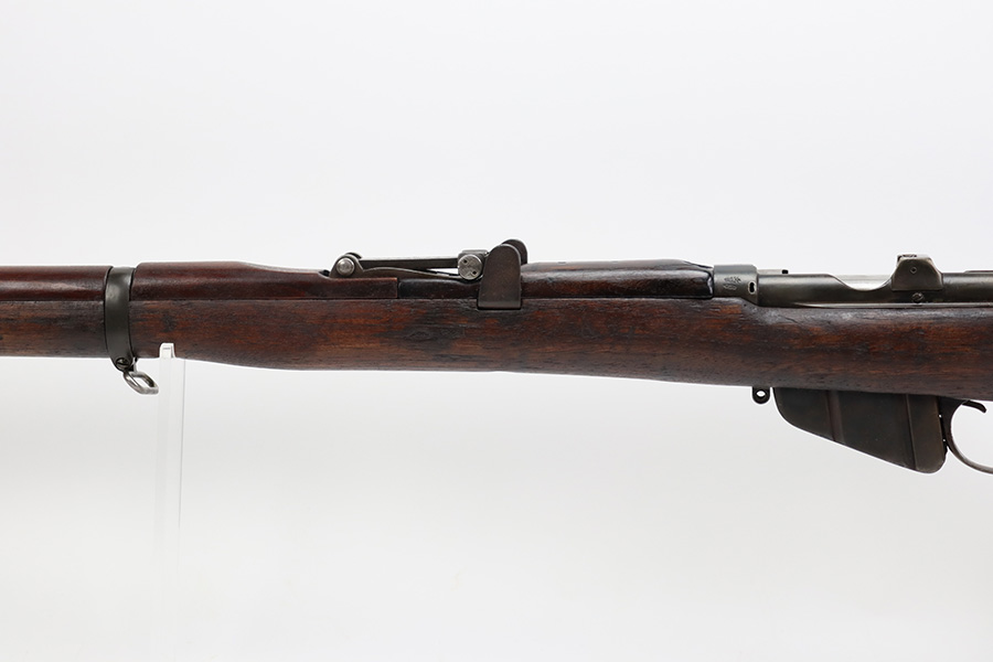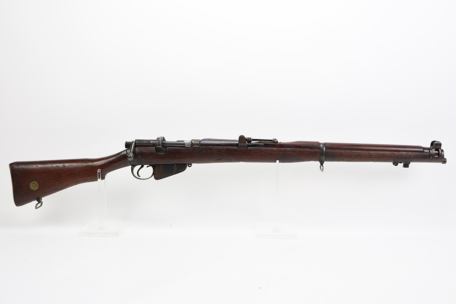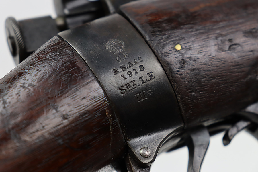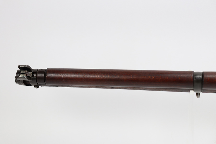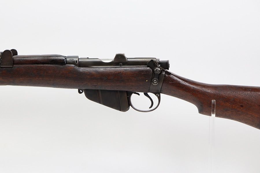 7/18/23 – This is a scarce BSA SHTLE III that was made in 1916 and then later arsenal rebuilt for WWII. Matching numbers on receiver, bayo lug, bolt and stock. Receiver is dated to 1918, and the top of the receiver shows the Iarqi proof, as does the stock disc. The rifle was refinished during the arsenal rebuild and shows patina on the metal parts. Bore has strong rifling but frost throughout. Stock is in good condition with a few dings and nicks but no structural issues.
