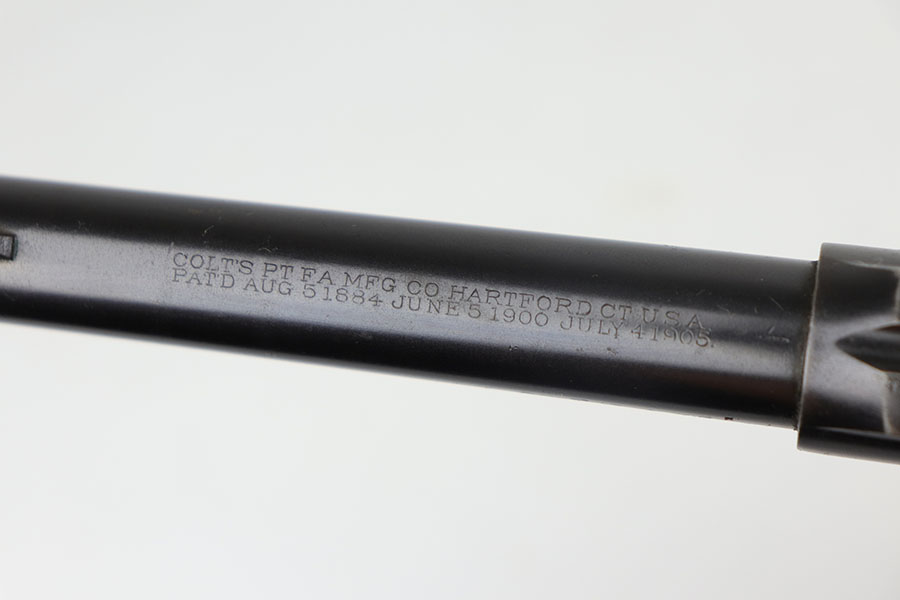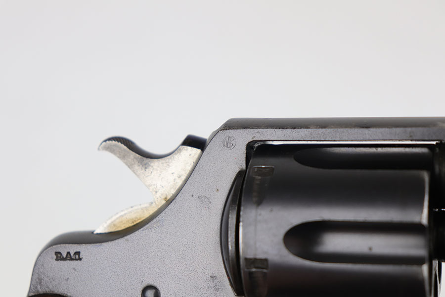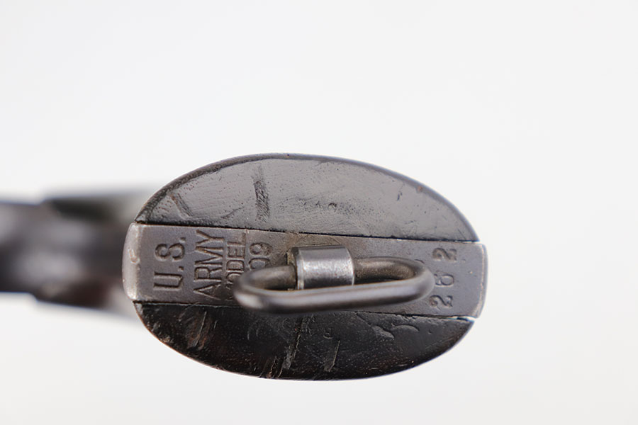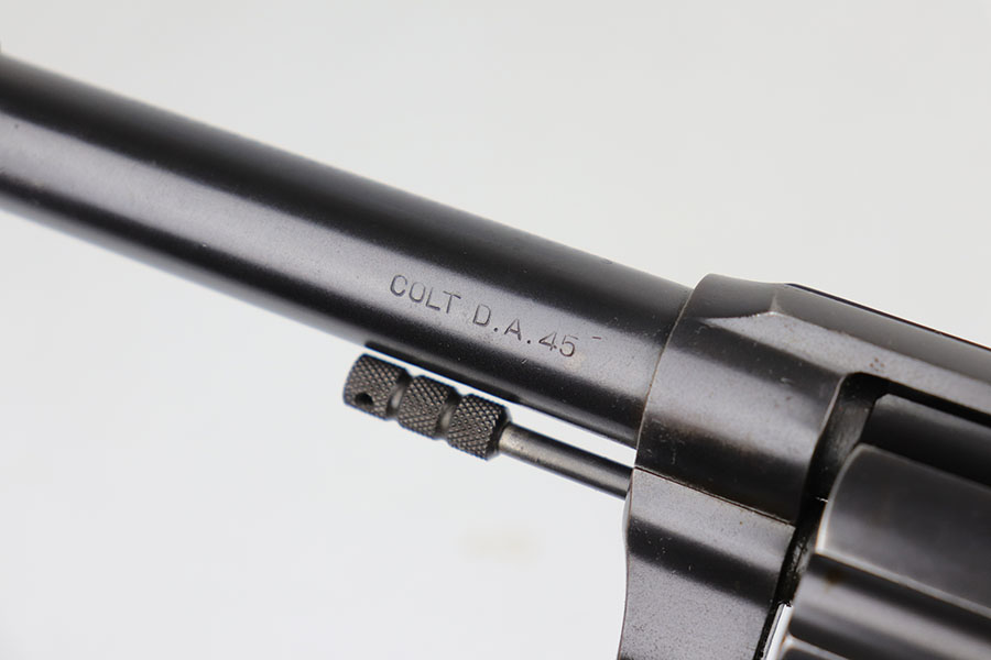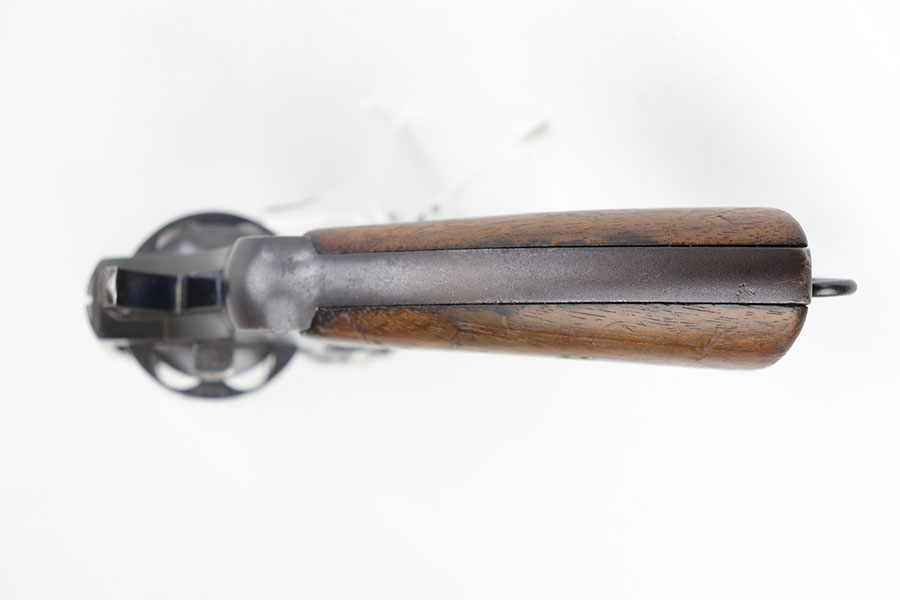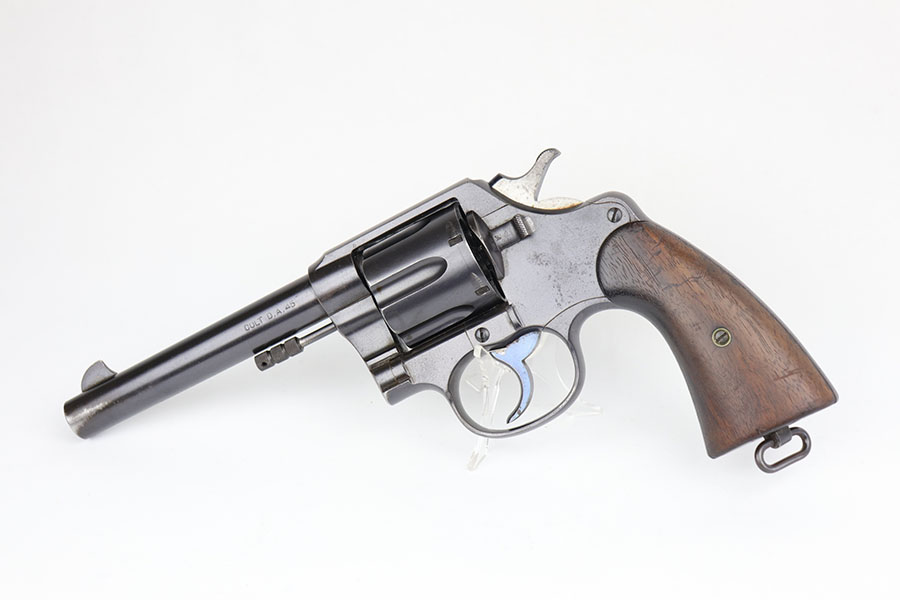 7/14/20 – This is a scarce Colt Army Model 1909 revolver that was produced in 1911. Beginning in 1899, combat reports from the Philippines campaign showed that the .38 caliber bullets repeatedly failed to stop Moro fighters, even when shot multiple times at close range. The complaints caused the U.S. Army to hurriedly re-issue the now retired .45 caliber Colt Single Action Army revolvers with newly shorten 5½” barrels. These old war horses handily stopped the kris and bolo wielding fighters and played a central role in the Army’s decision to replace the M1892 with the .45 caliber New Service revolver in 1909, and also played a key role in the Army’s decision to adopt the .45 ACP M1911 Colt pistol. This particular example is original with RAC inspector marks on both grip panels, the frame, cylinder and barrel. Barrel is also United States Property marked on the underside. The profile shows minimal finish loss but does have some oxidation throughout. The rest of the bluing loss is on the grip frame. Minty bore and smooth mechanically. The grips show some scratches but no cracks or chips.