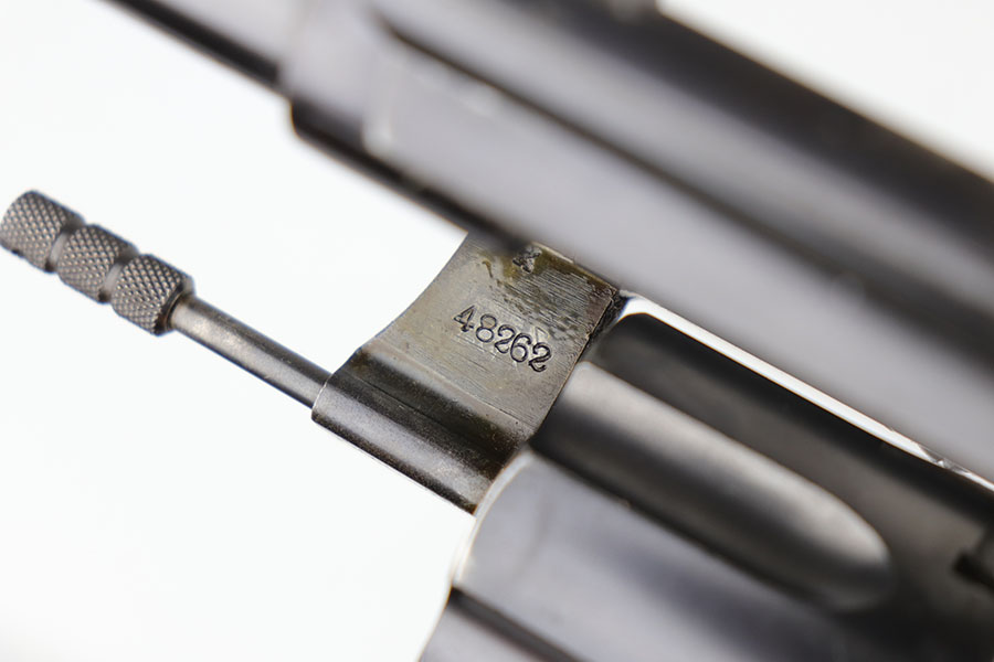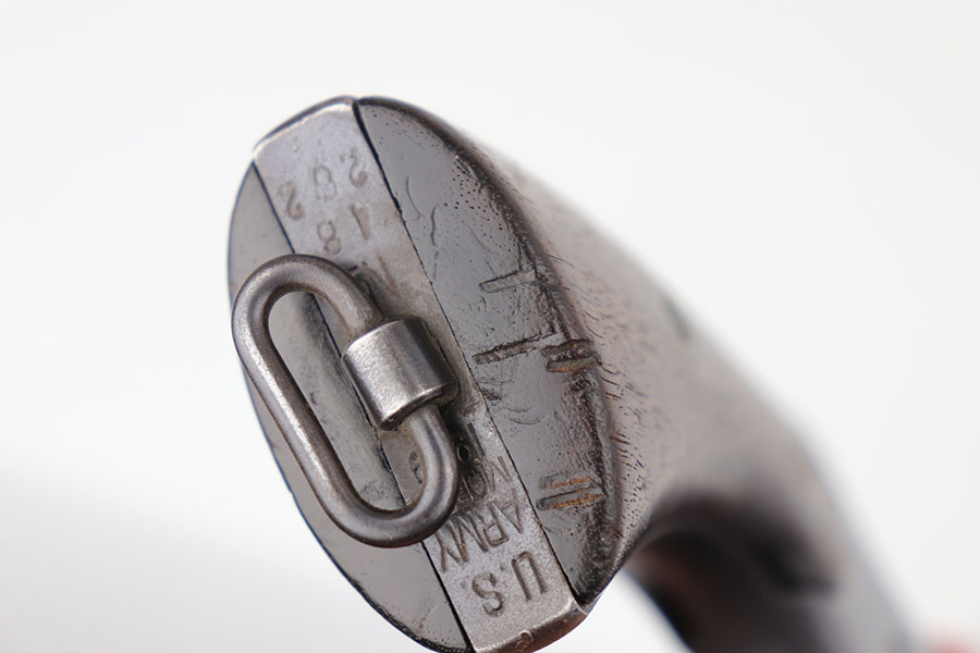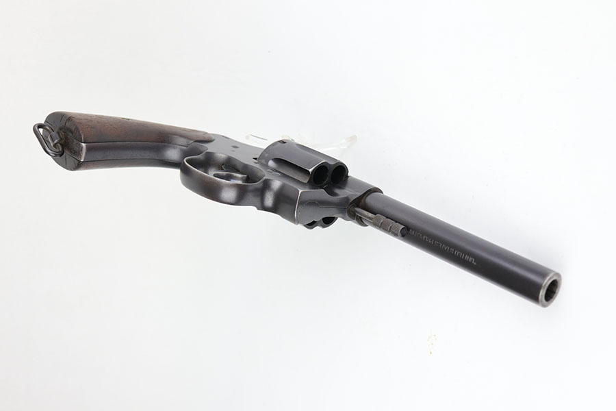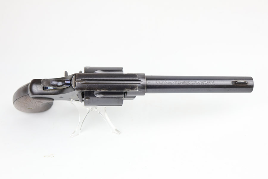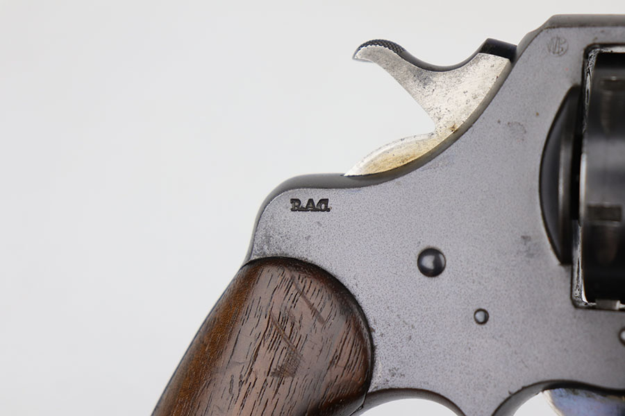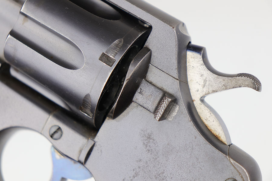 7/14/20 – This is a scarce Colt Army Model 1909 revolver that was produced in 1911. Beginning in 1899, combat reports from the Philippines campaign showed that the .38 caliber bullets repeatedly failed to stop Moro fighters, even when shot multiple times at close range. The complaints caused the U.S. Army to hurriedly re-issue the now retired .45 caliber Colt Single Action Army revolvers with newly shorten 5½” barrels. These old war horses handily stopped the kris and bolo wielding fighters and played a central role in the Army’s decision to replace the M1892 with the .45 caliber New Service revolver in 1909, and also played a key role in the Army’s decision to adopt the .45 ACP M1911 Colt pistol. This particular example is original with RAC inspector marks on both grip panels, the frame, cylinder and barrel. Barrel is also United States Property marked on the underside. The profile shows minimal finish loss but does have some oxidation throughout. The rest of the bluing loss is on the grip frame. Minty bore and smooth mechanically. The grips show some scratches but no cracks or chips.