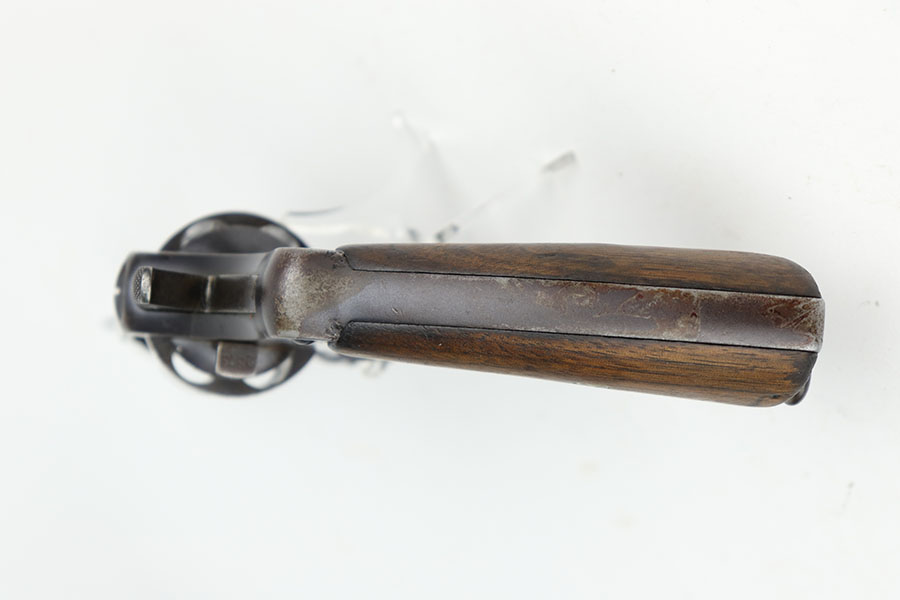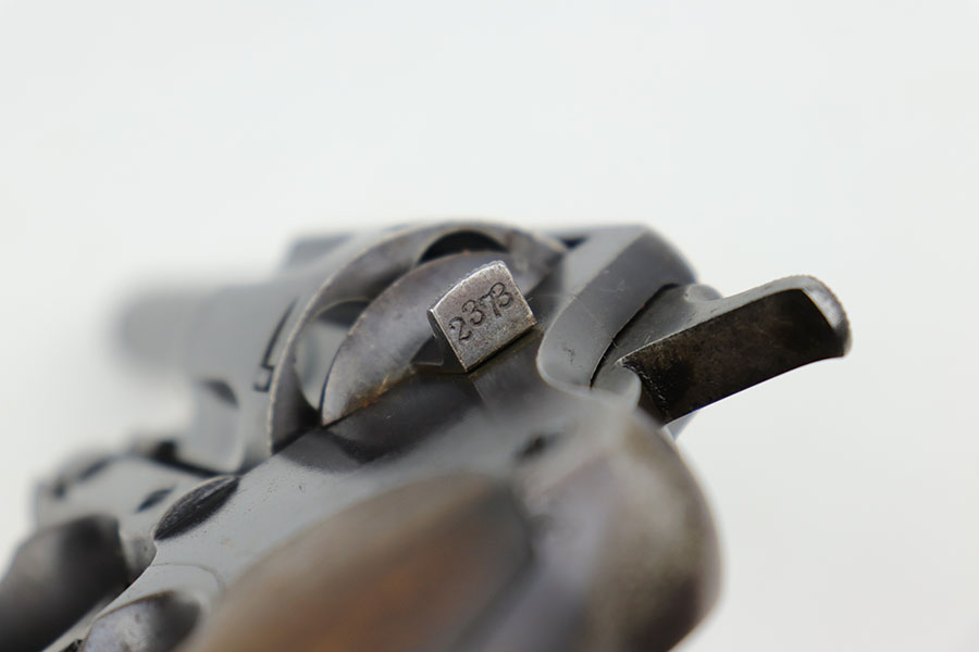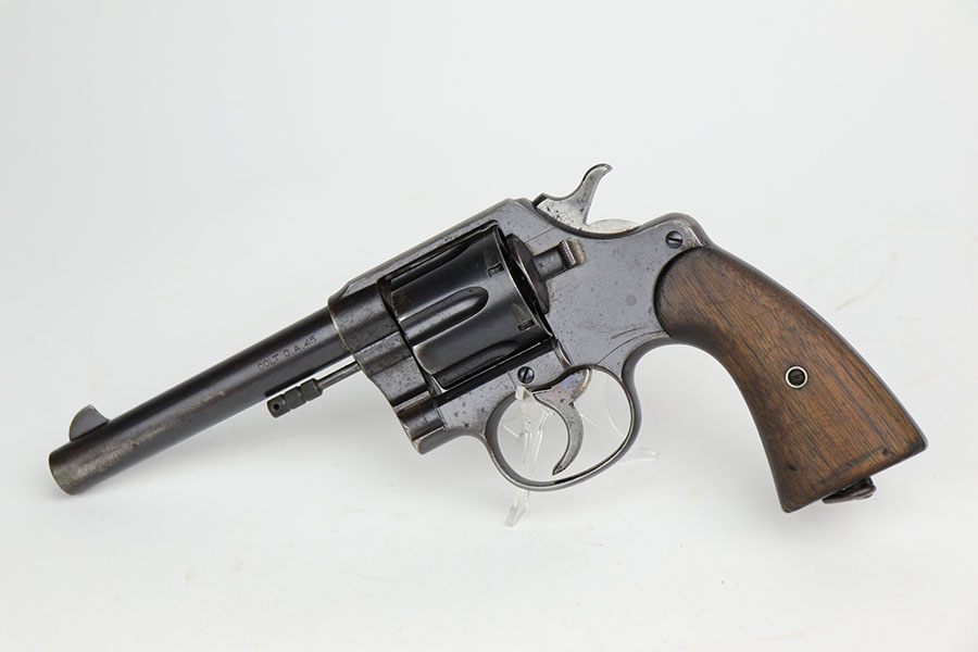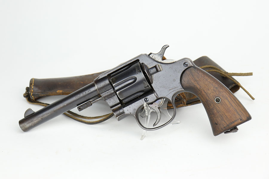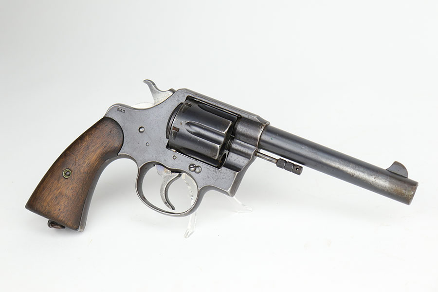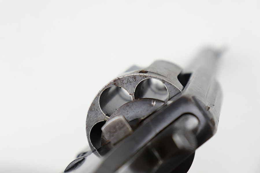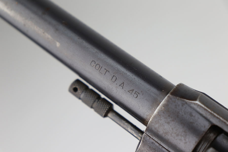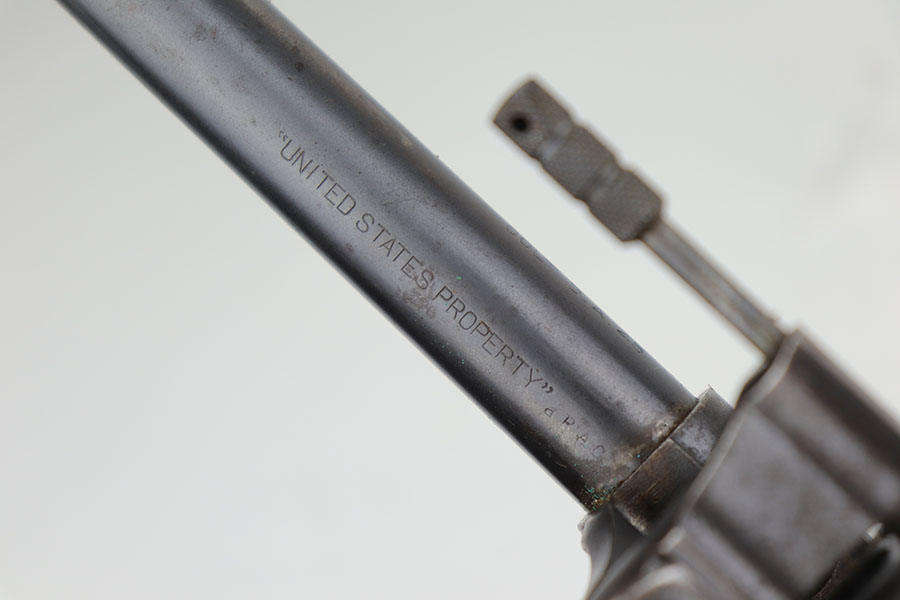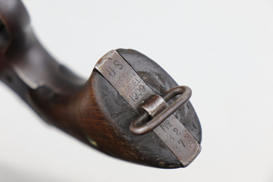 2/9/21 – This is a scarce Colt Army Model 1909 revolver that was produced in 1911. Beginning in 1899, combat reports from the Philippines campaign showed that the .38 caliber bullets repeatedly failed to stop Moro fighters, even when shot multiple times at close range. The complaints caused the U.S. Army to hurriedly re-issue the now retired .45 caliber Colt Single Action Army revolvers with newly shorten 5½” barrels. These old war horses handily stopped the kris and bolo wielding fighters and played a central role in the Army’s decision to replace the M1892 with the .45 caliber New Service revolver in 1909, and also played a key role in the Army’s decision to adopt the .45 ACP M1911 Colt pistol. This particular example is original with RAC inspector marks on the frame, cylinder and barrel. Barrel is also United States Property marked on the underside. The grips show some scratches/dings but no cracks or chips. The gun shows some obvious patina and oxidation throughout, with most of the bluing loss on the barrel and grip frame. Bore is shiny with strong rifling. The gun comes with a 1917 dated holster that is maker marked on the back, and has had the front shaved/cut.