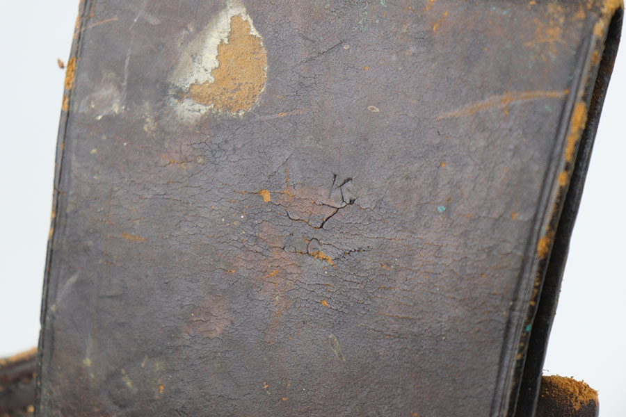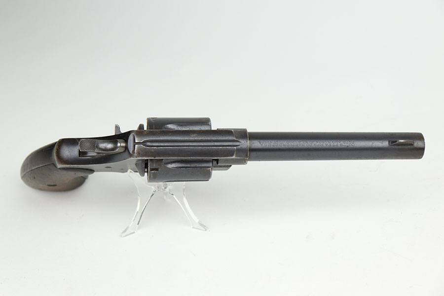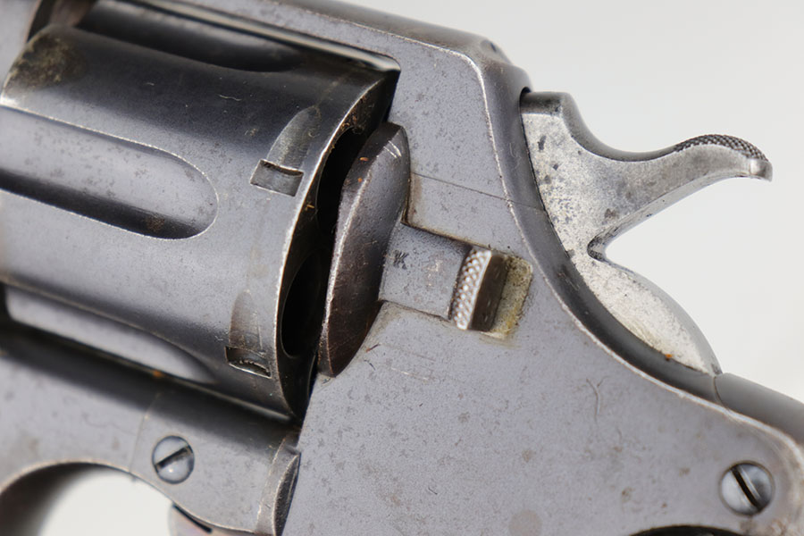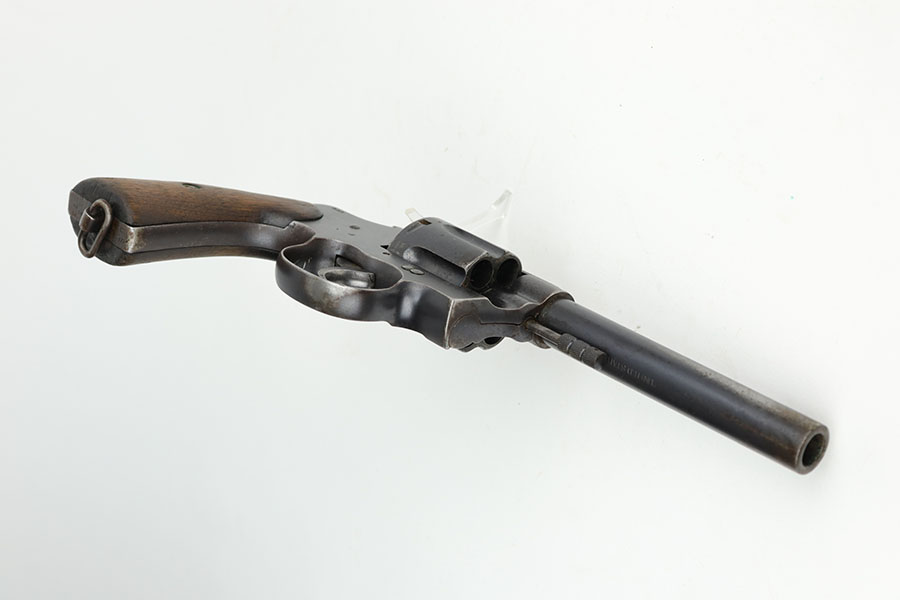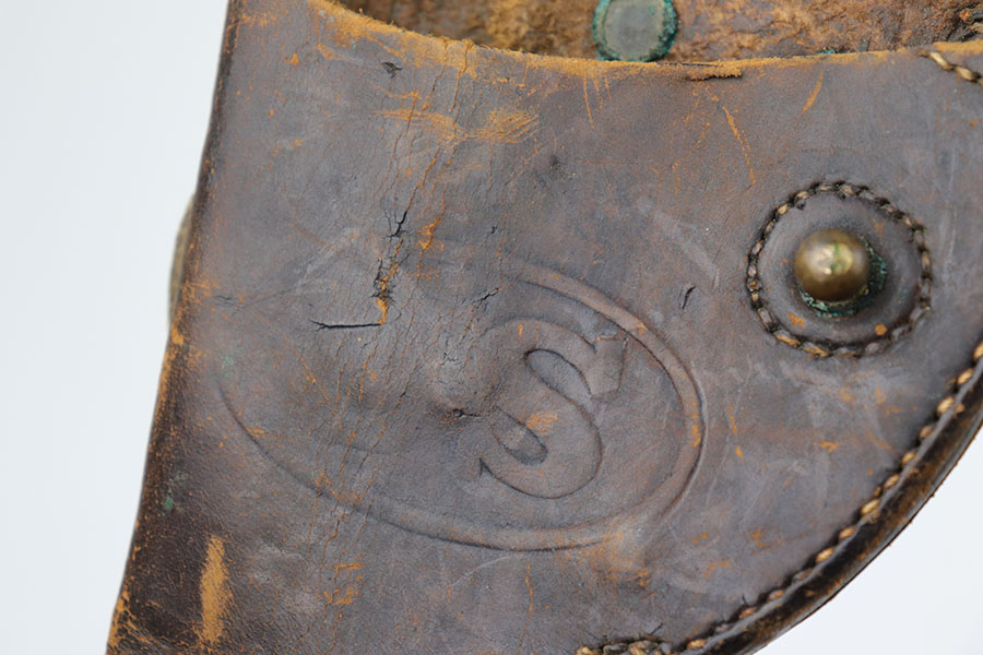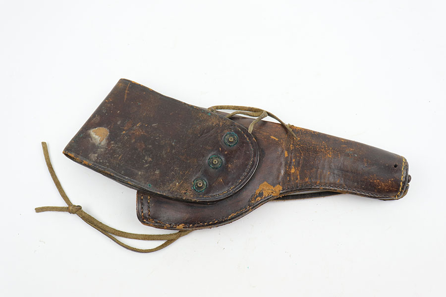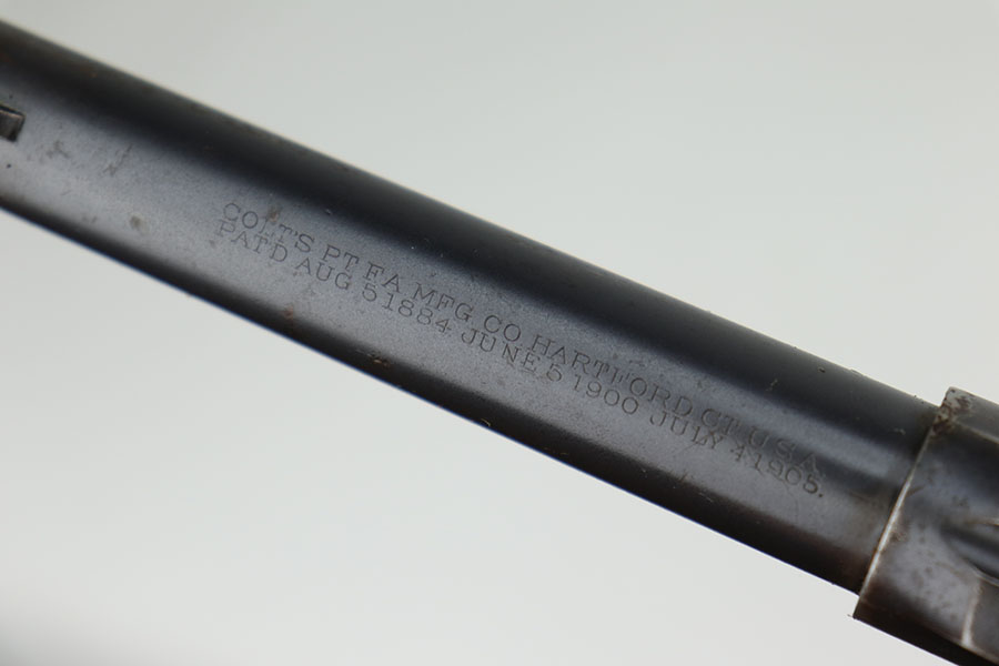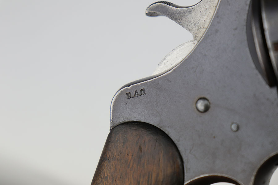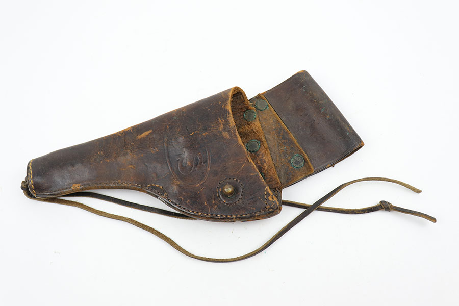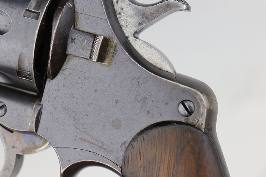 2/9/21 – This is a scarce Colt Army Model 1909 revolver that was produced in 1911. Beginning in 1899, combat reports from the Philippines campaign showed that the .38 caliber bullets repeatedly failed to stop Moro fighters, even when shot multiple times at close range. The complaints caused the U.S. Army to hurriedly re-issue the now retired .45 caliber Colt Single Action Army revolvers with newly shorten 5½” barrels. These old war horses handily stopped the kris and bolo wielding fighters and played a central role in the Army’s decision to replace the M1892 with the .45 caliber New Service revolver in 1909, and also played a key role in the Army’s decision to adopt the .45 ACP M1911 Colt pistol. This particular example is original with RAC inspector marks on the frame, cylinder and barrel. Barrel is also United States Property marked on the underside. The grips show some scratches/dings but no cracks or chips. The gun shows some obvious patina and oxidation throughout, with most of the bluing loss on the barrel and grip frame. Bore is shiny with strong rifling. The gun comes with a 1917 dated holster that is maker marked on the back, and has had the front shaved/cut.